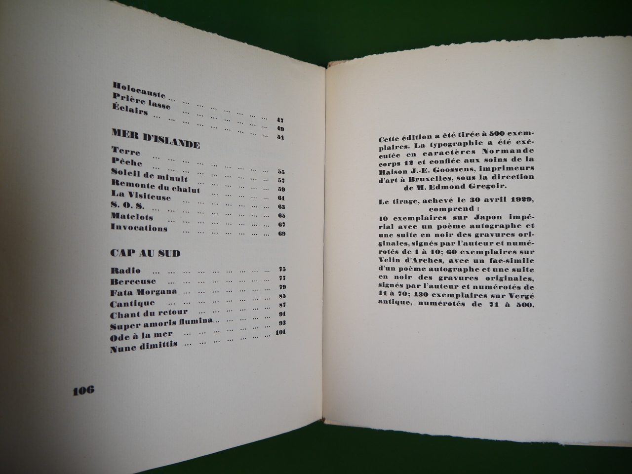 « Avec une lettre de Roland Dorgelès et des bois de l’auteur. » Tirage à 500 exemplaires. La maison de la Poésie présente l’auteur: « José Gers est une exception dans la poésie de Belgique: son oeuvre tout entière est consacrée à la louange de la mer. Il se peut que sa maîtrise laisse à désirer; ses évocations n’en sont que plus vraies et plus pénétrantes: ce navigateur a su dire toute la grandeur, toute l’ivresse et toute la mélancolie des escales, des départs, des aventures sans lendemain. »