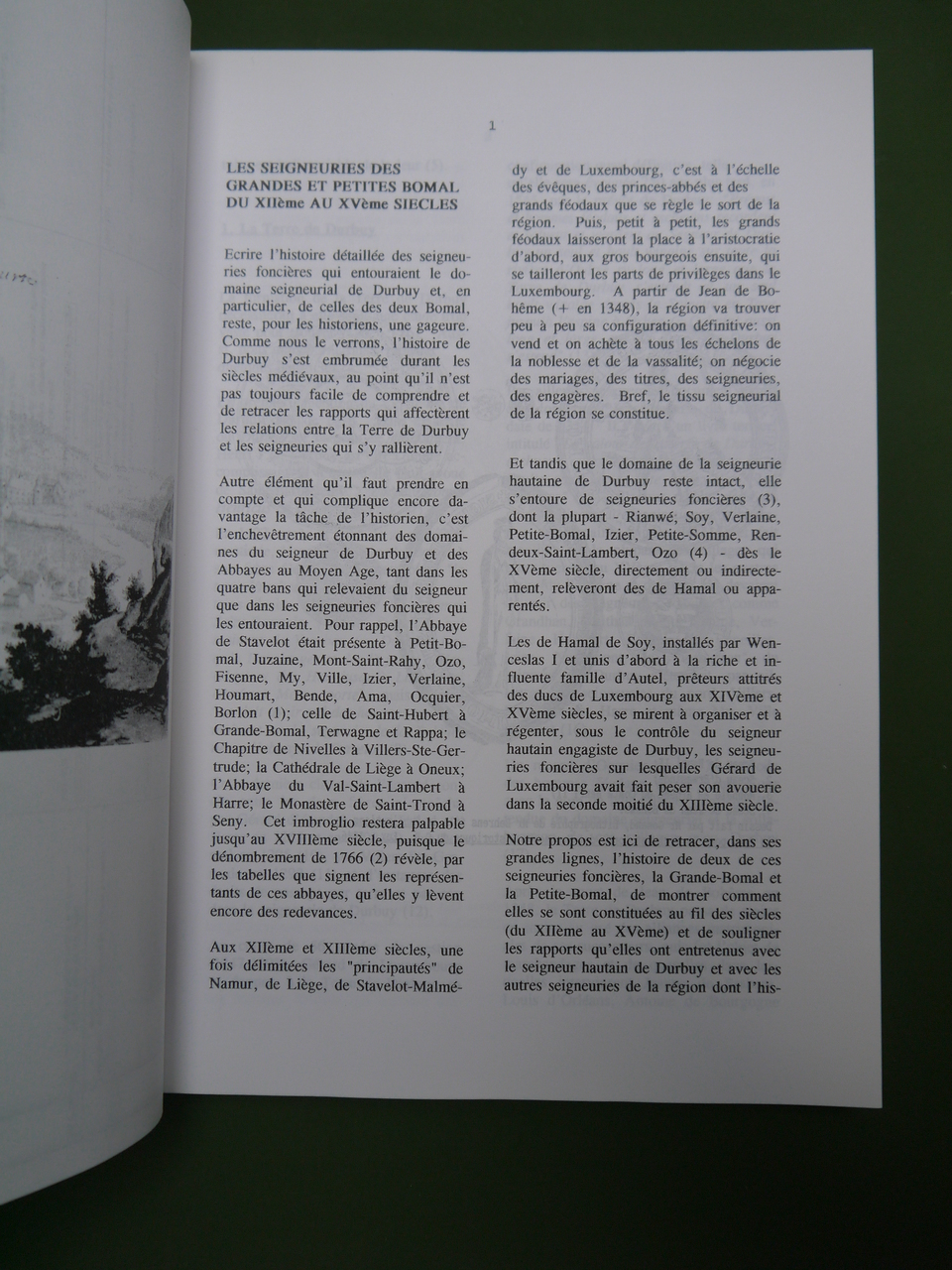 Weris se situe à proximité de Barvaux et Durbuy, en province de Luxembourg. Au menu: Les seigneuries des Grande et Petite Bomal du XIIème au XVème siècle, Le château fort de Logne (Province de Liège, commune de Ferrières), Durbuy et Marche, deux villes luxembourgeoises au sort peu semblable, A propos du château de Durbuy, L’ancienne halle de Durbuy, Deux églises romanes dans le comté de Durbuy, Les Templiers en Famenne, Survol historique de l’armement au Moyen Age, Le pays de l’art mosan, La cuisine et la table au Moyen Age, La vie musicale au Moyen Age, La céramique médiévale. Technique de fabrication et utilisation, Bref historique des grès rhénans, L’étude de l’histoire par la figurine