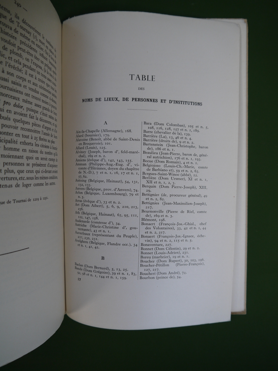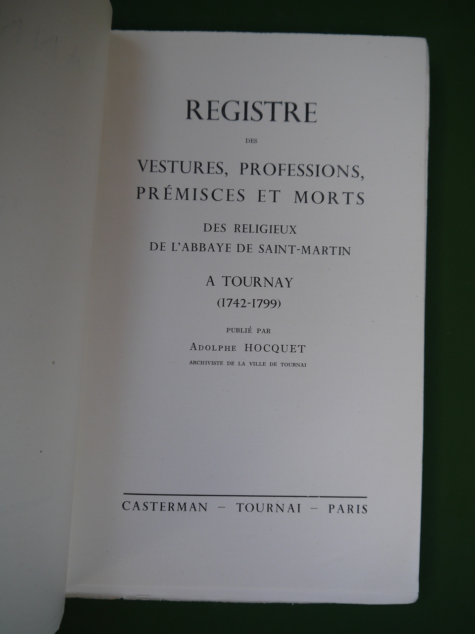 Un seul thème dans ce volume: « Registre des vestures, professions, prémisces et morts des religieux de l’abbaye de Saint-Martin à Tournay (1742-1799) », signé Adolphe Hocquet.