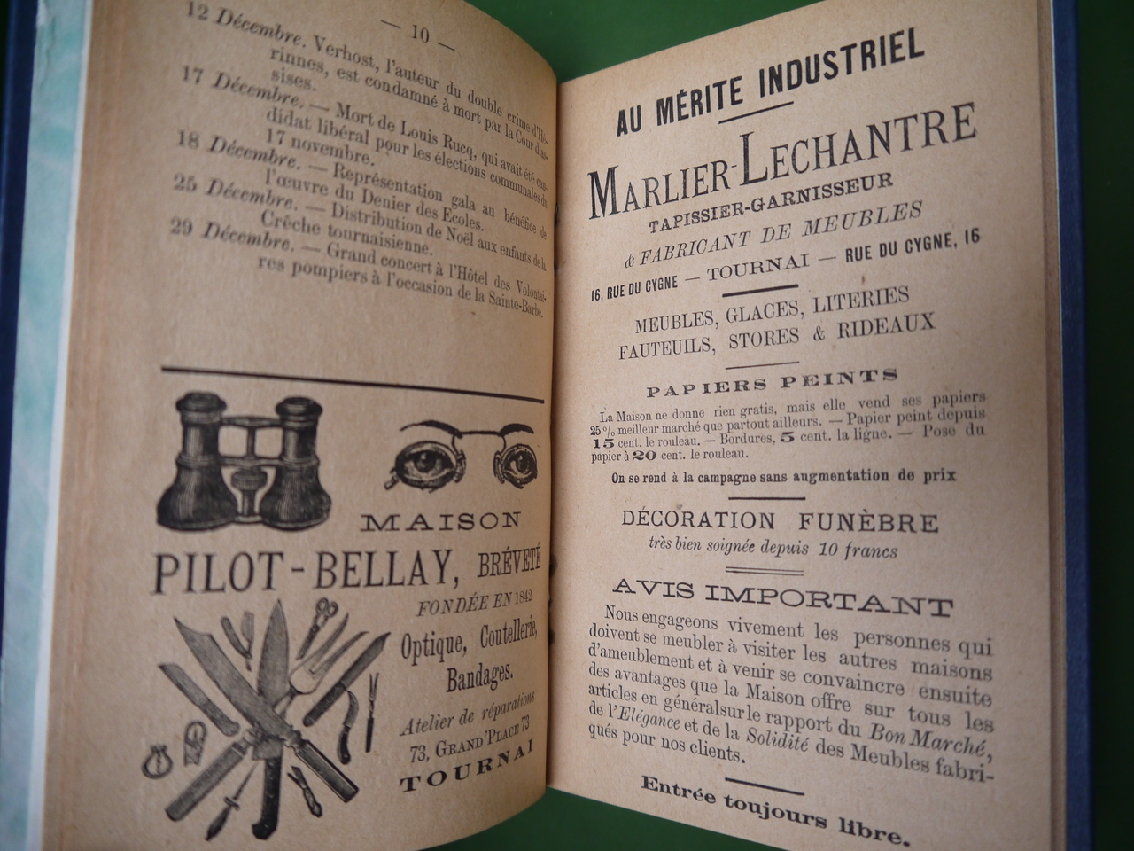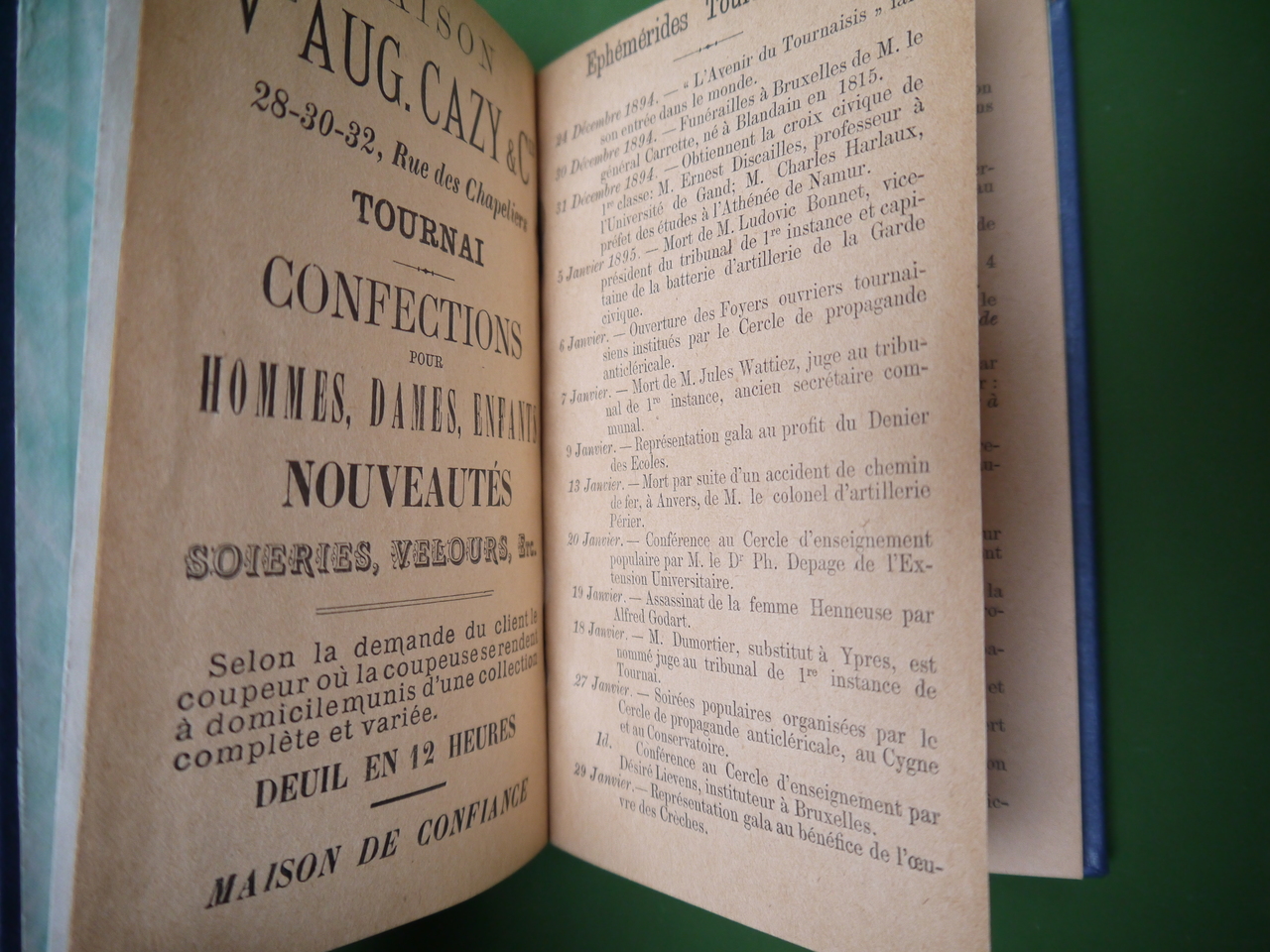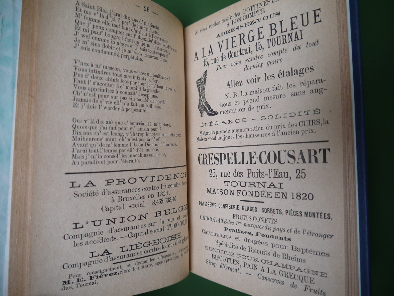 Divers textes dintérêt général, des publicités, un article sur l’essor local du vélo, des textes et chansons signés Franz Foulon ou Jean Dupré de Courtray… 72 pages élégamment reliées.