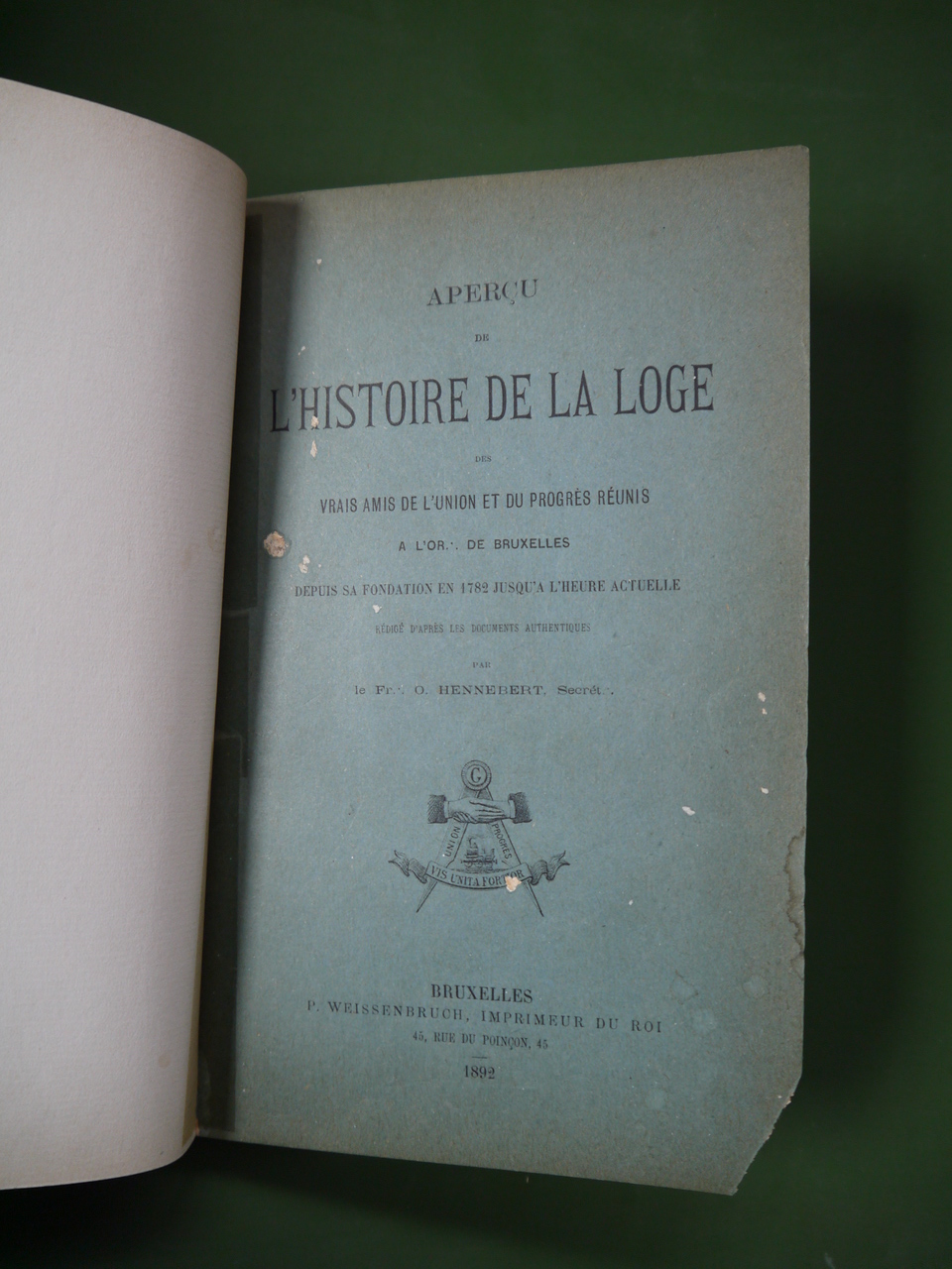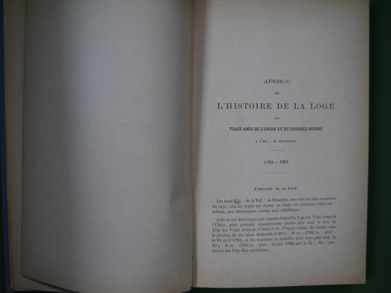 Sous la même reliure figurent le titre mentionné ci-dessus, plus le « Tracé de la célébration du centenaire »… plus encore quelques notes manuscrites. Il s’agit semble-t-il de la plus ancienne loge bruxelloise.