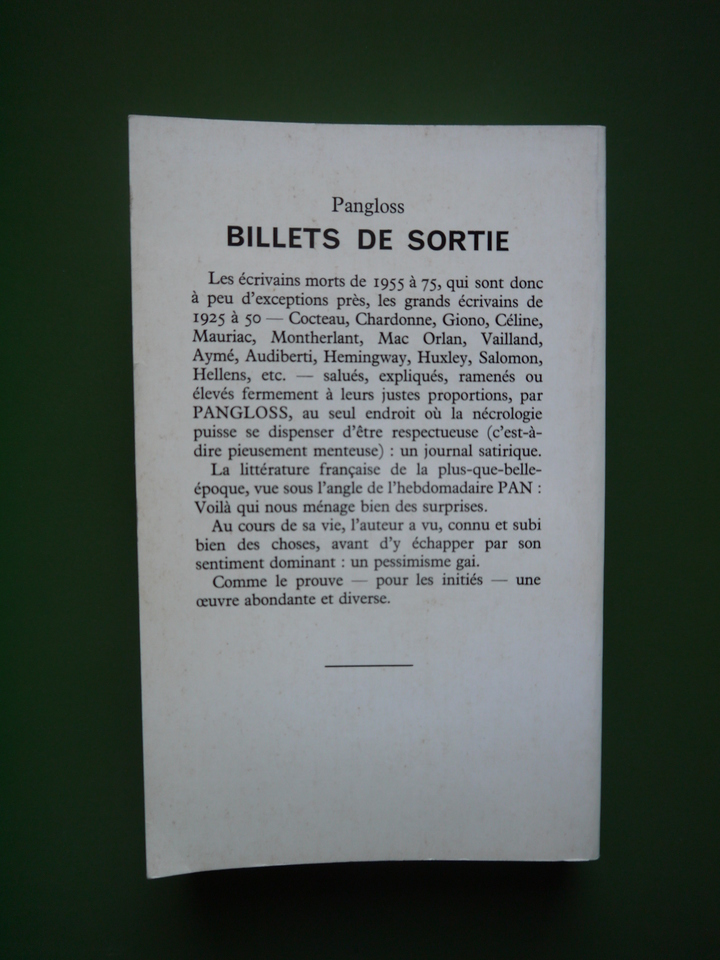 L’hebdomadaire Pan a eu beaucoup de vies. Le présent ouvrage est une compilation de notices nécrologiques d’écrivains fameux parues dans Pan entre 1958 et 1975. Quant à l’identité réelle de l’auteur… il semble qu’il s’agisse de Robert Poulet, journaliste condamné à l’exil à la Libération.