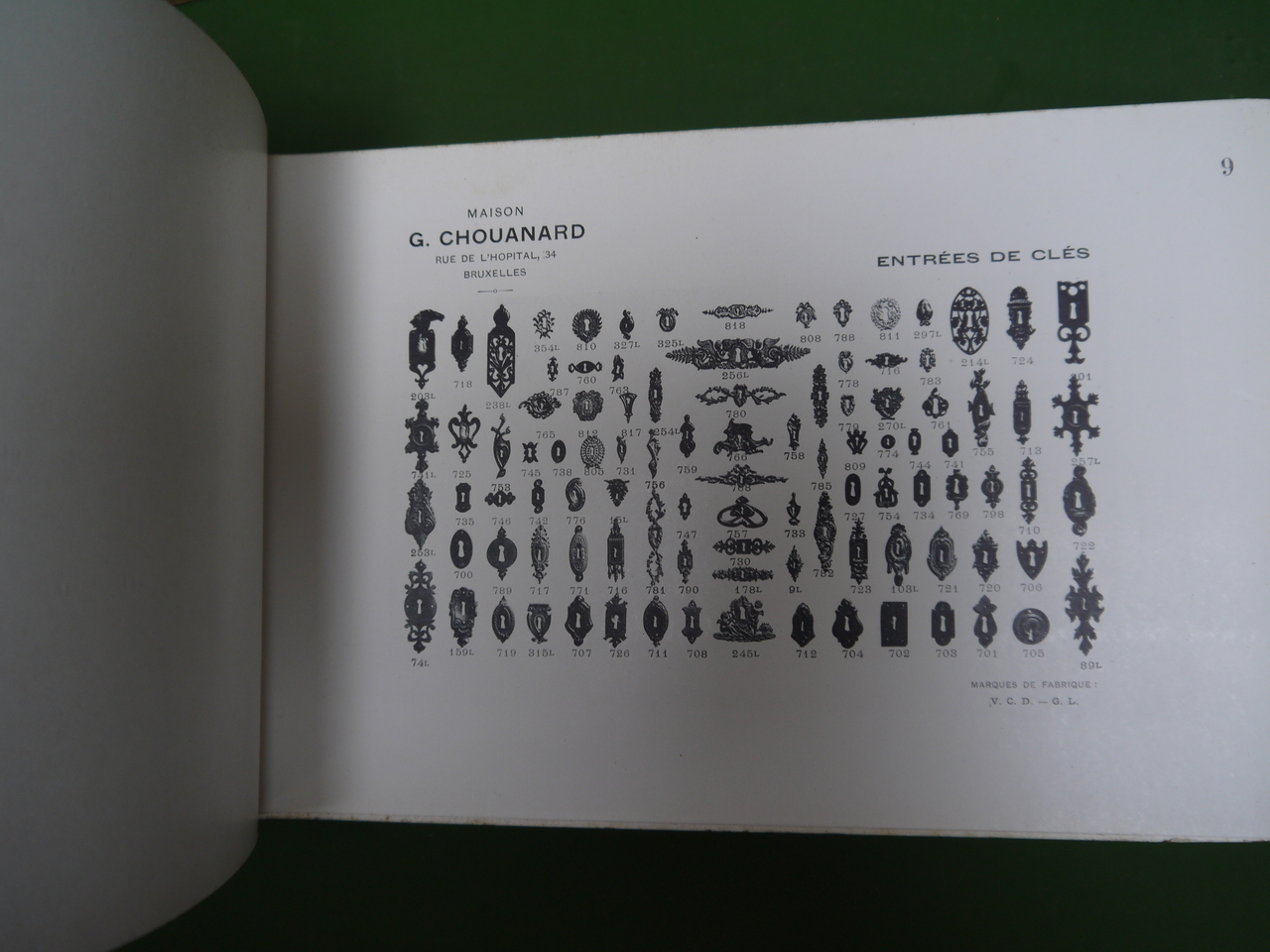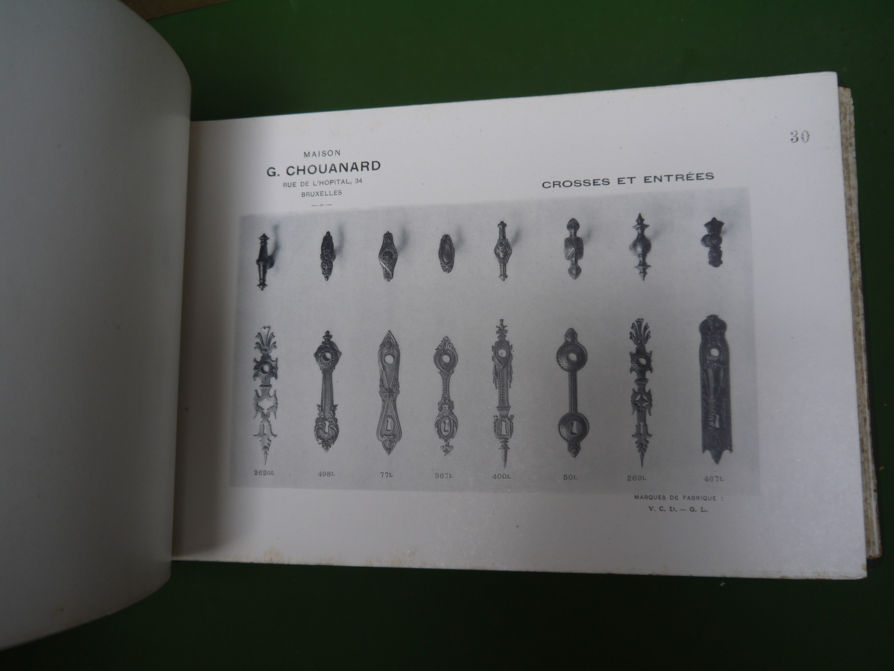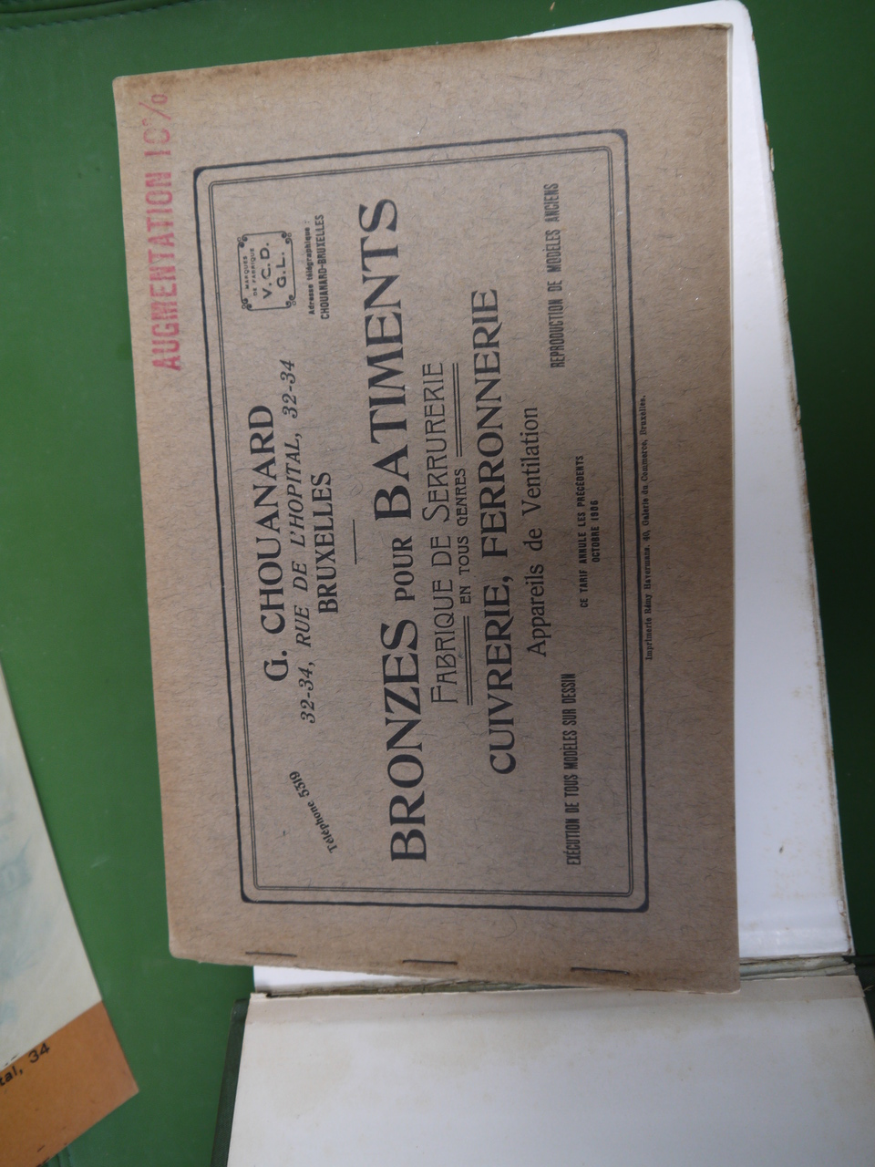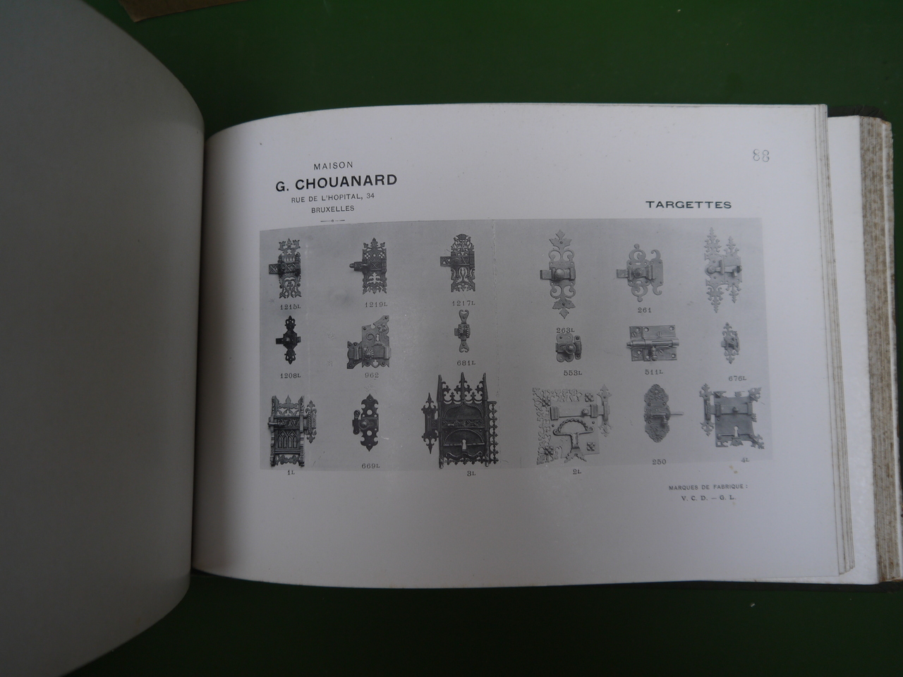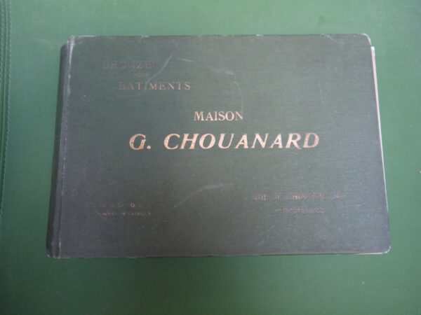 137 planches de « bronzes pour bâtiments » proposés sous les marques « V.C.D. – G.L. » par la maison Chouanard, sise rue de l’hôpital 34, à Bruxelles; on y trouve « rosaces, entrées de clés, crosses et entrées, poignées à poucier, pompes de fenêtres, paumelles »… et bien d’autres choses encore. Joints au catalogue, un courrier, un supplément « serrurerie » de 68 pages (serrures, charnières, roulements à billes…) et un tarif daté de octobre 1906.