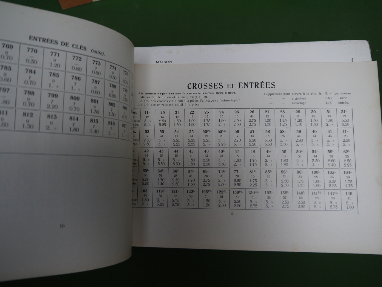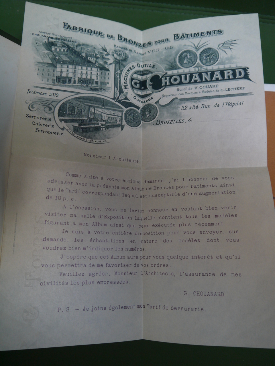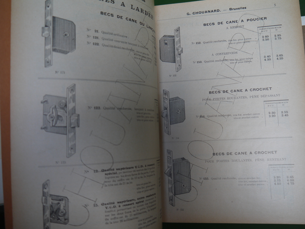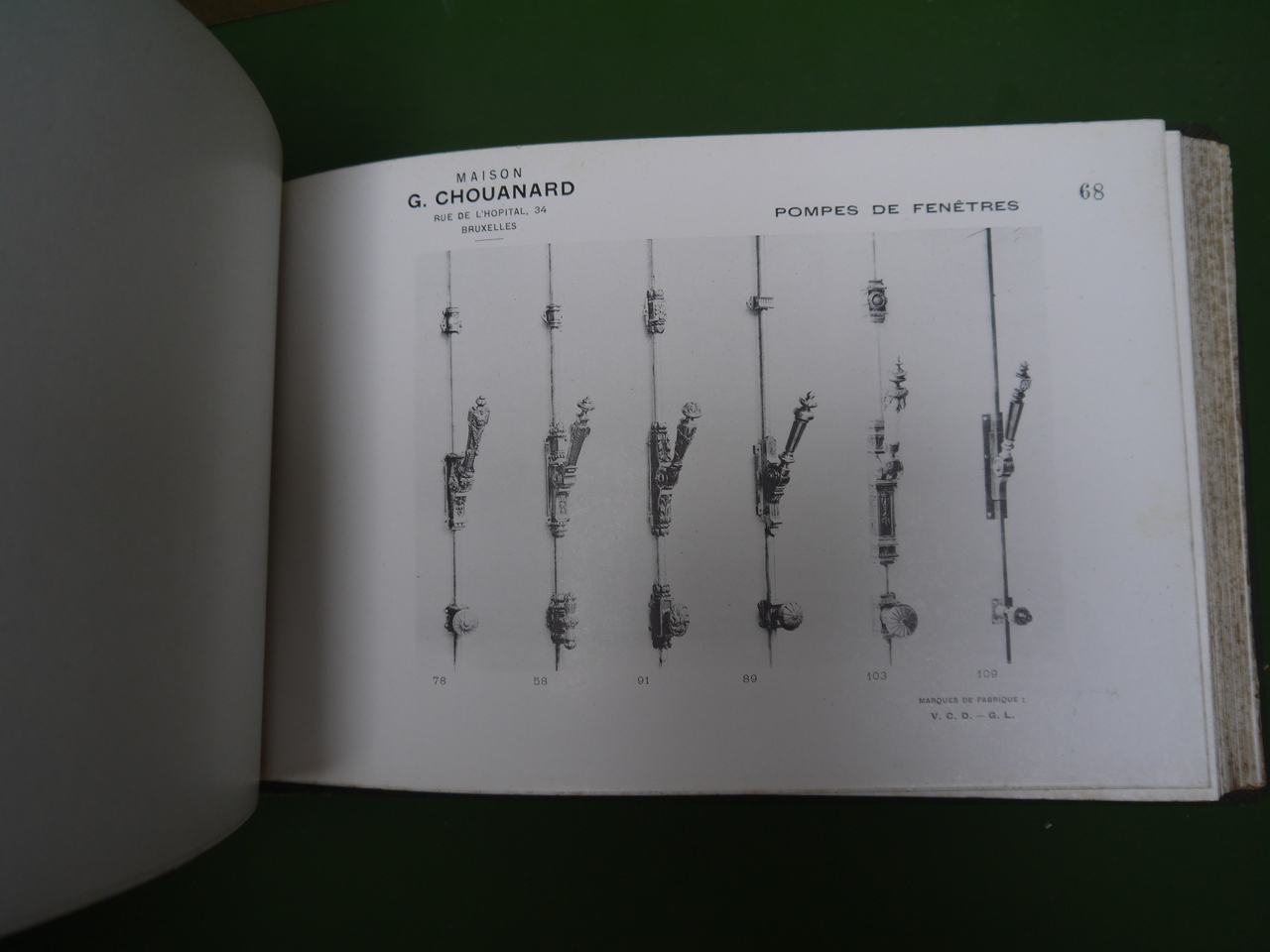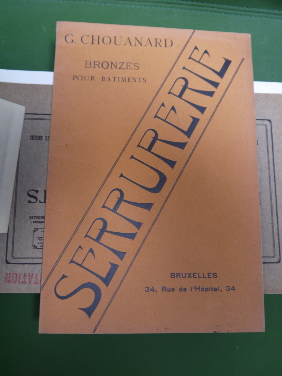 137 planches de « bronzes pour bâtiments » proposés sous les marques « V.C.D. – G.L. » par la maison Chouanard, sise rue de l’hôpital 34, à Bruxelles; on y trouve « rosaces, entrées de clés, crosses et entrées, poignées à poucier, pompes de fenêtres, paumelles »… et bien d’autres choses encore. Joints au catalogue, un courrier, un supplément « serrurerie » de 68 pages (serrures, charnières, roulements à billes…) et un tarif daté de octobre 1906.