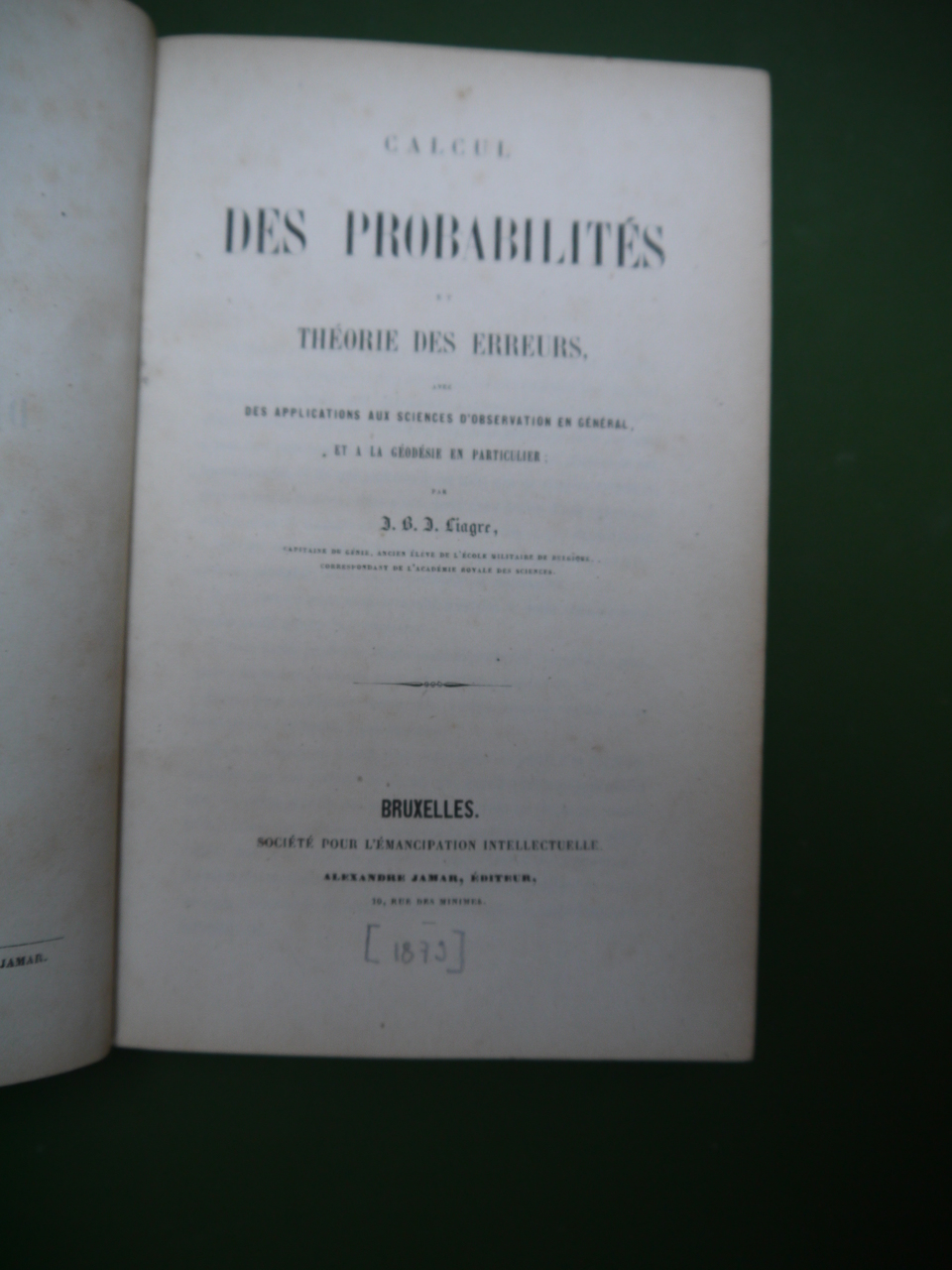 Le titre complet: » (…) avec des applications aux sciences d’observation en général et à la géodésie en particulier ». L’auteur était « capitaine du génie, ancien élève de l’école militaire de Belgique, correspondant de l’académie royale de sciences ». Parution probable en 1879, via la « Société pour l’émancipation intellectuelle ».