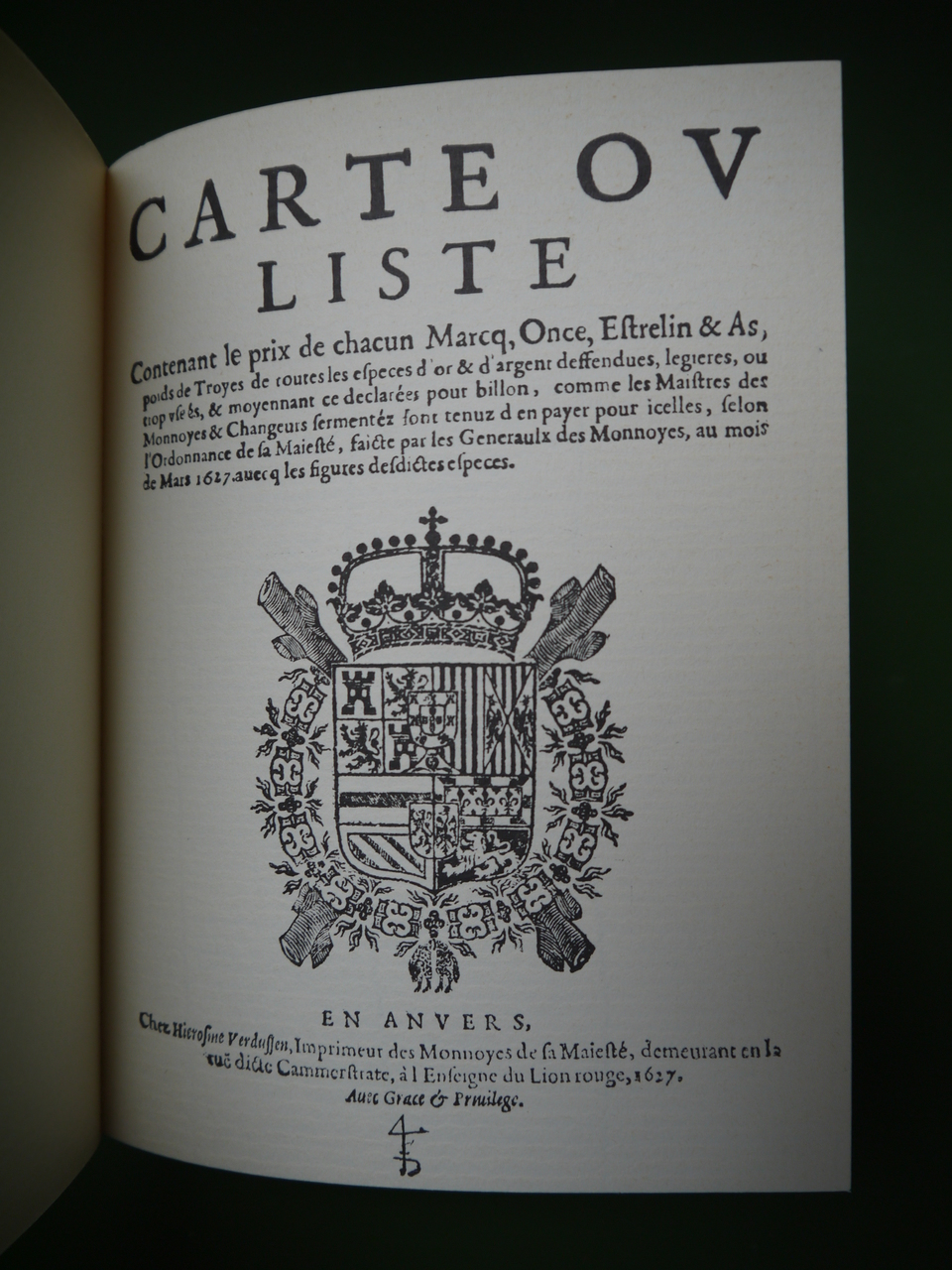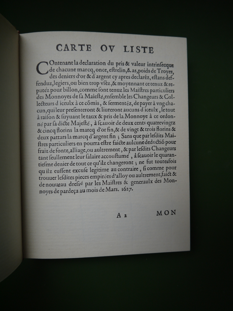« Carte ov liste contenant le prix de chacun marcq once estrelin & as poids de Troyes de toutes les espèces d’or et d’argent deffendues legieres ou trop usées & moyennant ce declarées pour billion .selon l’ordonnance de sa Majesté faicte par les Generaulx des monnoyes au mois de mars 1627. »