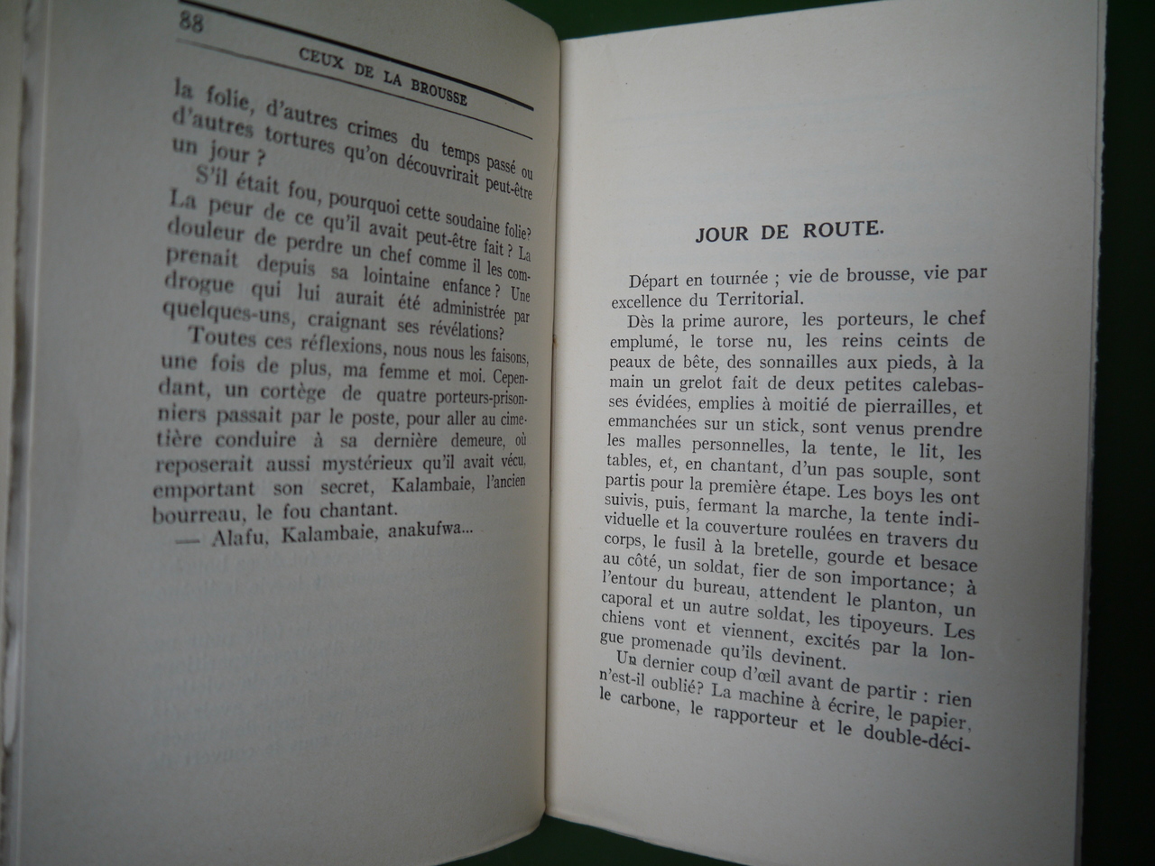 Au nombre des chapitres, citons « Jour de route », « Administration indigène », « Perception des impôts », « Ceux de la brousse »… Exemplaire non-coupé.