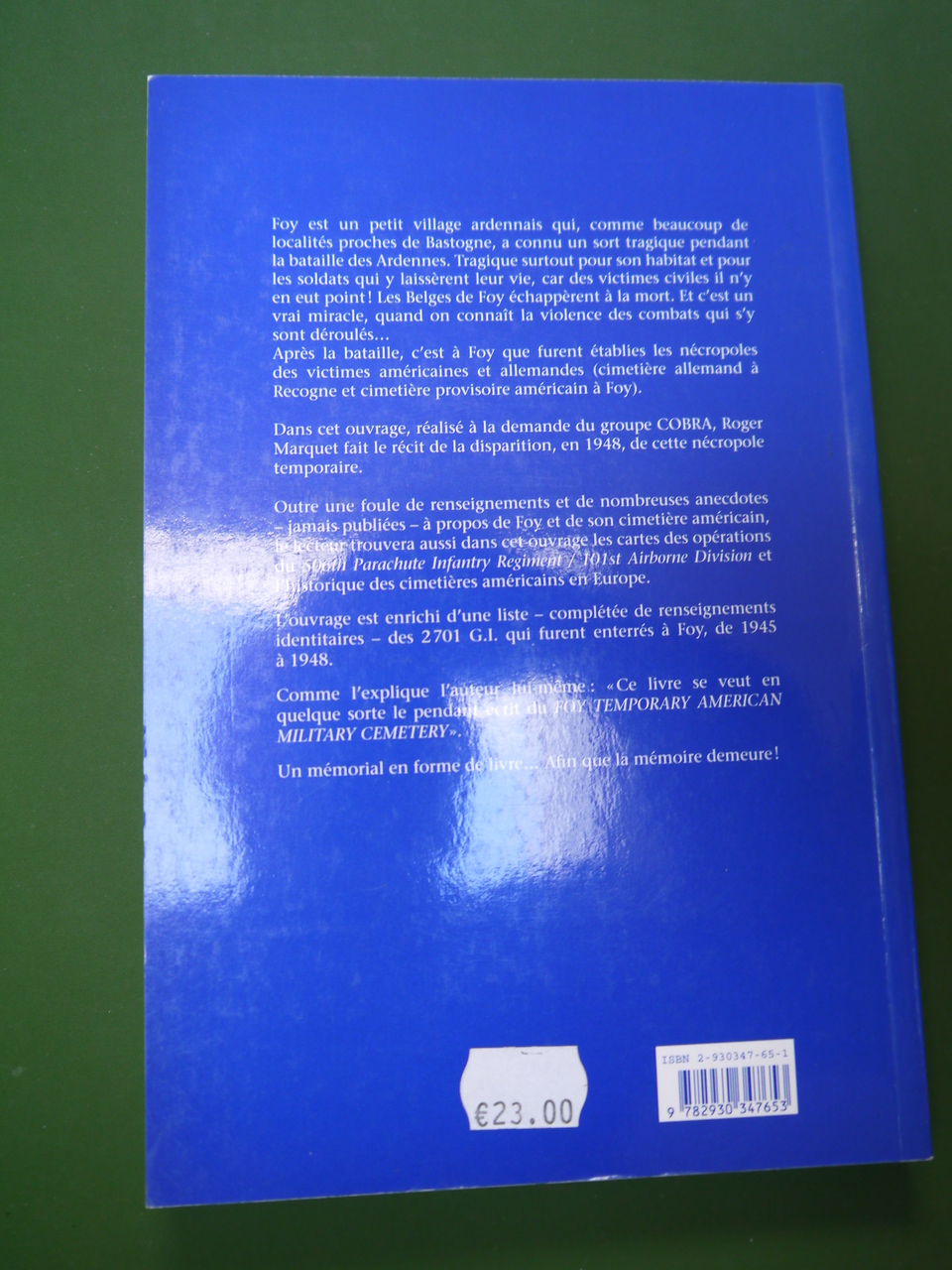 Foy est un petit village ardennais qui, comme beaucoup de localités proches de Bastogne, a connu un sort tragique pendant la bataille des Ardennes. Tragique surtout pour son habitat et pour les soldats qui y laissèrent leur vie, car des victimes civiles il n’y en eut point ! Les Belges de Foy échappèrent à la mort. Et c’est un vrai miracle, quand on connaît la violence des combats qui s’y sont déroulés… Après la bataille, c’est à Foy que furent établies les nécropoles des victimes américaines et allemandes (cimetière allemand à Recogne et cimetière provisoire américain à Foy). Dans cet ouvrage, réalisé à la demande du groupe COBRA, Roger Marquet fait le récit de la disparition, en 1948, de cette nécropole temporaire.