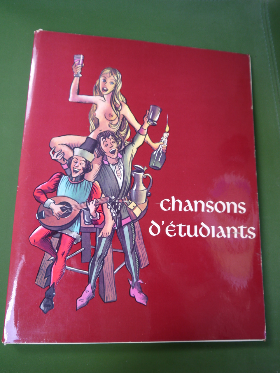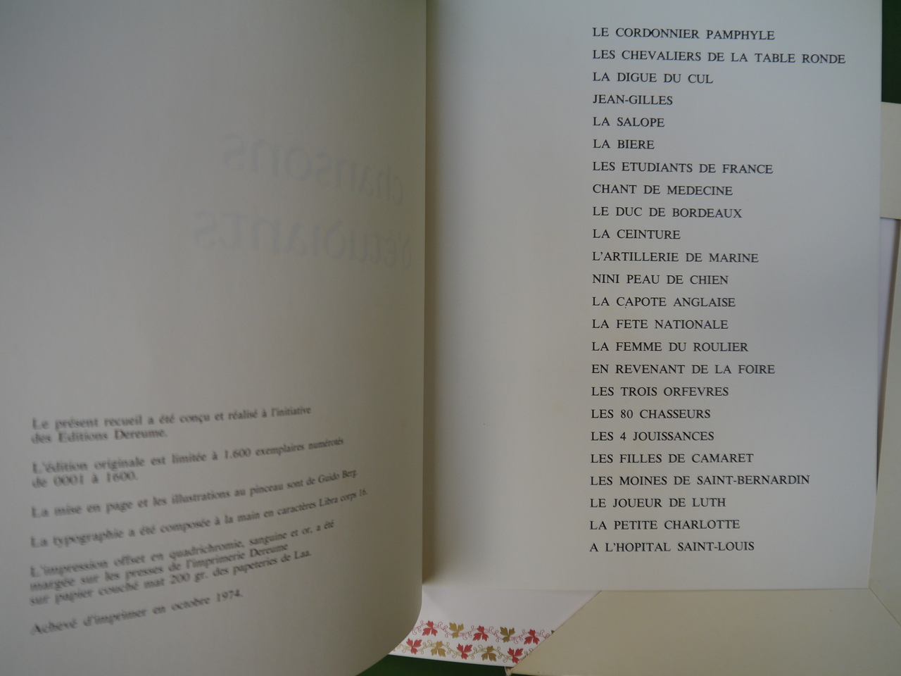 Un portfolio contenant les textes (illustrés, il va de soi) de 24 chansons paillardes, parmi lesquelles « Les filles Camaret », « La digue du cul » ou « La capote anglaise »… Illustrations de Guido Berg. Quelques légères taches sur le feuillet de présentation.
