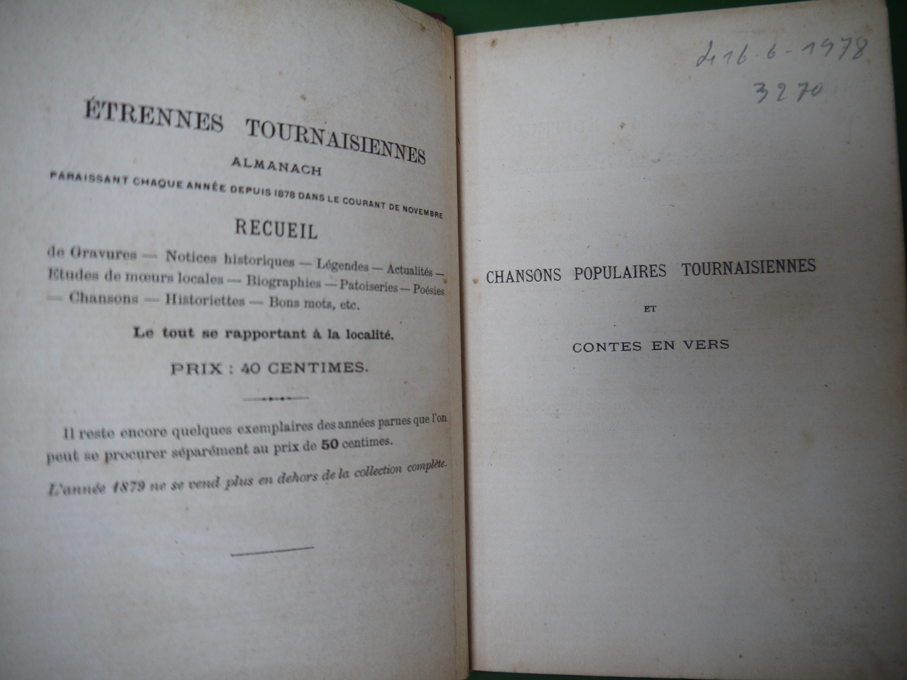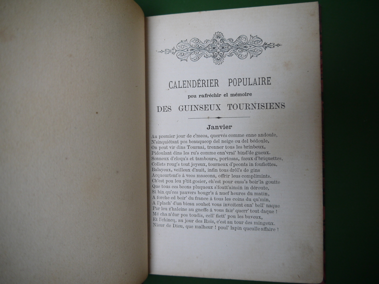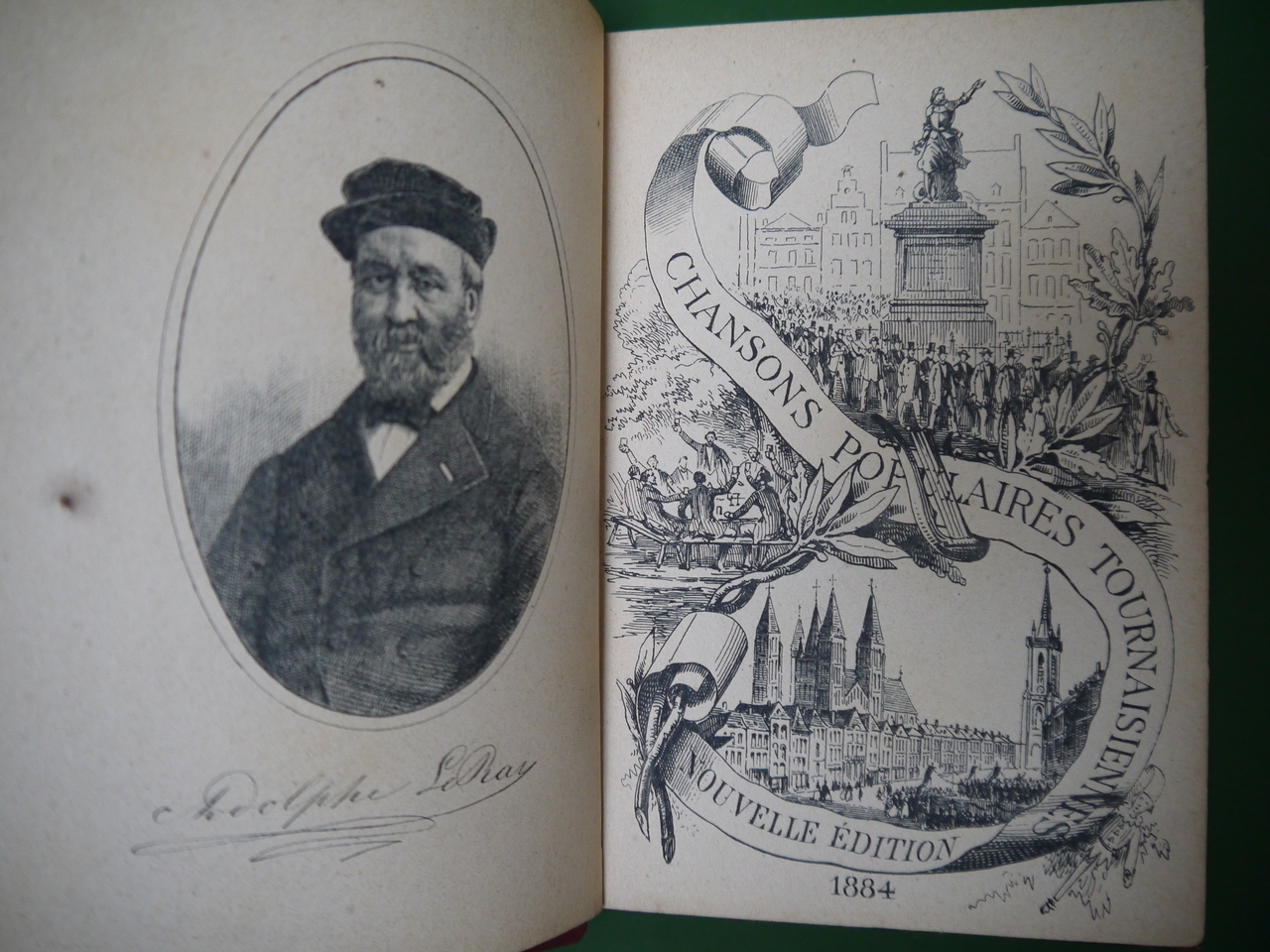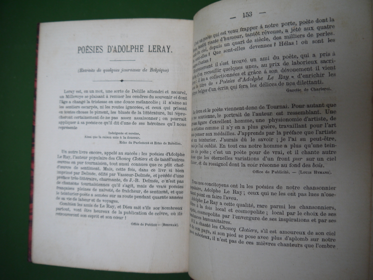 L’auteur des « Cheonq clotiers », Adolphe de Ray, dont le portrait est présent en frontispice, est décédé en 1885 – voir sa biographie (mouvementée) ici. L’éditeur de ce recueil était sans doute aussi celui des « Etrennes tournaisiennes » dont la publicité est faite en premières pages. Exemplaire joliment relié.