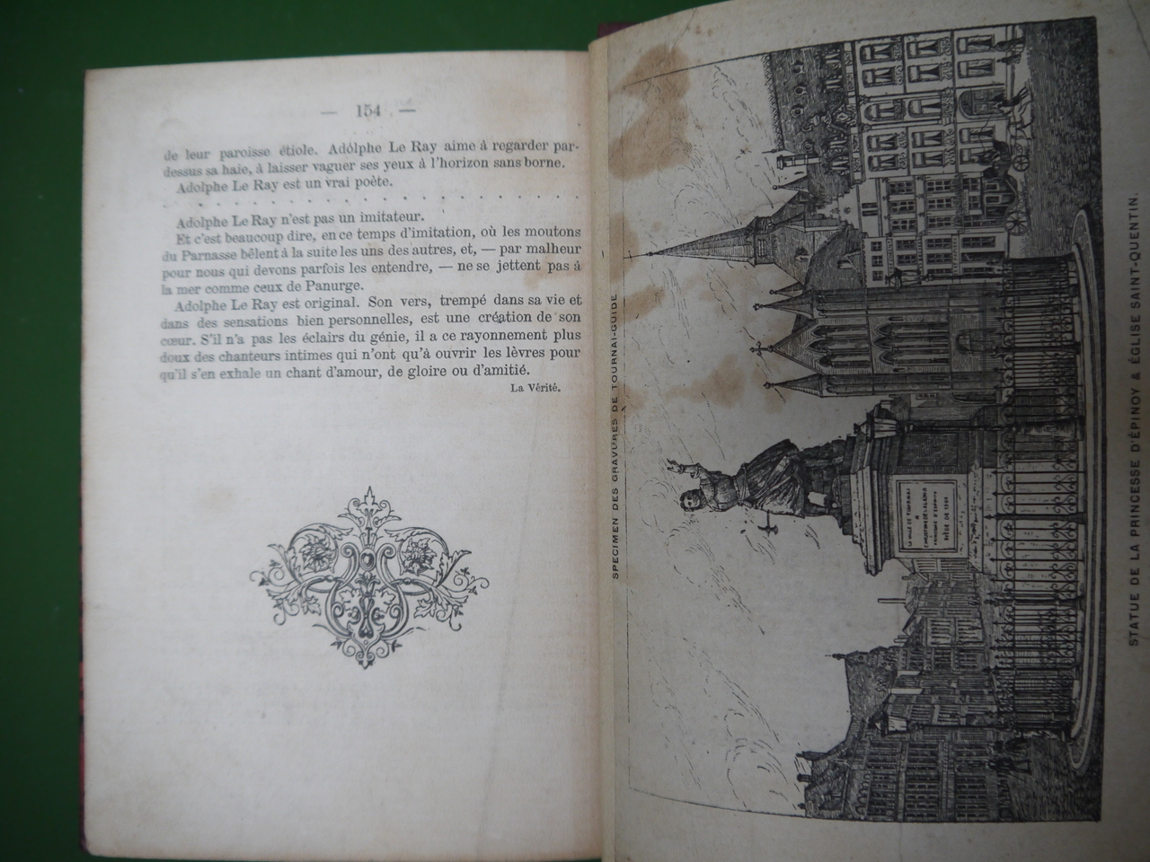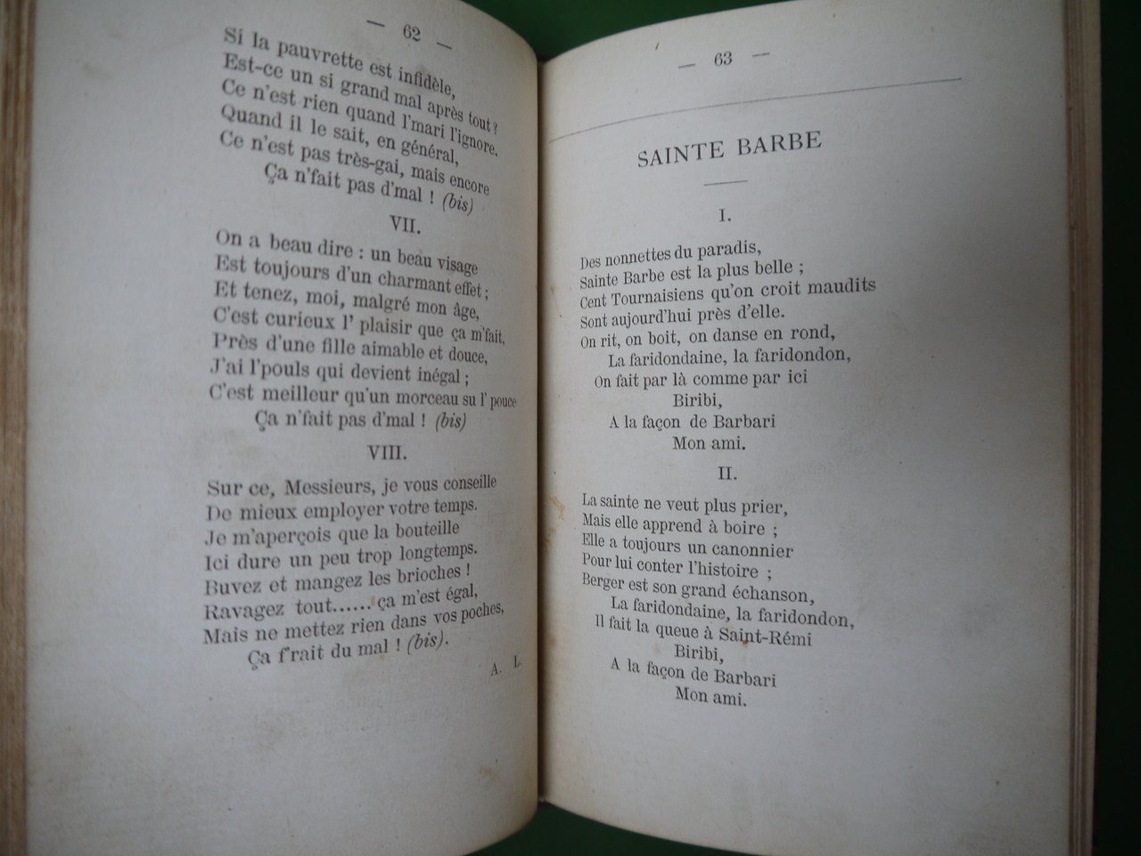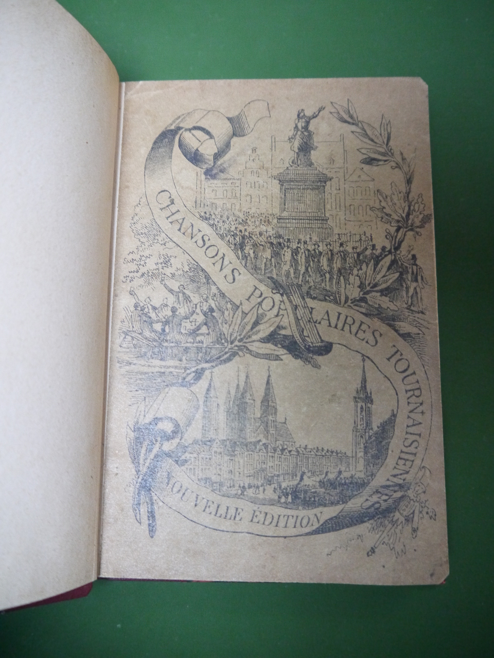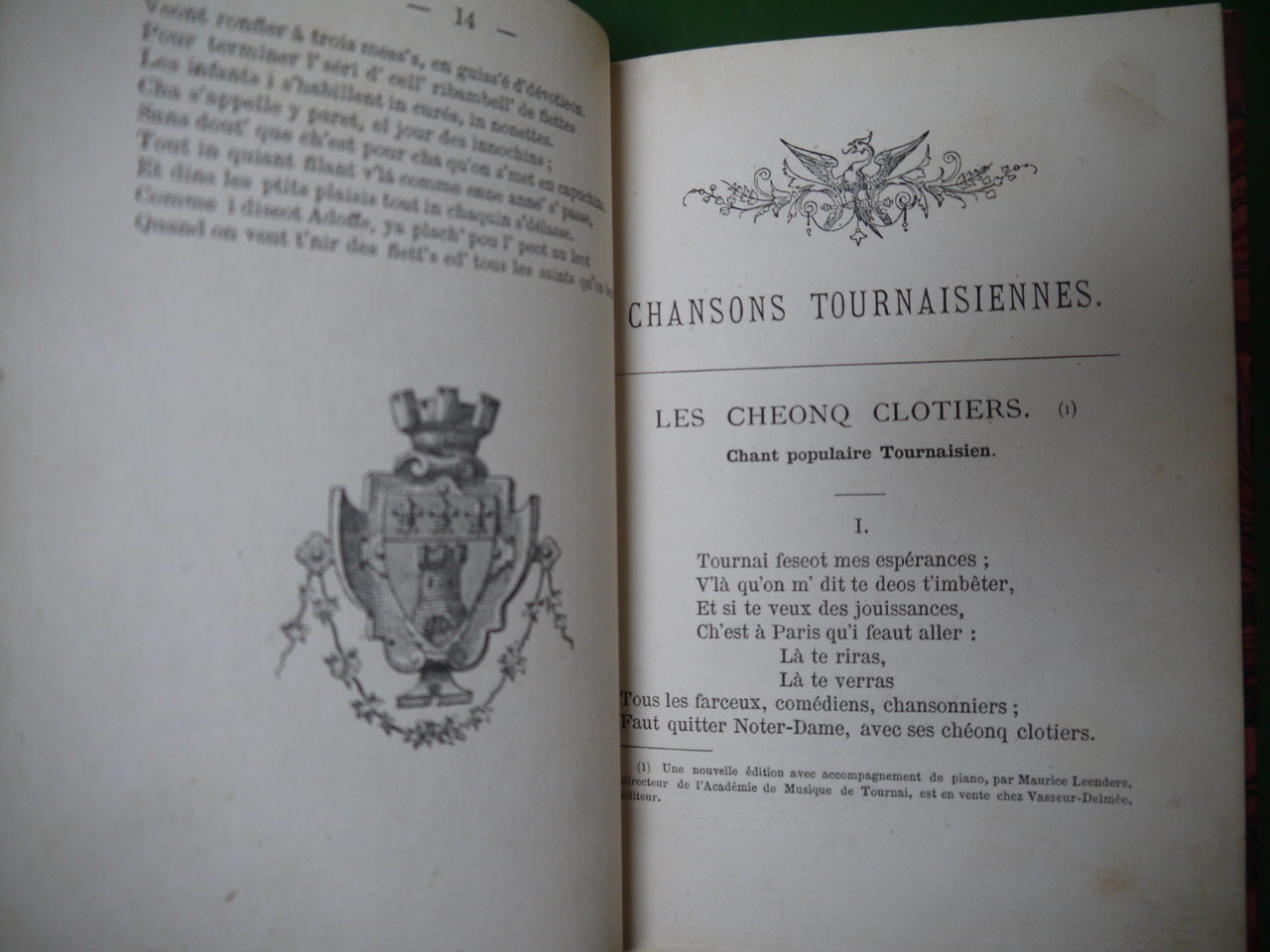 L’auteur des « Cheonq clotiers », Adolphe de Ray, dont le portrait est présent en frontispice, est décédé en 1885 – voir sa biographie (mouvementée) ici. L’éditeur de ce recueil était sans doute aussi celui des « Etrennes tournaisiennes » dont la publicité est faite en premières pages. Exemplaire joliment relié.