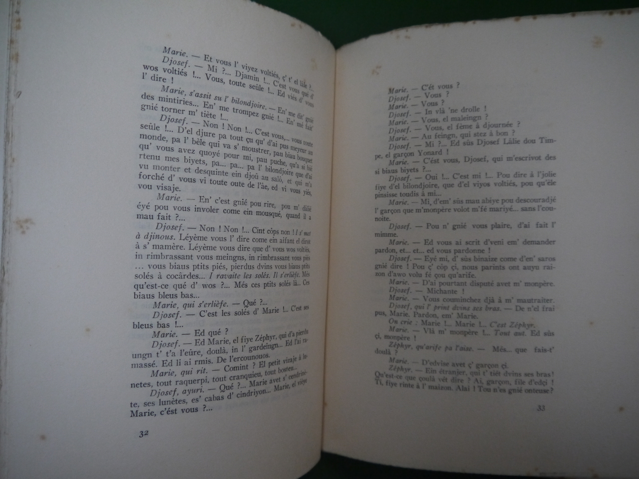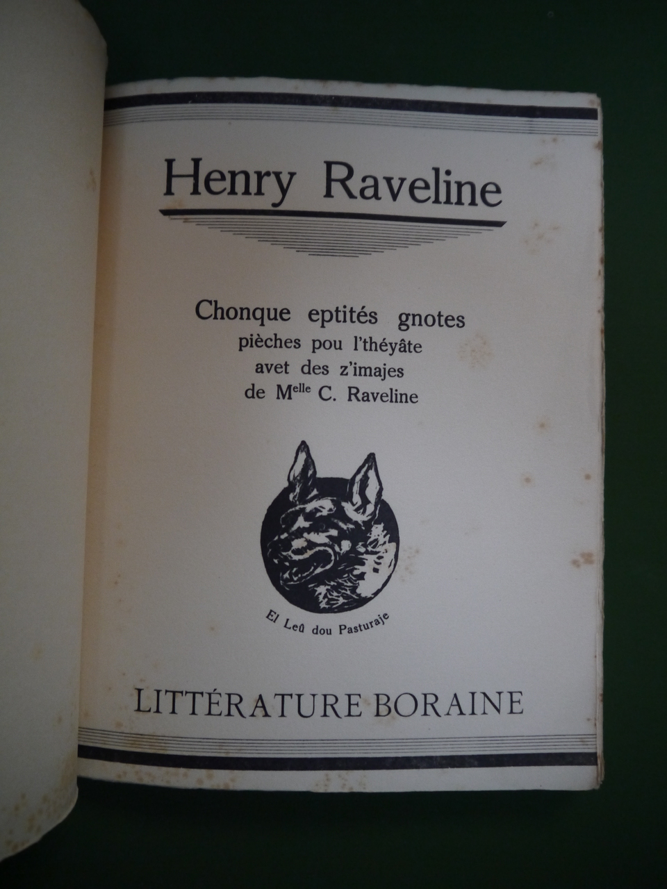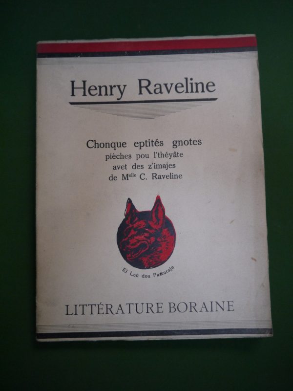5 « pièches pou l’théyâte avet des z’imajes de Melle C. Raveline » – littérature boraine ». Parution probable en 1934. L’auteur, de Pâturages, s’appelait en réalité Valentin van Hassel. Exemplaire en état moyen.
