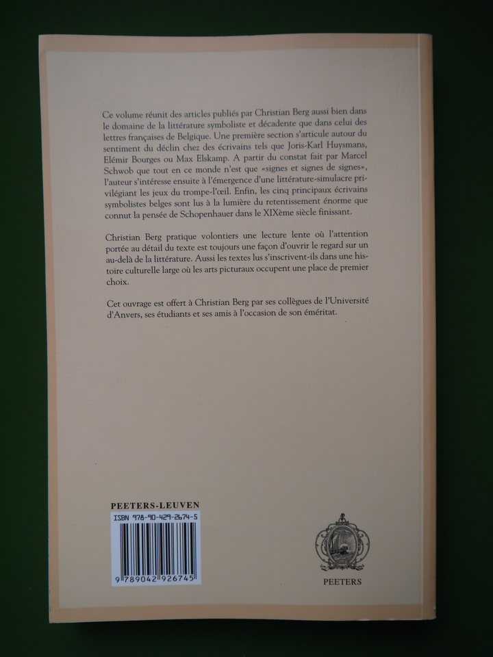 « Symbolisme et décadence à la fin di 19e siècle en France et en Belgique ». Recueil d’articles d’un professeur de l’université d’Antwerpen. Au hasard des pages sont mentionnés: Rops, Elskamp, Huysmans…