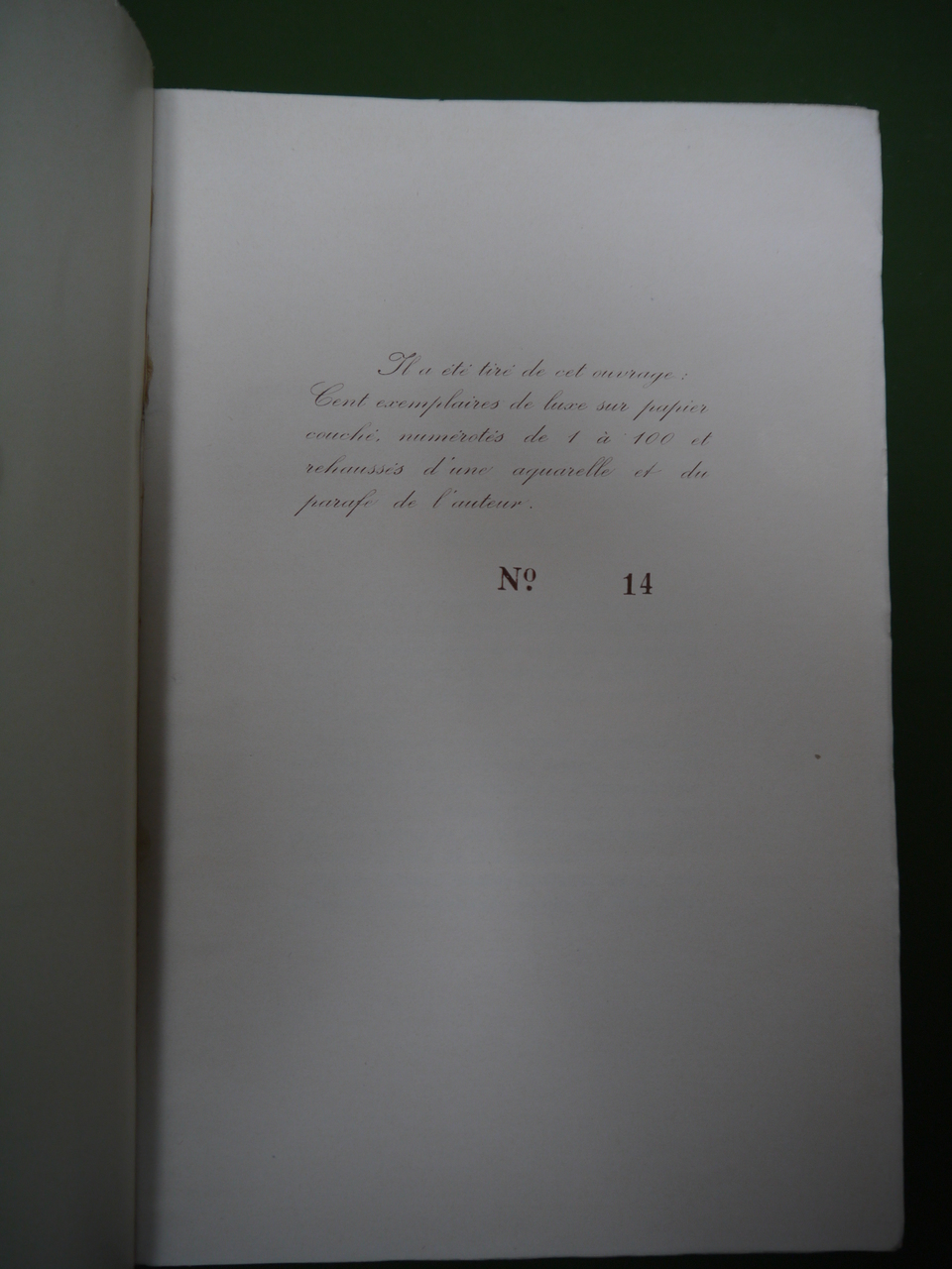 Un des 100 exemplaires numérotés et rehaussés d’une aquarelle. L’auteur est en effet plus connu comme peintre. Les récits de ce titre ont été écrits à Châtelineau et à Presles entre 1941 et 1944.