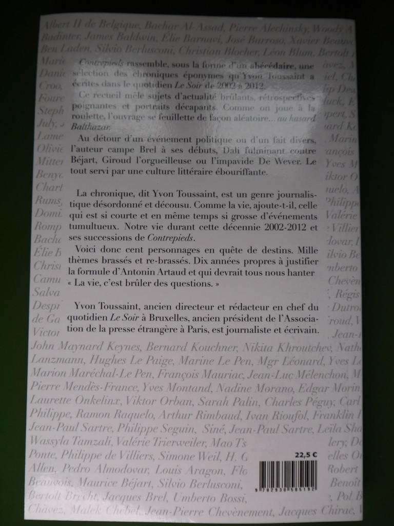 Recueil de chroniques publiées par Yvon Toussaint dans le Soir, quotidien dont il fut précédemment le rédacteur en chef.