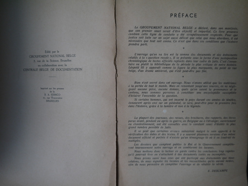 Dossier établi par des partisans de Léopold III pour défendre sa cause lors de la Question royale. Uniquement le premier tome.