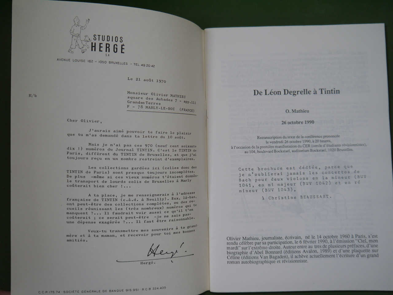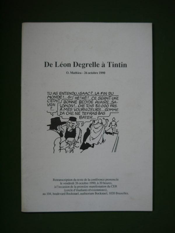 Retranscription du texte de la conférence prononcée par l’auteur, le vendredi 26 octobre 1990 à l’occasion de la première manifestation du CER ( Cercle d’étudiants révisionnistes) à Bruxelles. 48 pages. L’auteur, dont la mère fut l’amie de Hergé, soutient que Tintin = Léon Degrelle.