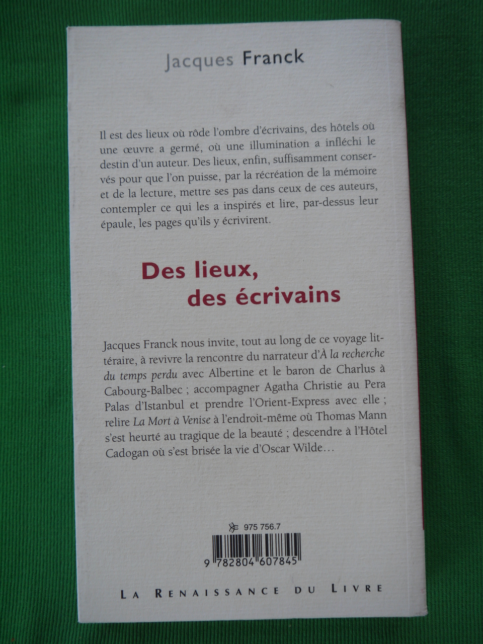 Evocation de lieux (des hôtels pour la plupart) et des textes qu’ils inspirèrent à Oscar Wilde, Thomas Mann, Ernest Hemingway et beaucoup d’autres… Jacques Franck fut longtemps journaliste puis rédacteur en chef à la Libre Belgique.