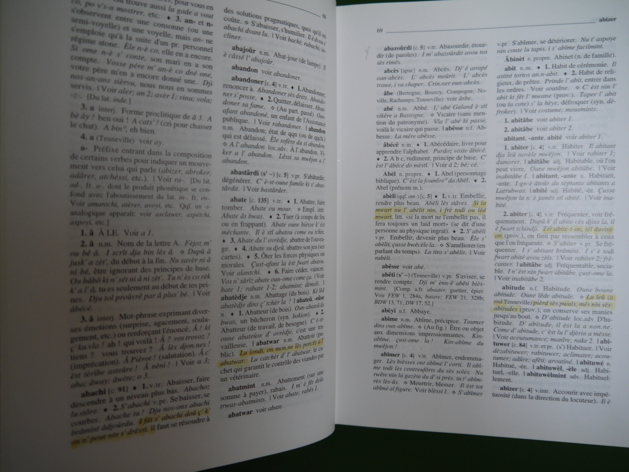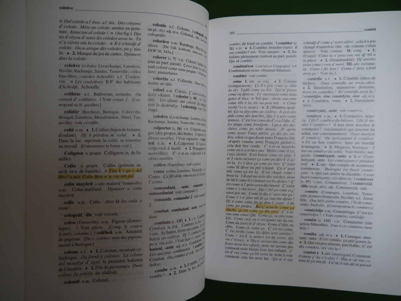 Plus de 1000 pages de vocabulaire local, avec pour certains mots le nom des quelques villages où ils sont utilisés! Exemplaire un peu défraîchi, avec de nombreux surlignages fluo et des notes manuscrites.