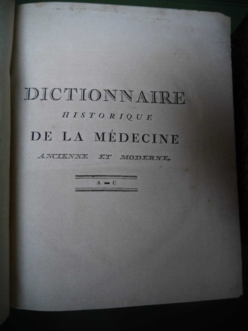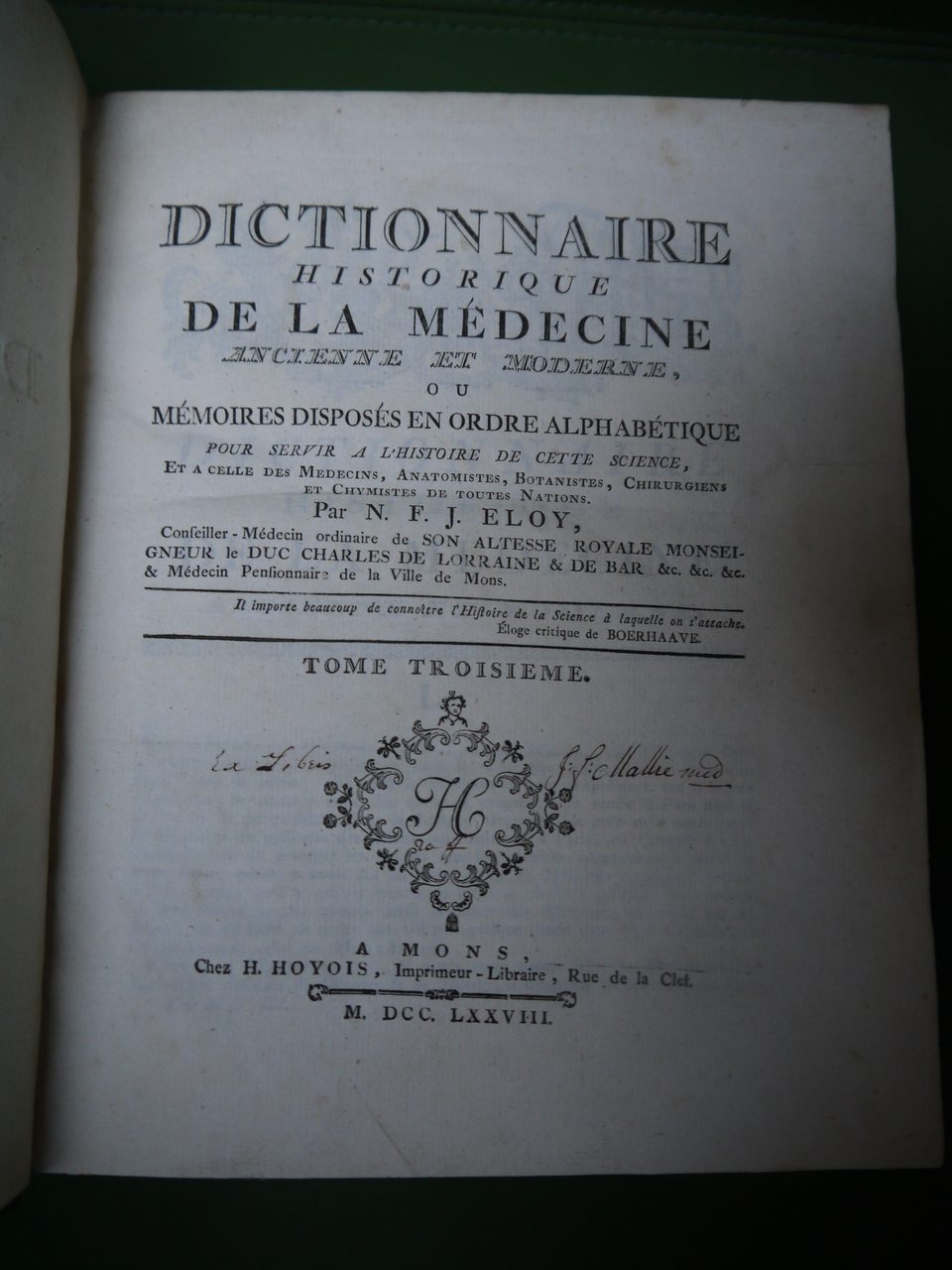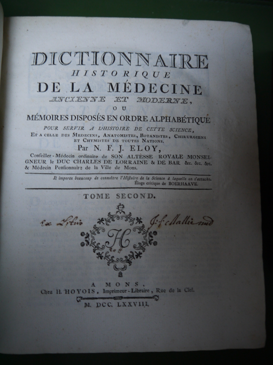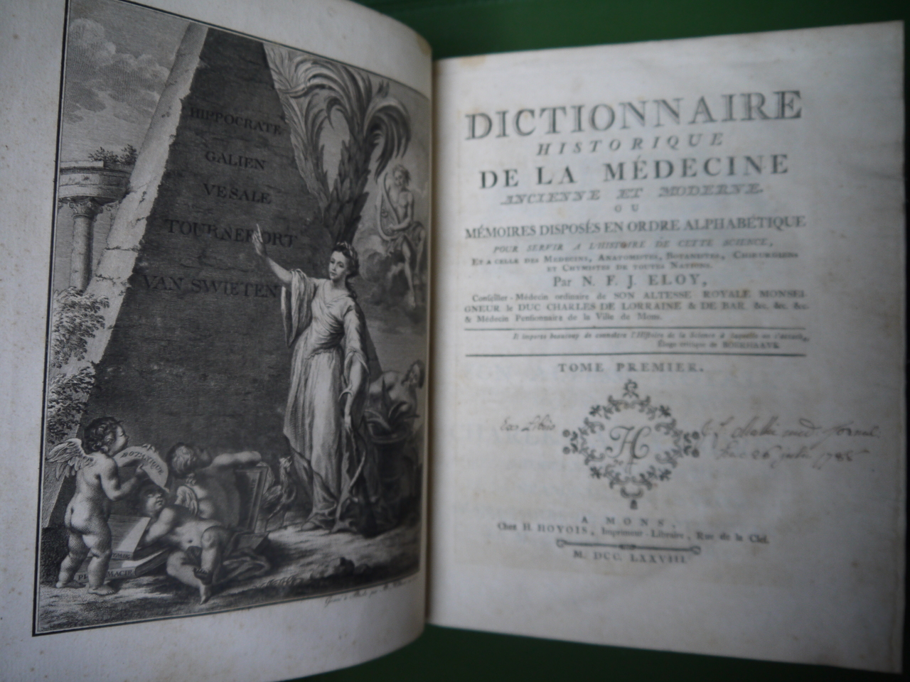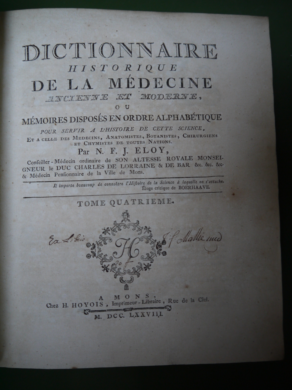 « Ou Mémoires Disposés En Ordre Alphabétique Pour Servir A L’Histoire De Cette Science, Et a celle des Medecins, Anatomistes, Botanistes, Chirurgiens et Chymistes de toutes Nations. » Seconde édition (revue et augmentée) – la première fut publiée à Liège en 1755 sous le titre « Dictionnaire historique de la médecine, avec l’histoire des plus célèbres medecins ». Nicolas François Joseph était montois, et cette seconde édition est également publiée à Mons, chez Hoyois, sis rue de la clef. Frontispice dans le volume 1, ainsi qu’une dédicace à Son Altesse Royale Charles-Alexandre, administrateur de la grande maîtrise de Prusse; grand-maître de l’ordre teutonique en Allemagne et en Italie (etc).