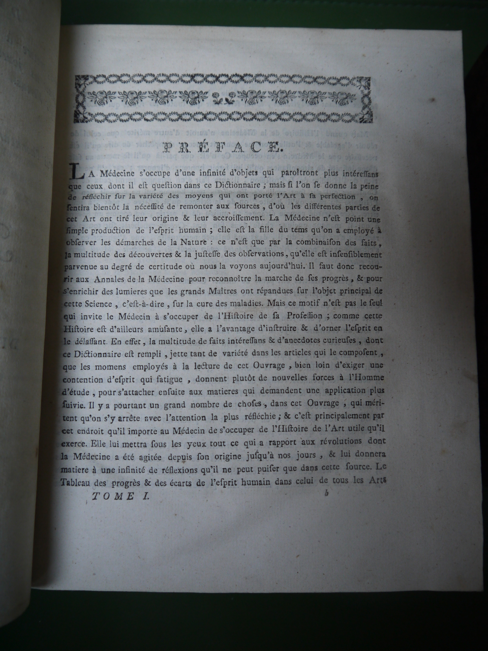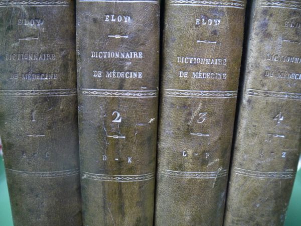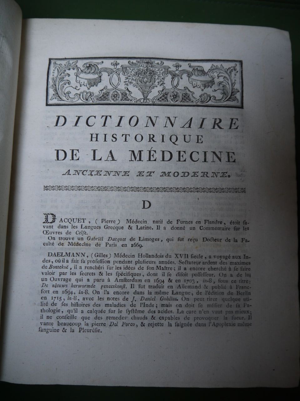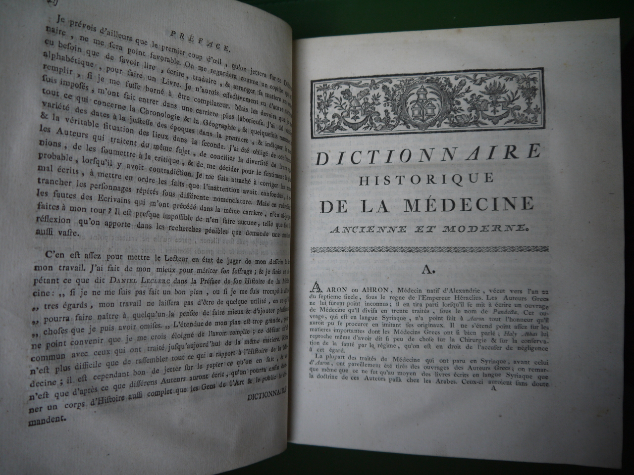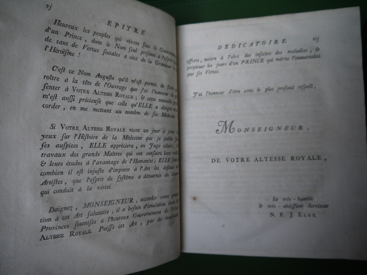 « Ou Mémoires Disposés En Ordre Alphabétique Pour Servir A L’Histoire De Cette Science, Et a celle des Medecins, Anatomistes, Botanistes, Chirurgiens et Chymistes de toutes Nations. » Seconde édition (revue et augmentée) – la première fut publiée à Liège en 1755 sous le titre « Dictionnaire historique de la médecine, avec l’histoire des plus célèbres medecins ». Nicolas François Joseph était montois, et cette seconde édition est également publiée à Mons, chez Hoyois, sis rue de la clef. Frontispice dans le volume 1, ainsi qu’une dédicace à Son Altesse Royale Charles-Alexandre, administrateur de la grande maîtrise de Prusse; grand-maître de l’ordre teutonique en Allemagne et en Italie (etc).