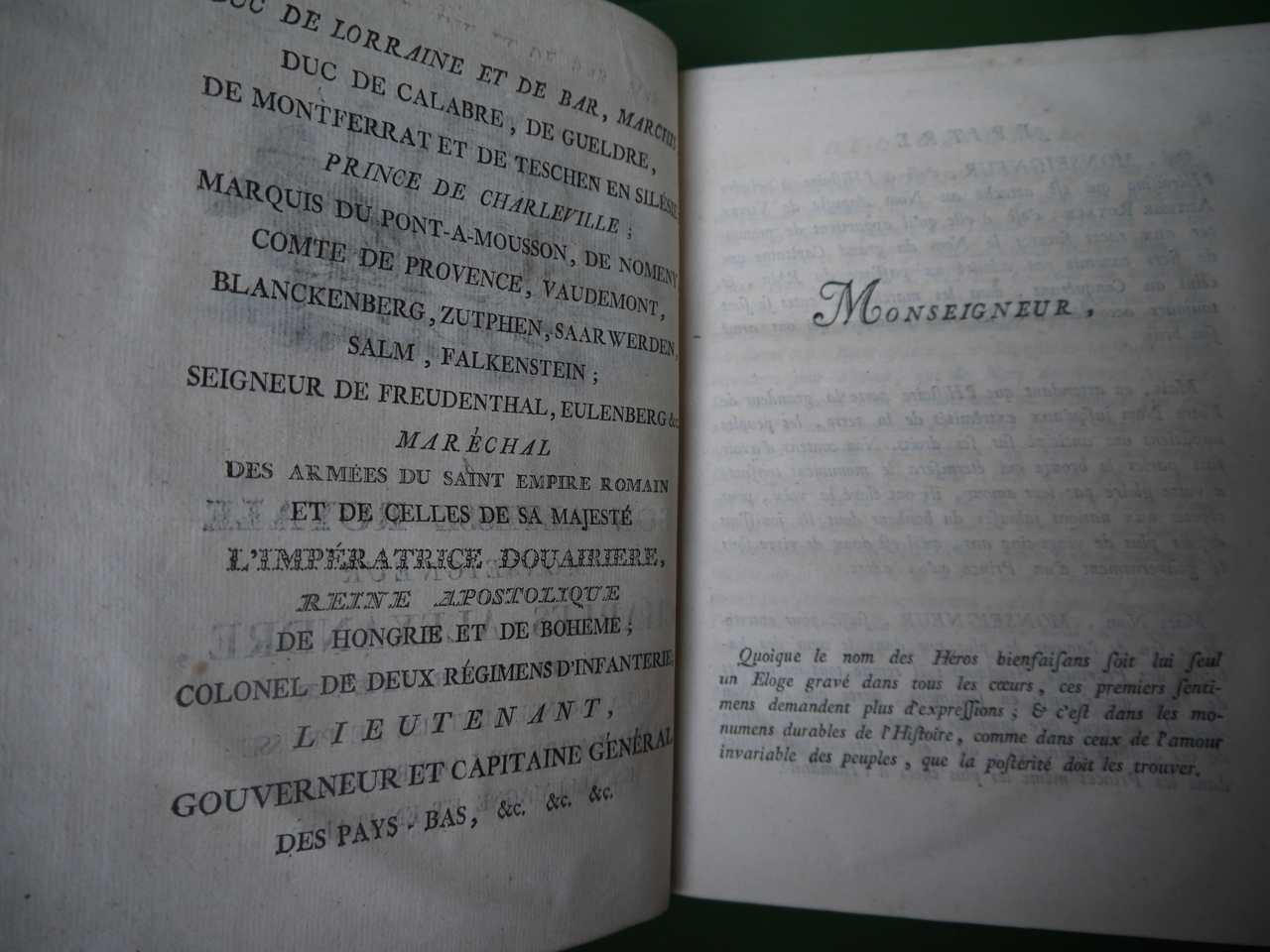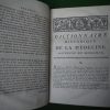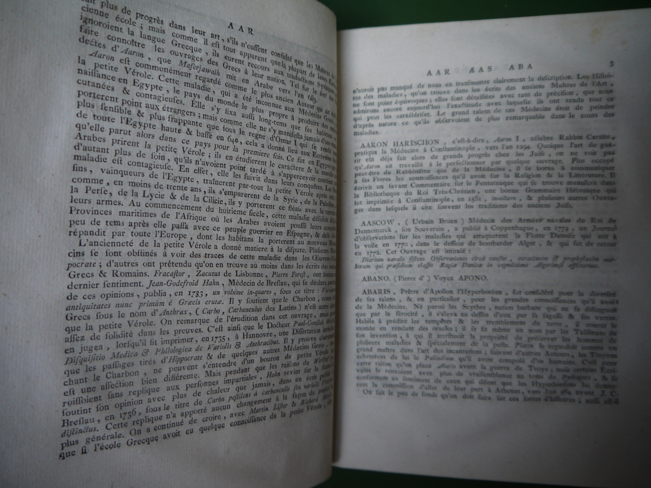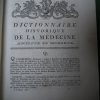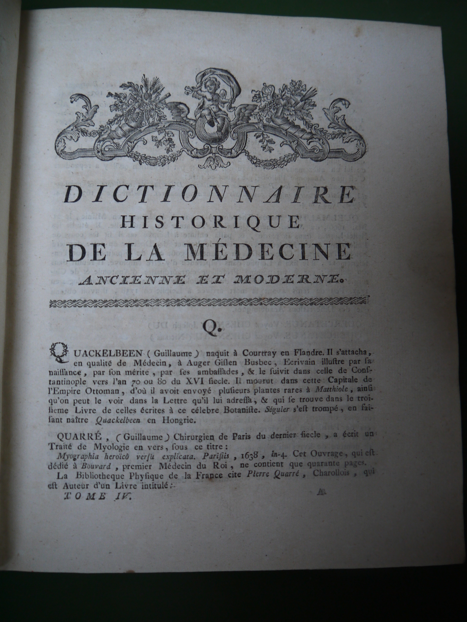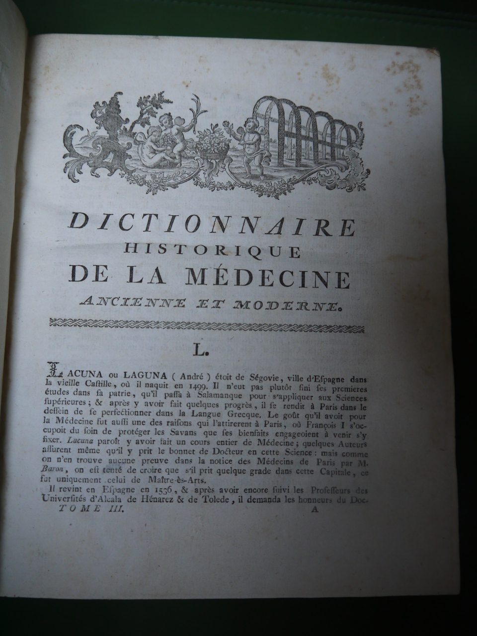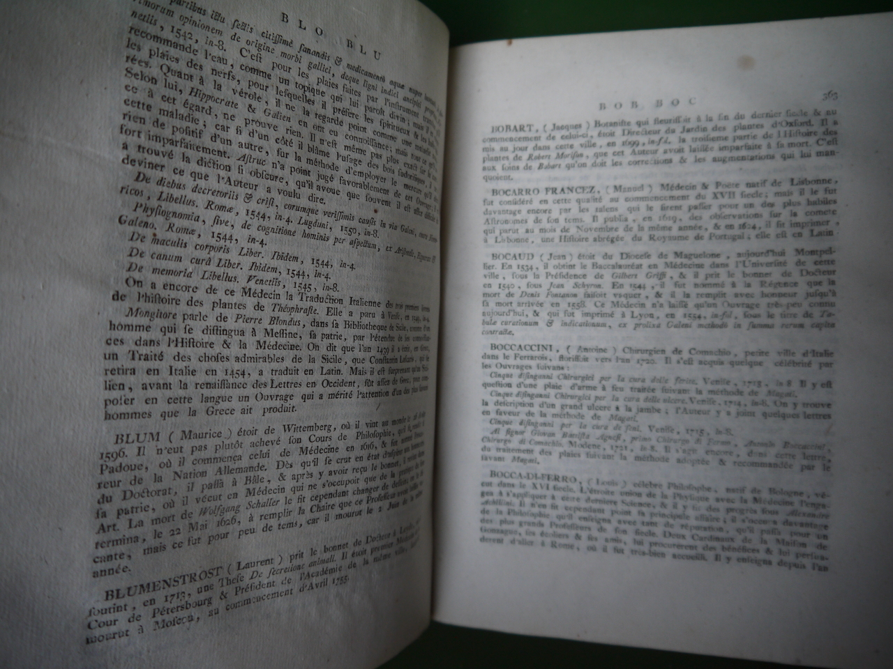 « Ou Mémoires Disposés En Ordre Alphabétique Pour Servir A L’Histoire De Cette Science, Et a celle des Medecins, Anatomistes, Botanistes, Chirurgiens et Chymistes de toutes Nations. » Seconde édition (revue et augmentée) – la première fut publiée à Liège en 1755 sous le titre « Dictionnaire historique de la médecine, avec l’histoire des plus célèbres medecins ». Nicolas François Joseph était montois, et cette seconde édition est également publiée à Mons, chez Hoyois, sis rue de la clef. Frontispice dans le volume 1, ainsi qu’une dédicace à Son Altesse Royale Charles-Alexandre, administrateur de la grande maîtrise de Prusse; grand-maître de l’ordre teutonique en Allemagne et en Italie (etc).