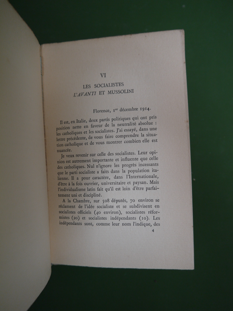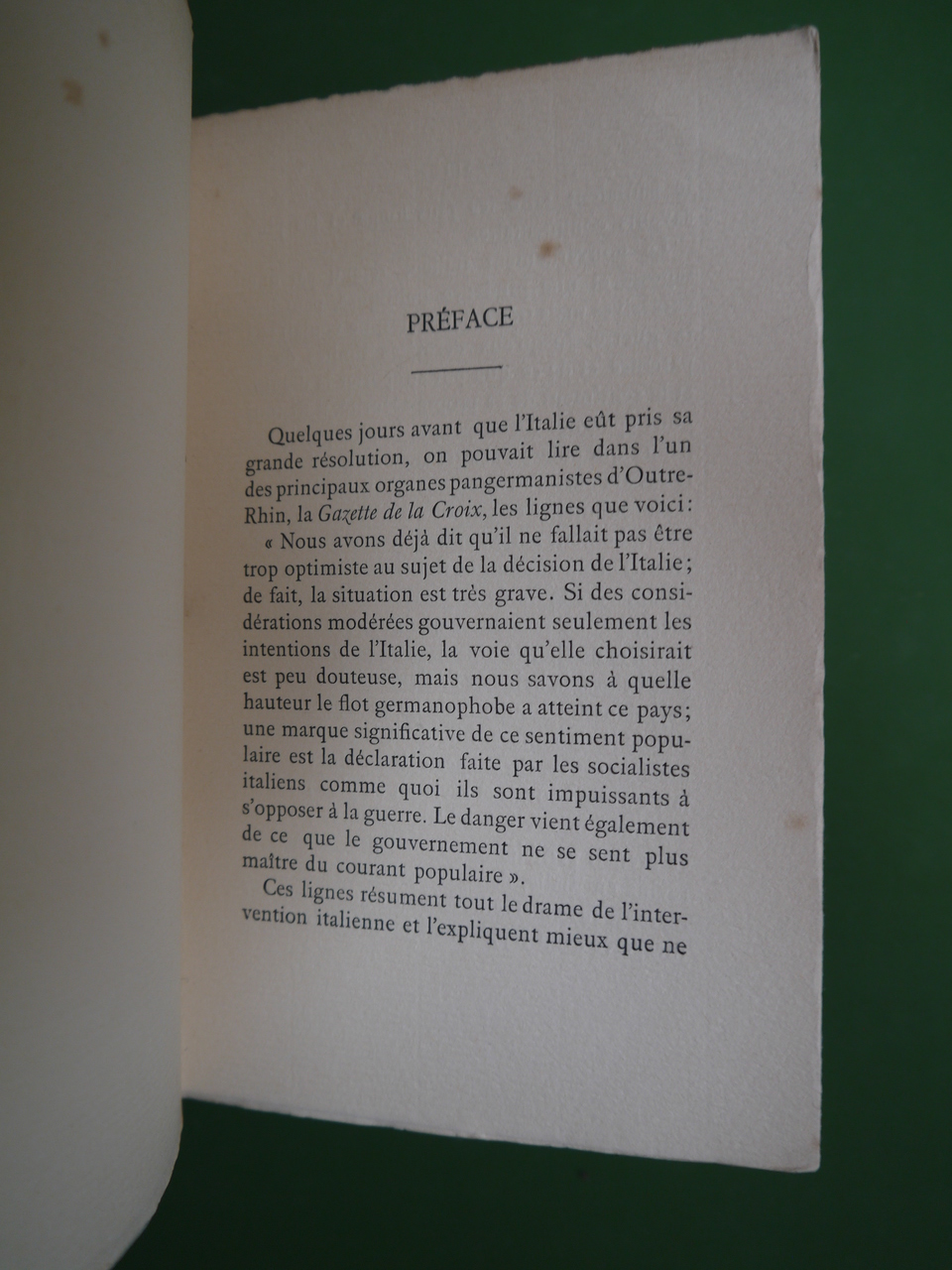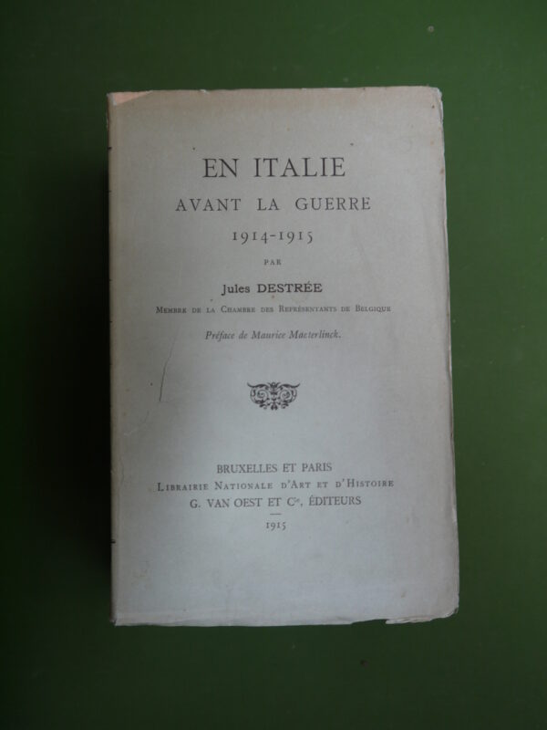 Jules Destrée s’est adressé à de nombreuses foules en Italie pour convaincre l’opinion publique de s’engager dans la guerre aux côtés des Français et des Belges… Préface de Maeterlinck. Déchirure dans la couverture de l’exemplaire proposé.