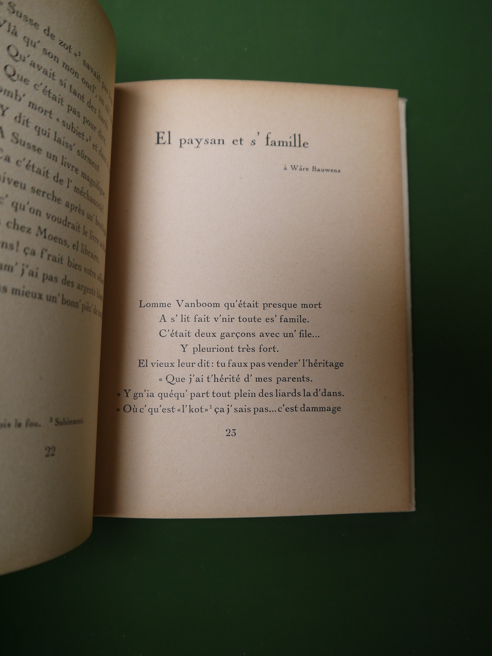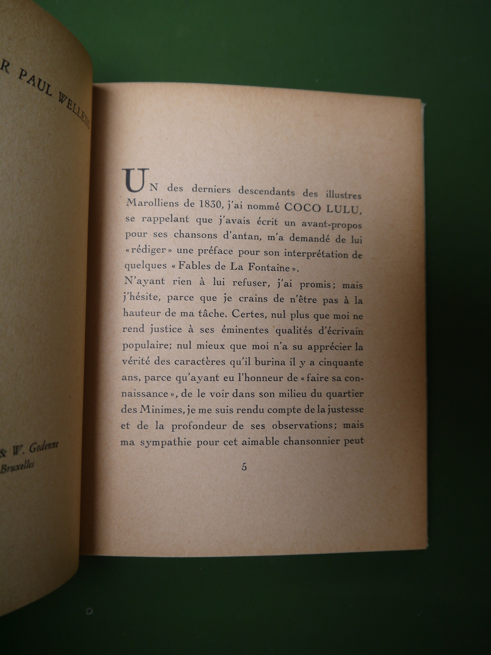 La préface toute en nuances de cette adaptation marollienne de La Fontaine, signée Victor Lefèvre (« Sans doute, l’Académie des belles-lettres y regarderait à deux fois avant d’admettre Coco Lulu dans son sein ») est datée de 1898. L’édition est clairement plus tardive. Illustrations de Paul Wellens.