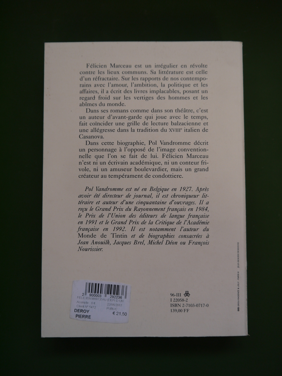 Une des nombreuses biographies écrites par Vandromme, ici celle d’un « irrégulier » belge exilé par la force des choses à Paris. Ca démarre en fanfare: « Finissons-en tout de suite, c’est la meilleure façon de commencer. Un paragraphe suffira pour ouvrir et refermer sur le champ la parenthèse controversée des années courtes ».