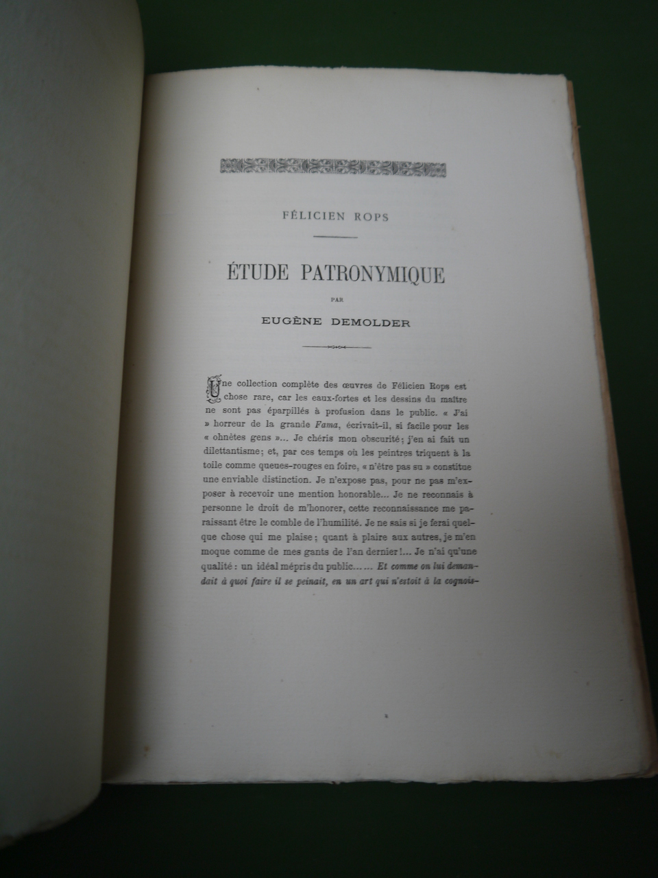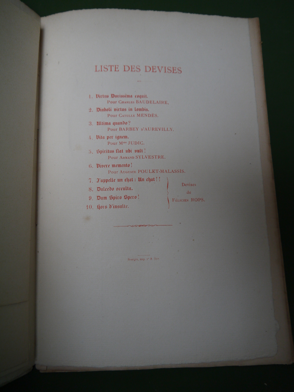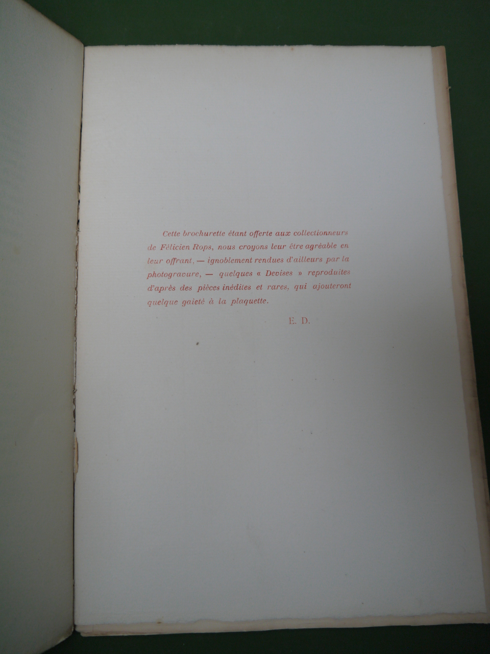 « Avec quelques reproductions brutales de devises inédites de Rops », mais seules 4 reproductions originales (sur les 10 annoncées) sont présentes. (Des photocopies des 10 devises sont jointes également). Etat général moyen. Eugène Demolder était le beau-fils de Rops.
