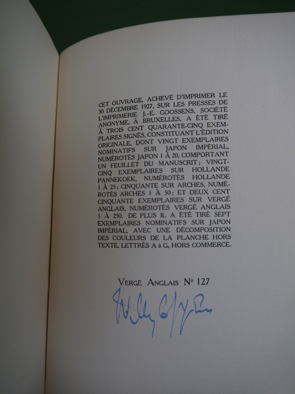 Edition originale, un des 250 exemplaires numérotés sur vergé anglais, signé par l’auteur. Exemplaire relié!