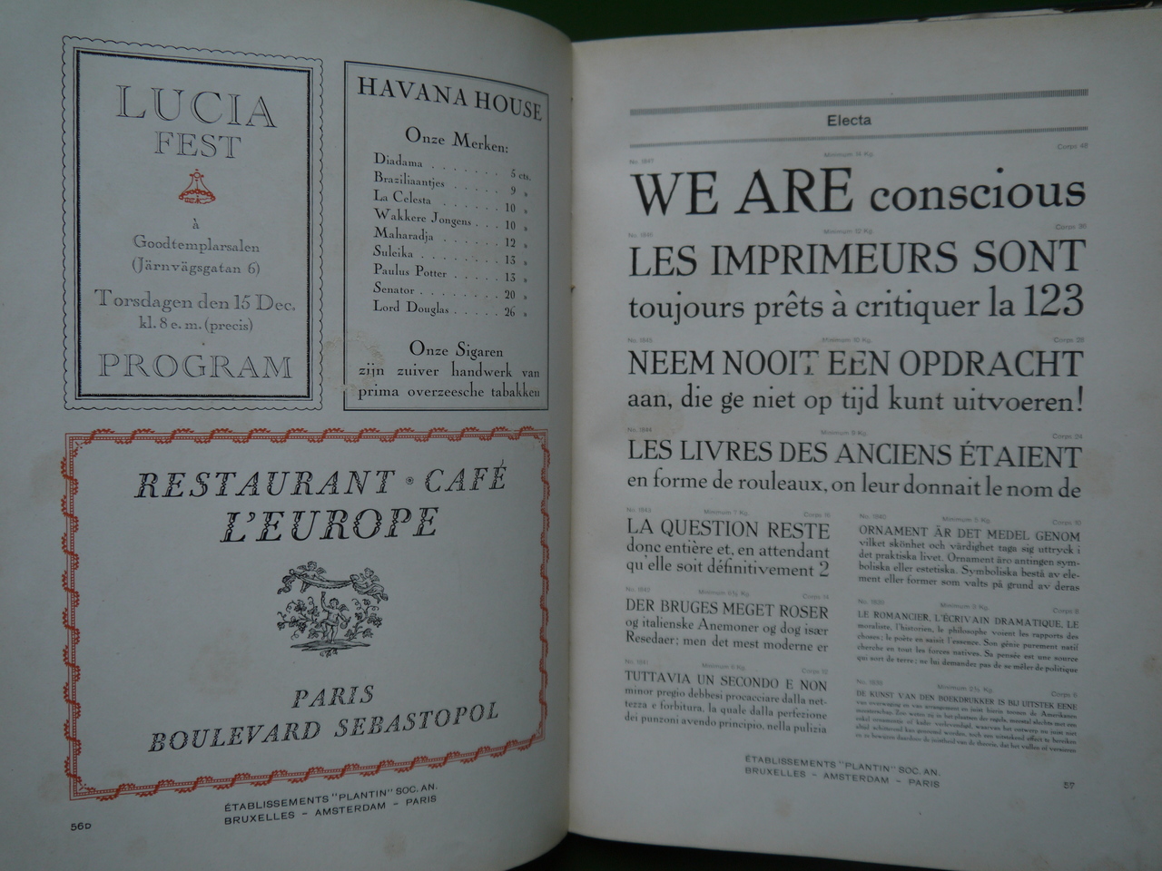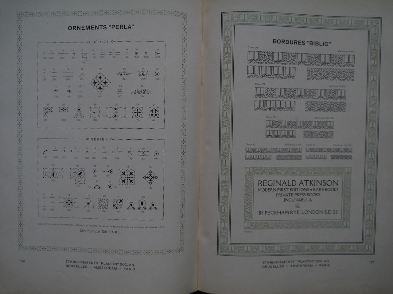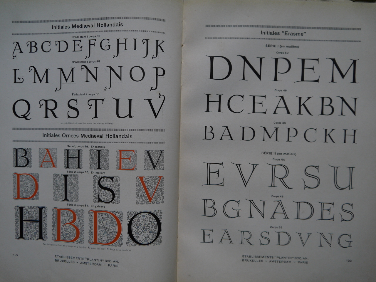 Un catalogue des fameux établissements Plantin, créateurs de typographies et de tous caractères imprimés. Quelques pages de l’exemplaire en vente ont subi des découpes. 200 pages de régal visuel…