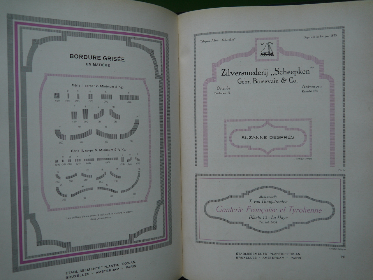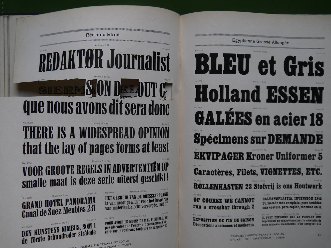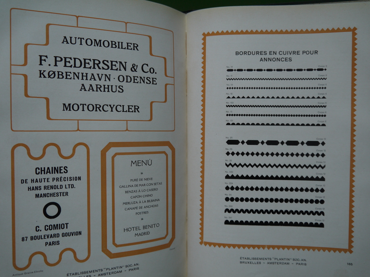 Un catalogue des fameux établissements Plantin, créateurs de typographies et de tous caractères imprimés. Quelques pages de l’exemplaire en vente ont subi des découpes. 200 pages de régal visuel…