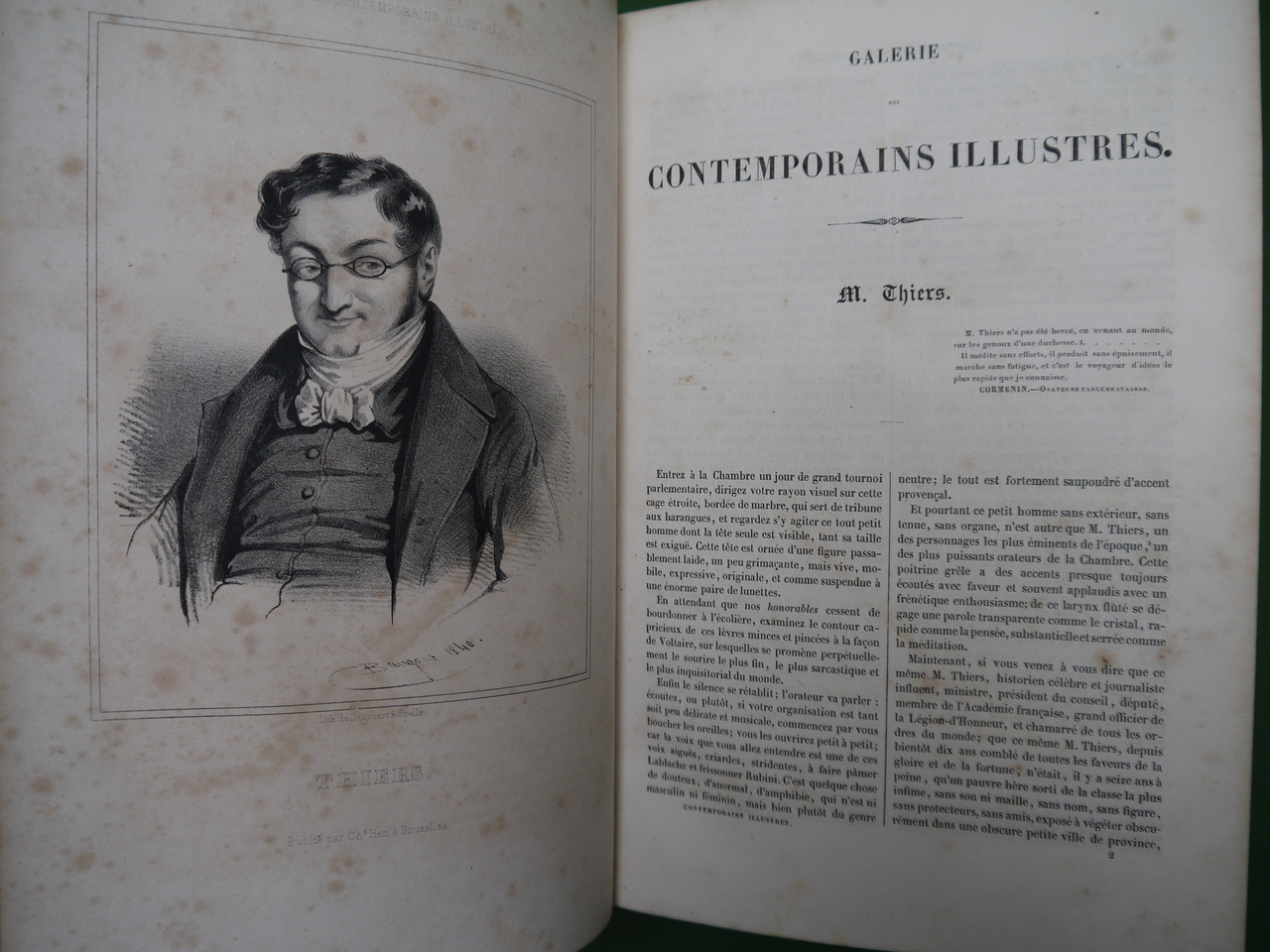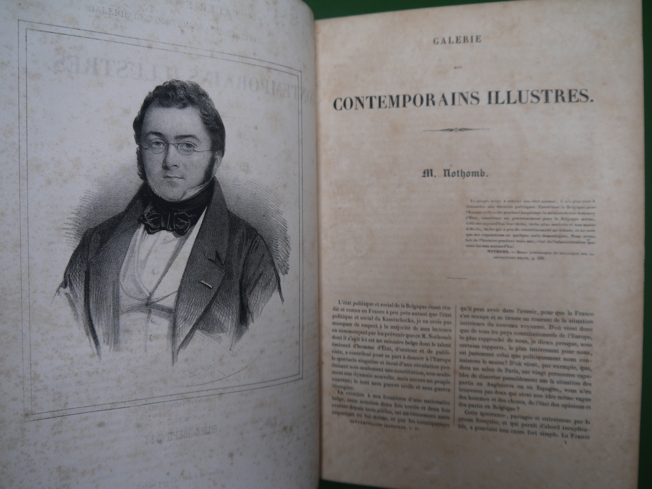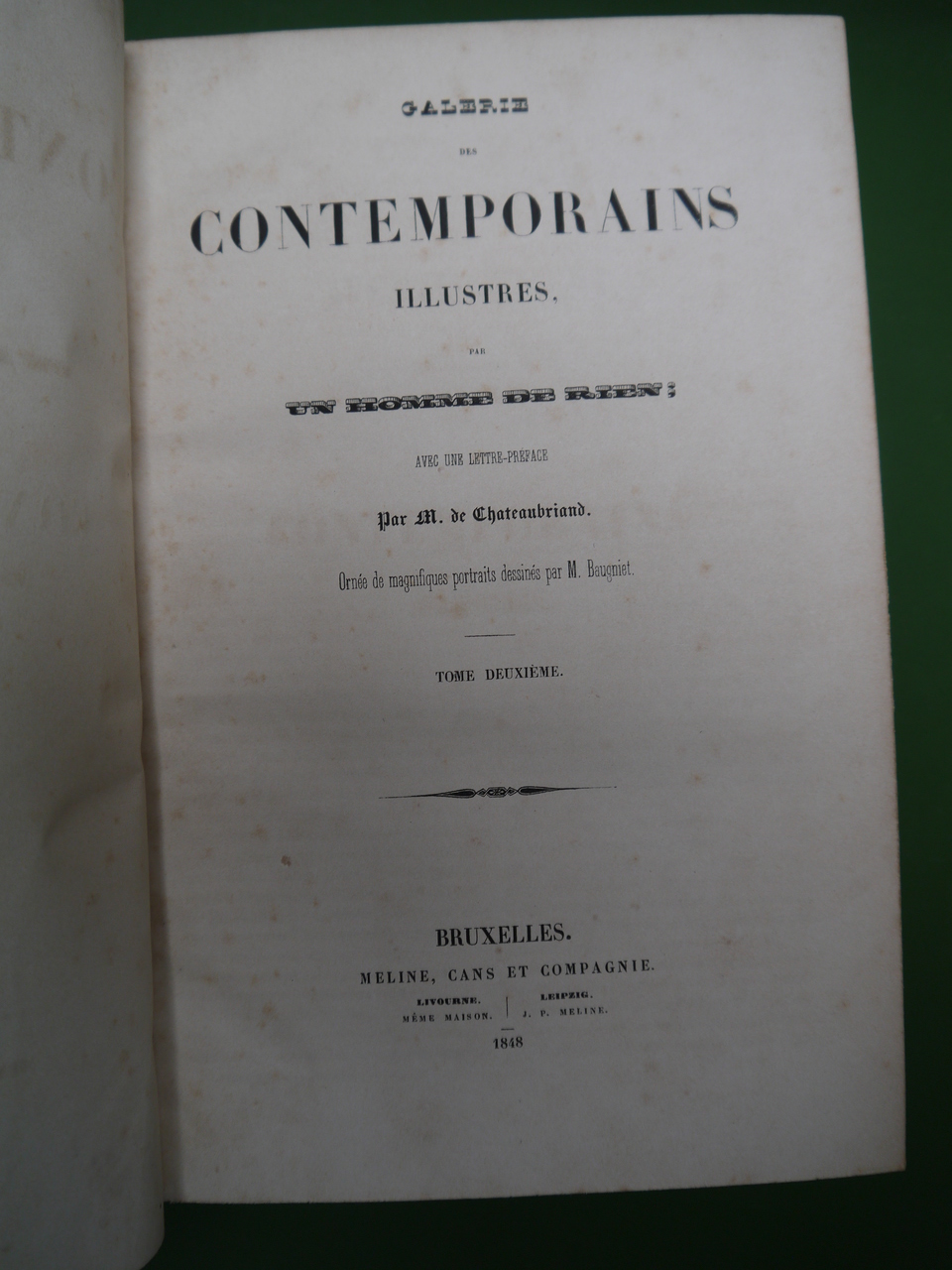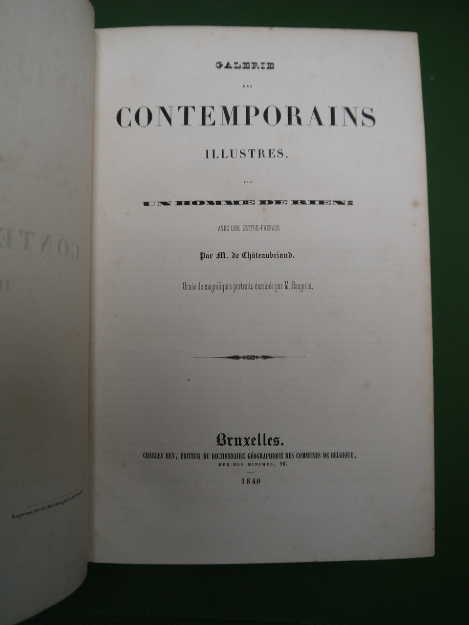 « Avec une lettre-préface de M. de Châteaubriand, ornée de magnifiques portraits dessinés par M. Baugniet. » L’ « homme de rien » s’appellait en réalité Louis de Loménie et était français, comme la quasi-totalité des contemporains illustres cités – exceptions belges: Nothomb et Rogier. Nombreuses gravures hors-texte. Edition belge d’un titre publié à Paris.