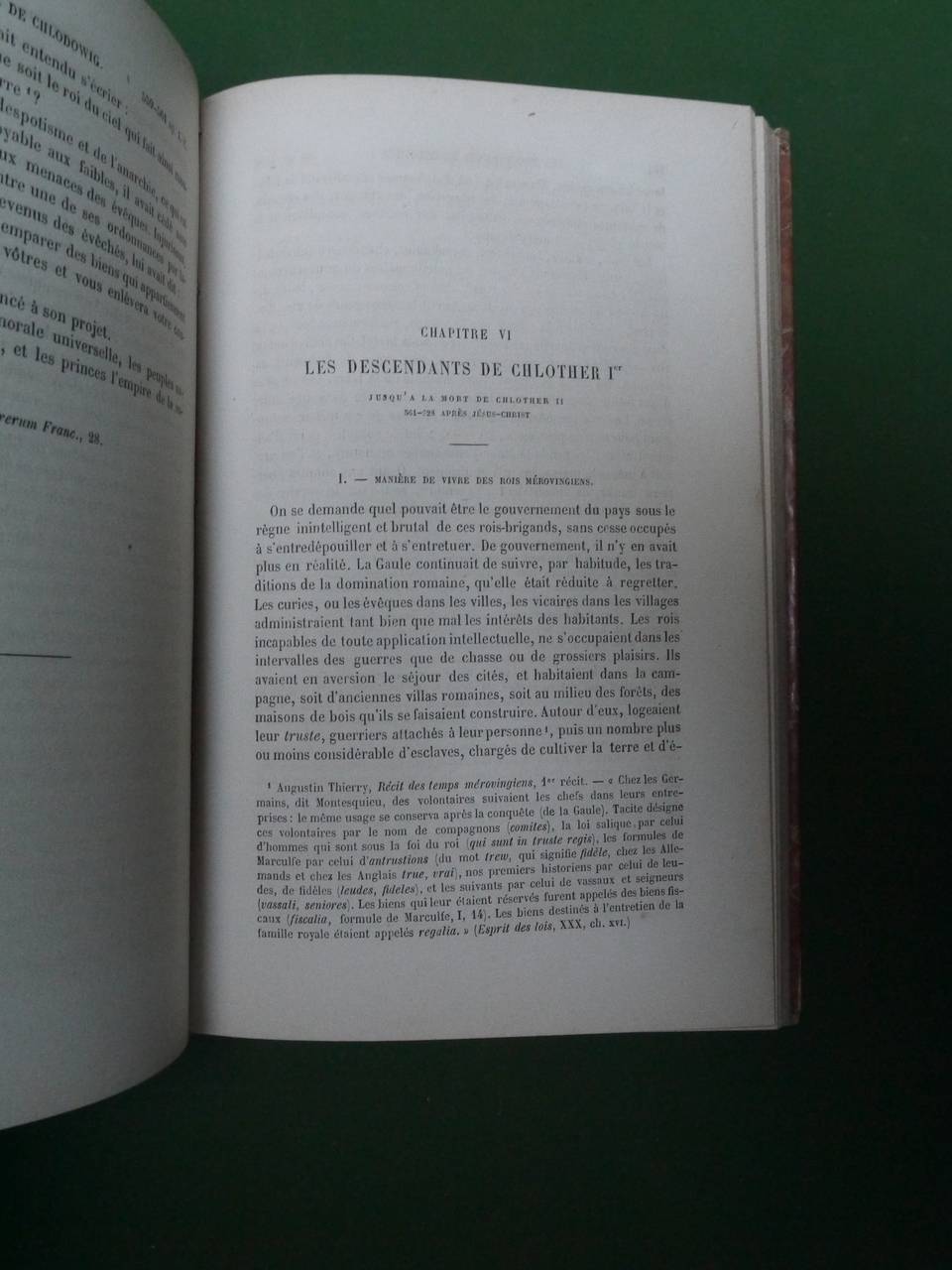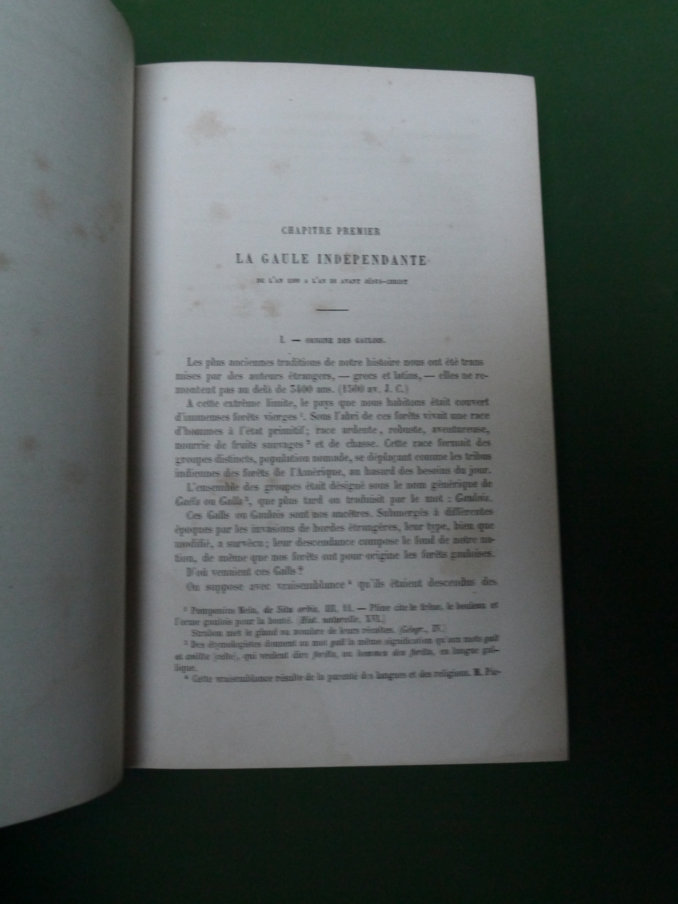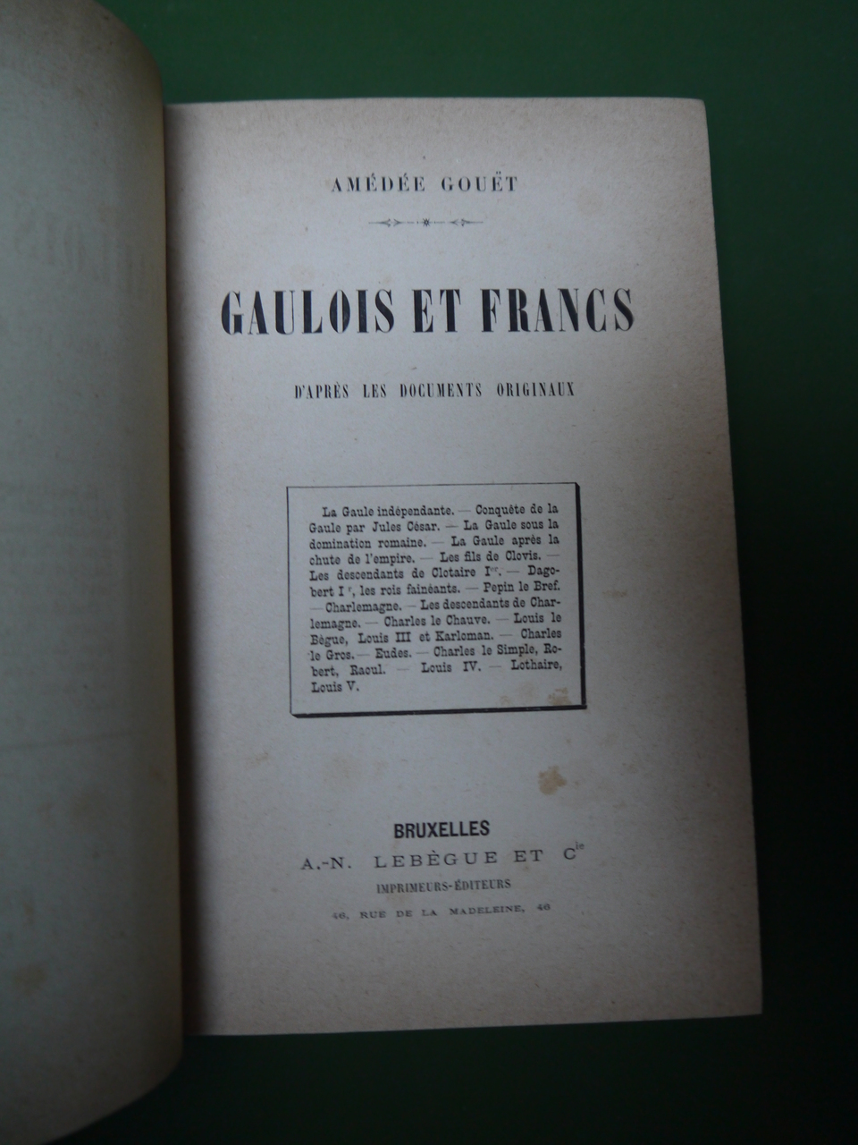 « D’après les documents originaux », précise le sous-titre. Mention de « fin de 1er tome » en fin de table des matières, sans plus de précisions. Chapitres: « La Gaule indépendante », « Conquête de la Gaule par Jules César », « La Gaule sous la domination romaine », « La Gaule après la chute de l’Empire », « Les fils de Chlodowig (Clovis) », « Les descendants de Chlother Ier », « Dagobert Ier – Les rois-fainéants », « Peppin (le bref) », « Karle I (Charlemagne) », « Les descendants de Charlemagne », « Karle II (Charles le chauve) », « Lodewig II (Louis le bègue), Lodewig III et Karloman », « Karle-le-gros », « Eudes », « Karle III, le simple ou le sot – Robert – Raoul », Lodewig (Louis) IV, d’outre-mer », « Lother – Lodewig V, le fainéant ».