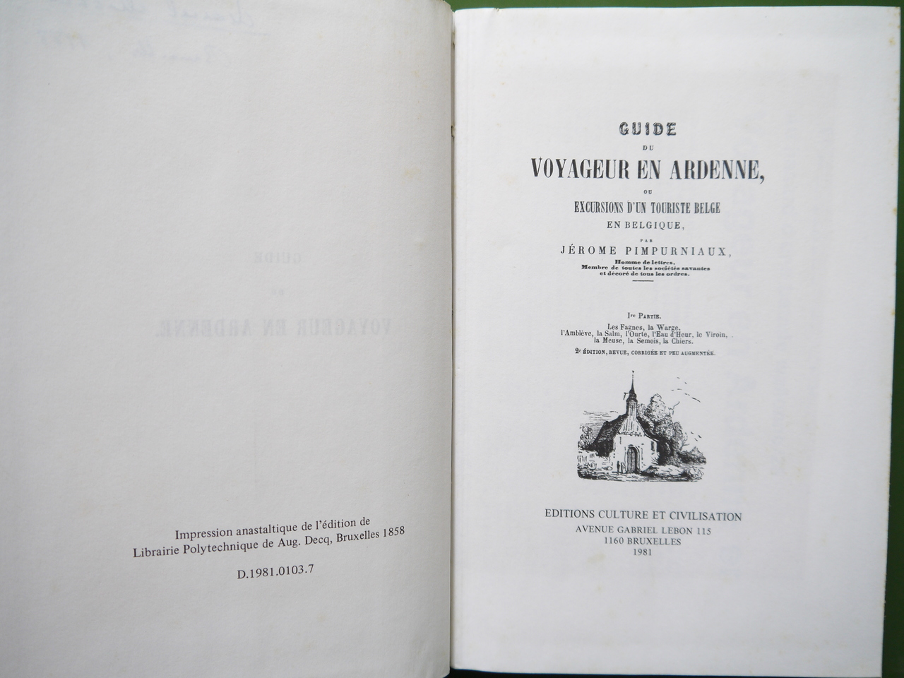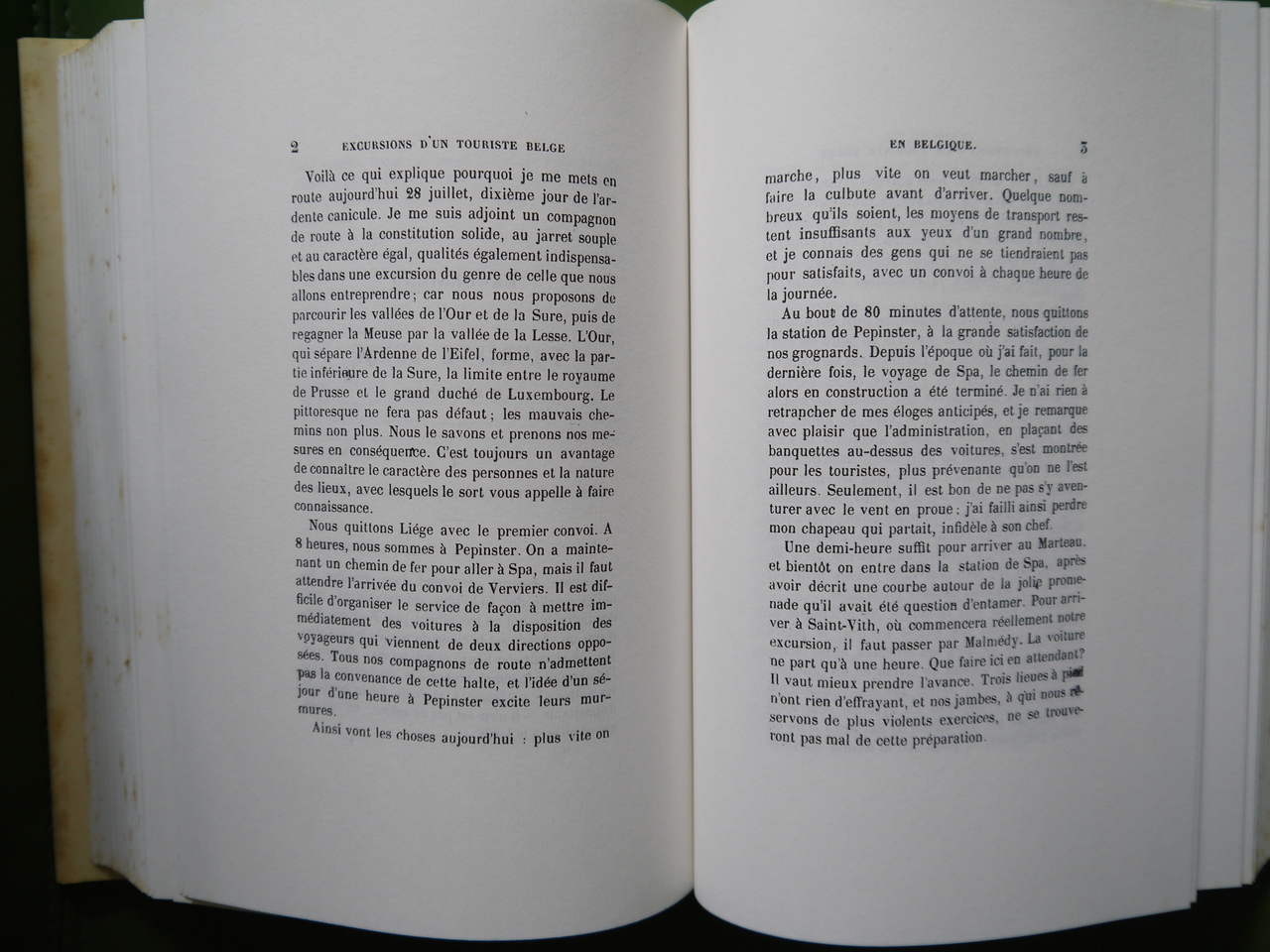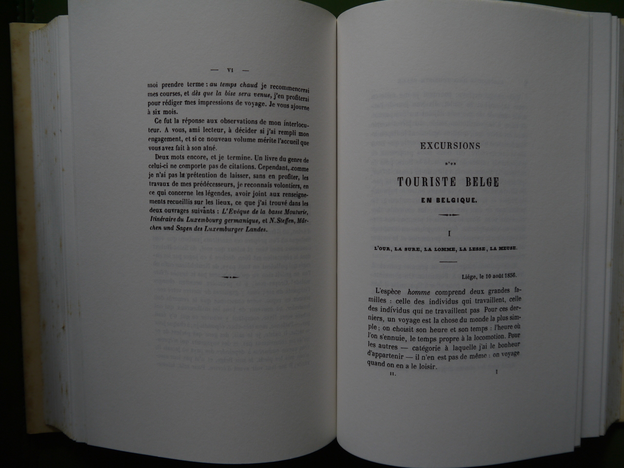 Impression anastaltique d’un ouvrage de 1858. Ouvrage en deux parties de plus de 400 pages chacune, sous-titré « Excursions d’un touriste belge en Belgique ». Première partie: les Fagnes, l’Ourte, l’Eau d’Heur, le Viroin, la Meuse… et dans la seconde: la Sure, la Lomme, l’Alzette, le Hoyoux…
