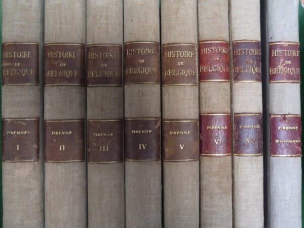 La bible de Pirenne entière en sept volumes plus un huitième intitulé « Bibliographie », dans une reliure sobre mi-toile robuste. Les divers volumes ne proviennent pas de la même édition. Le tome 1 est daté de 1909 avec mention de 3e édition (avant-propos daté de 1909). Le tome 2 est daté de 1908 avec mention de 2e édition (avant-propos daté de 1908). Le tome 3 est daté de 1907 (avant-propos daté de 1907). Le tome 4 est daté de 1911 (avant-propos daté de 1911). Le tome 5 est daté de 1920 sans mention d’édition (avant-propos daté de 1920). Le tome 6 est daté de 1926 sans mention d’édition (avant-propos daté de 1926). Le dernier tome est daté de 1932 sans mention d’édition (avant-propos daté de 1931). Le volume bibliographique, en collaboration avec Henri Nowé et Henri Obreen, est daté de 1931 (avant-propos daté de 1931).