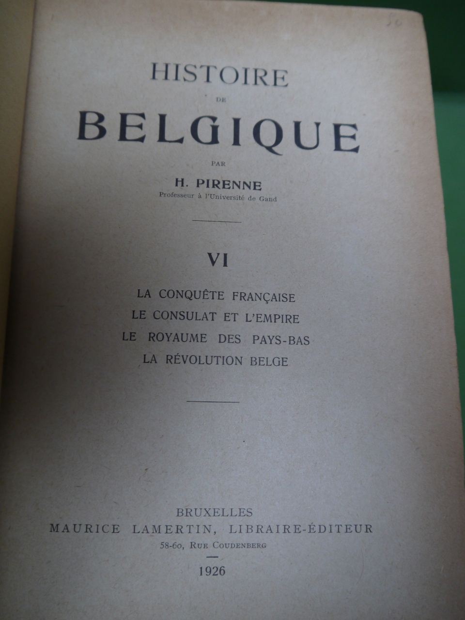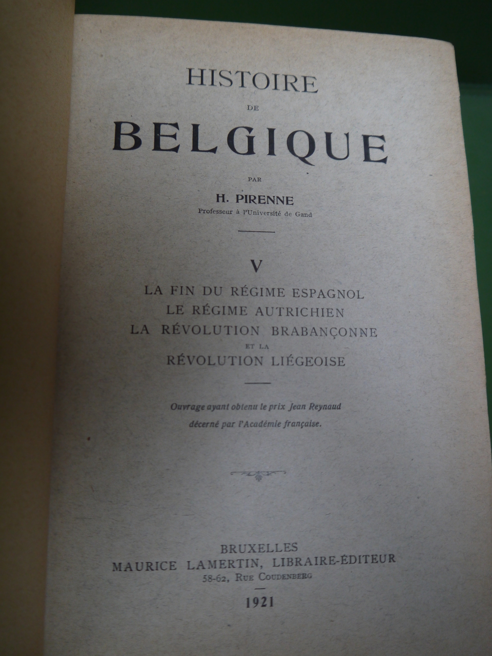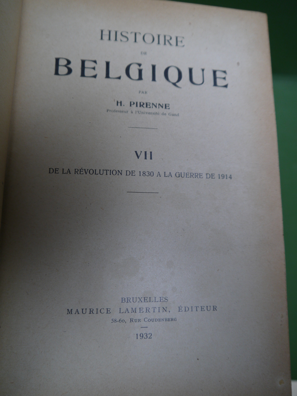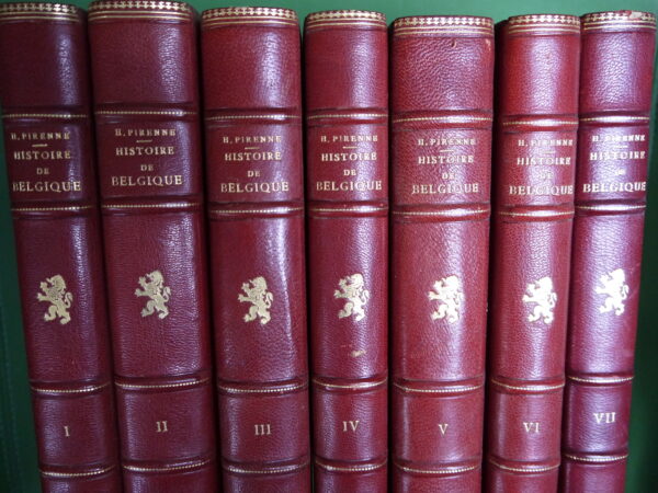 La bible de Pirenne entière en sept volumes dans une reliure très sobre et robuste. Les divers volumes ne proviennent pas de la même édition. Le tome 1 est daté de 1929 avec mention de 5e édition (avant-propos daté de 1928). Le tome 2 est daté de 1922 avec mention de 3e édition (avant-propos daté de 1922). Le tome 3 est daté de 1923 avec mention de 3e édition (avant-propos daté de 1923). Le tome 4 est daté de 1927 avec mention de 3e édition revue et corrigée (avant-propos daté de 1927). Le tome 5 est daté de 1921/1920 sans mention d’édition (avant-propos daté de 1920). Le tome 6 est daté de 1926 sans mention d’édition (avant-propos daté de 1926). Le dernier tome est daté de 1932 sans mention d’édition (avant-propos daté de 1931).