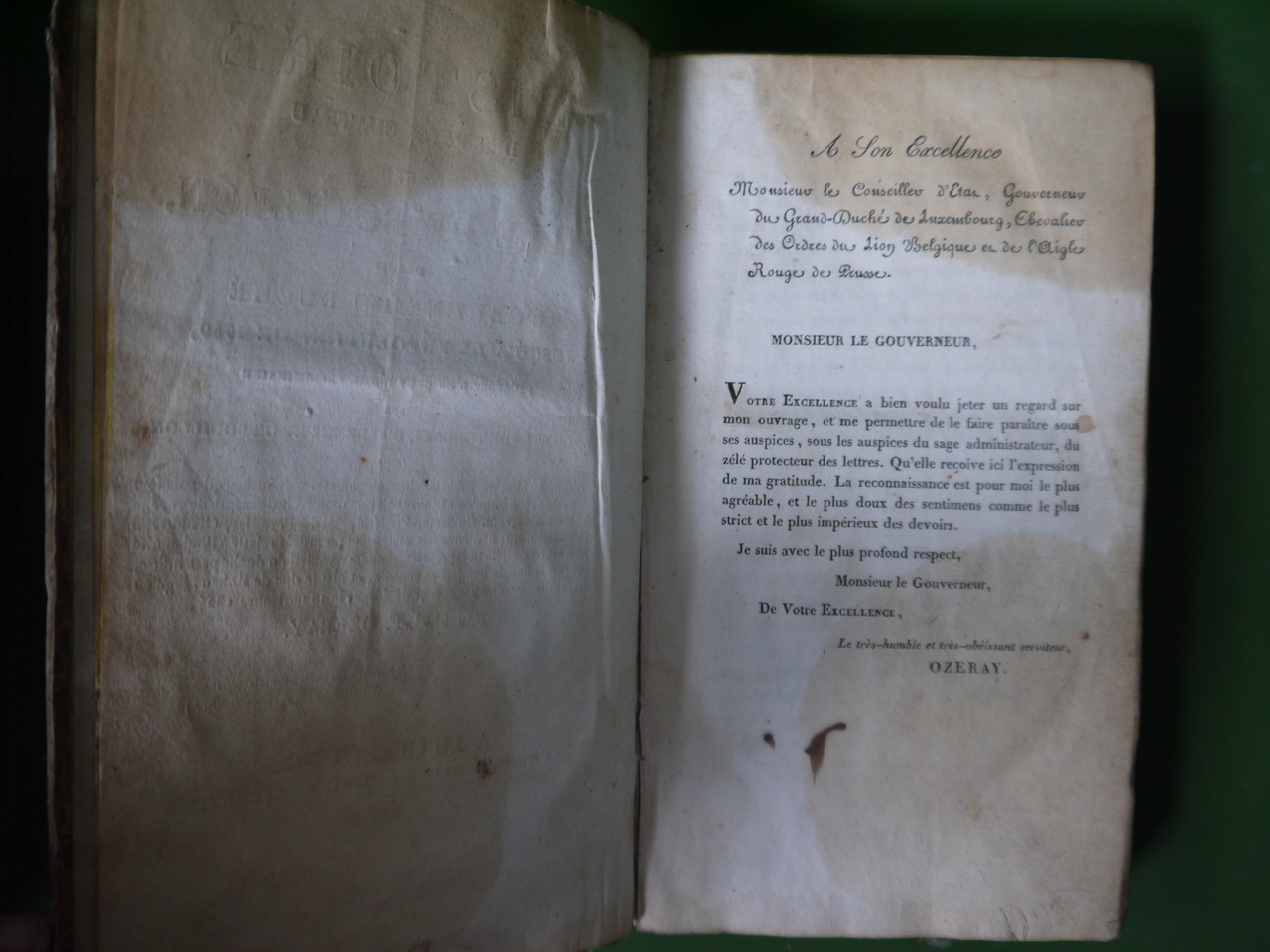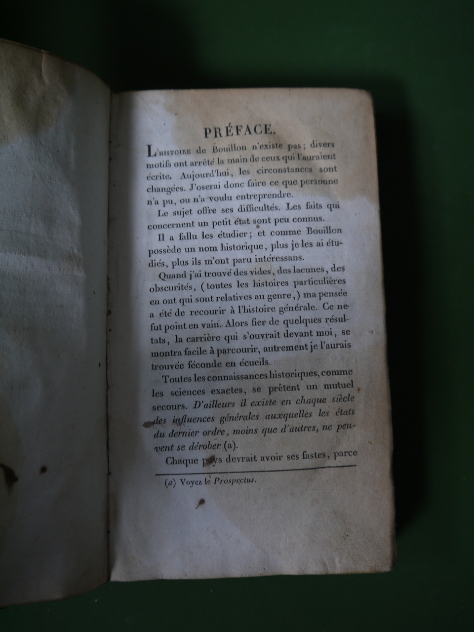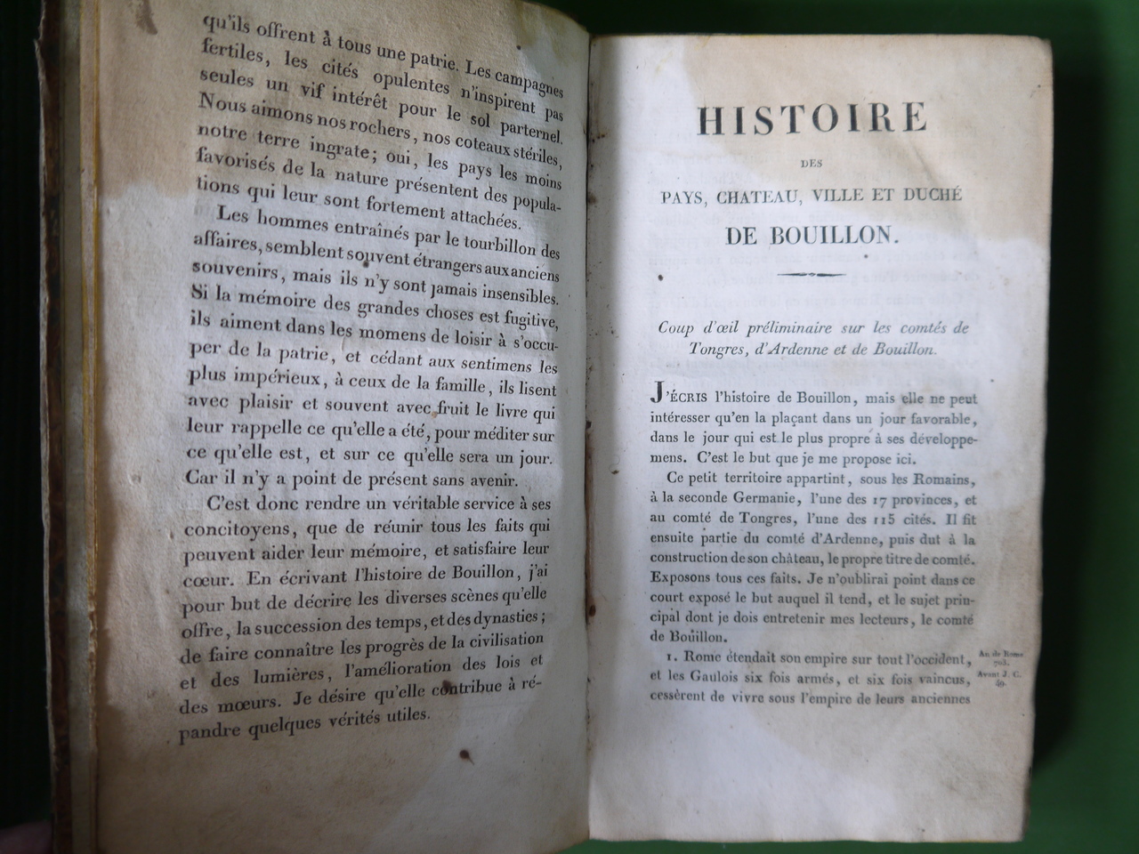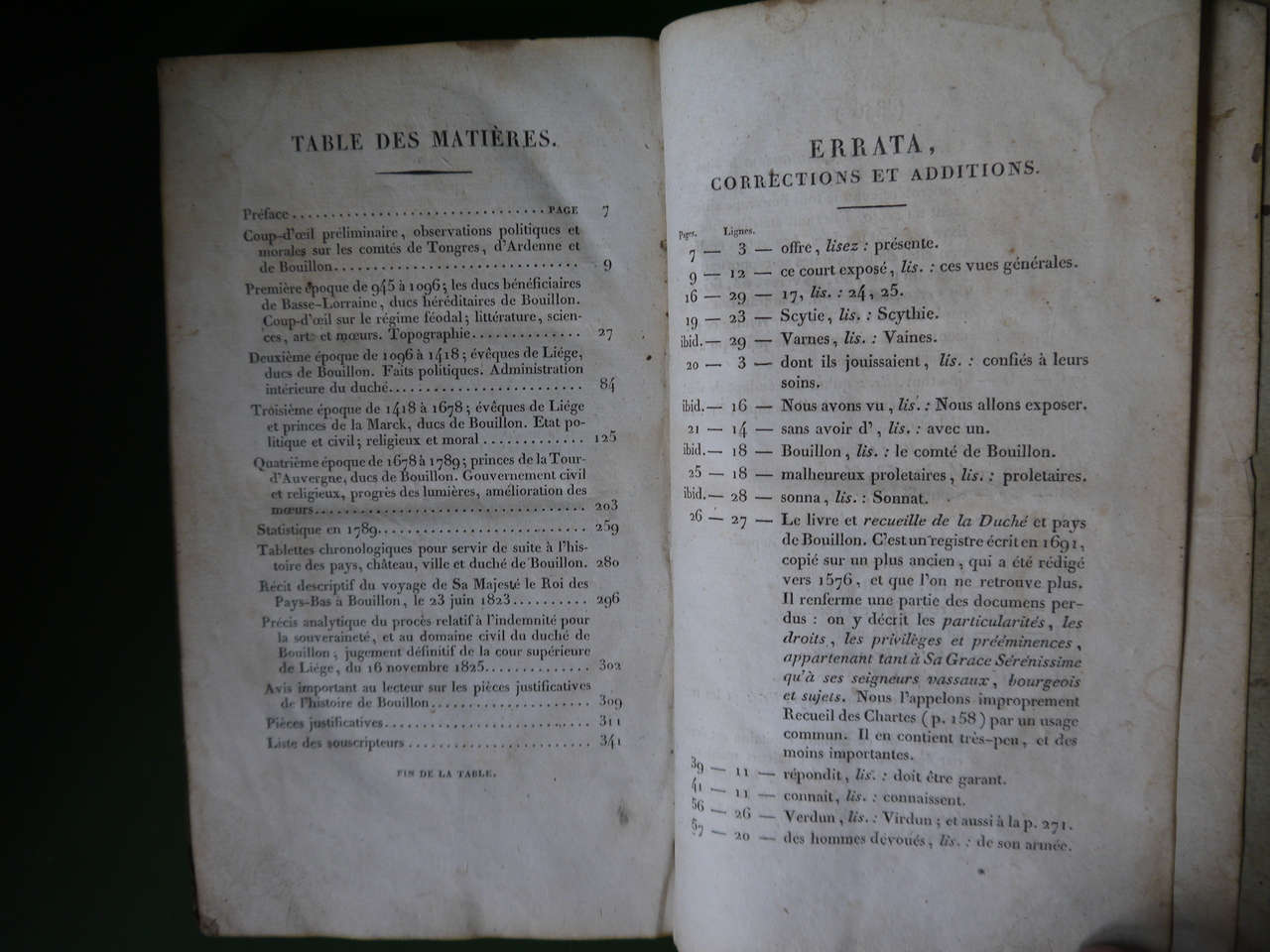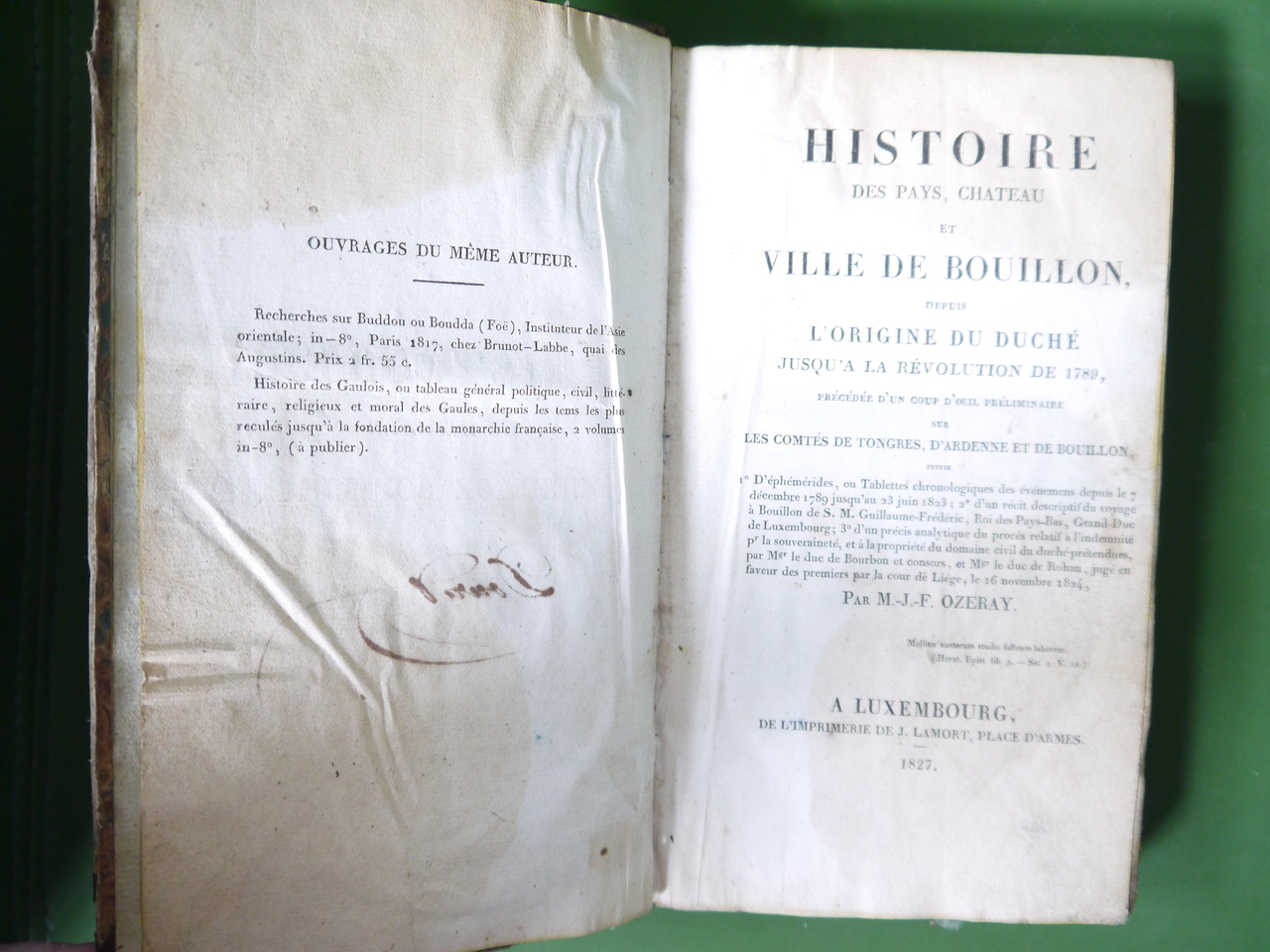 La page de titre est plus complète: « Histoire des pays, château, ville de Bouillon depuis l’origine du duché jusqu’à la révolution de 1789, précédé d’un coup d’oeil préliminaire sur les comtés de Tongres, d’Ardenne et de Bouillon ». Edité à Luxembourg.