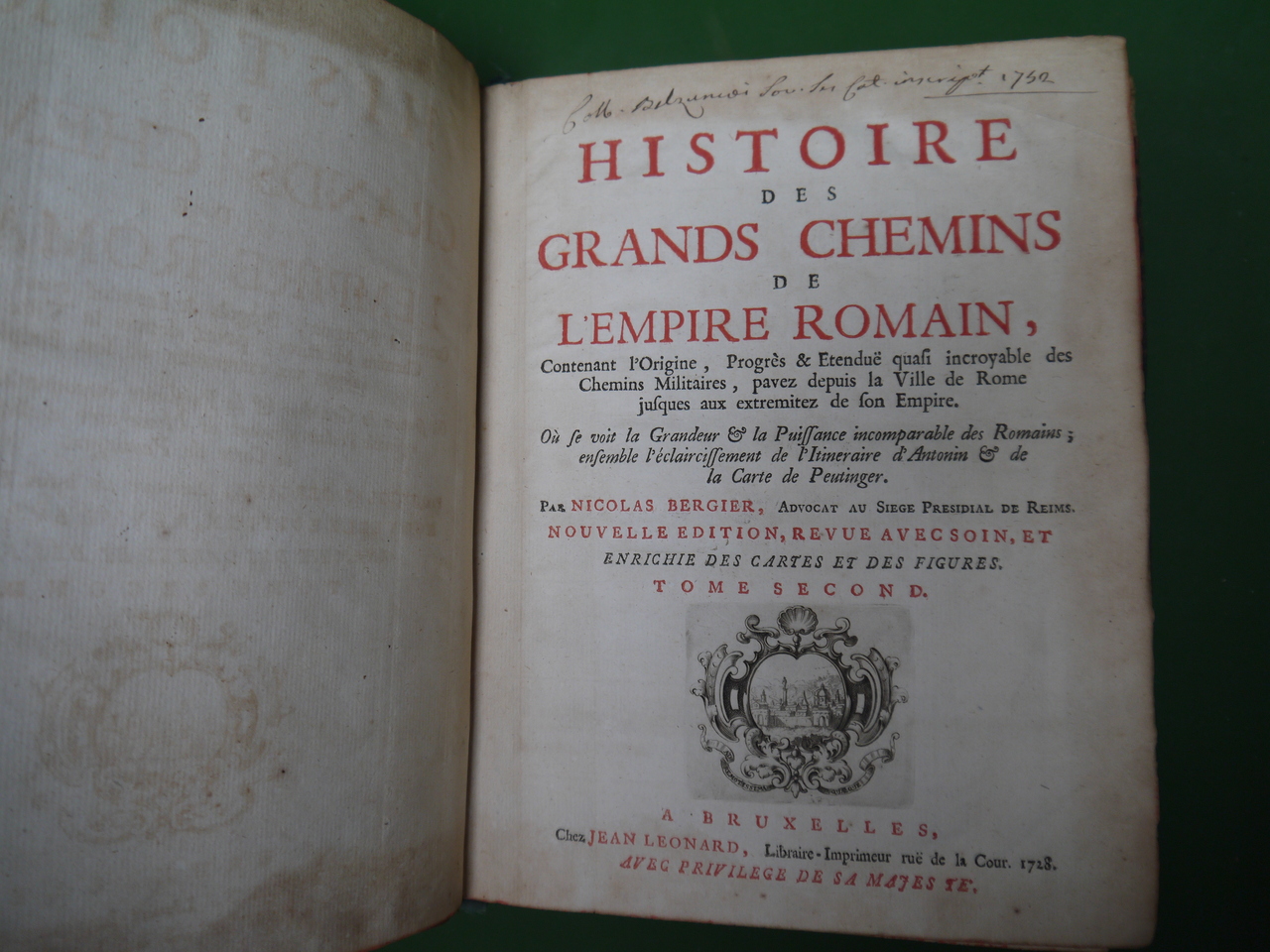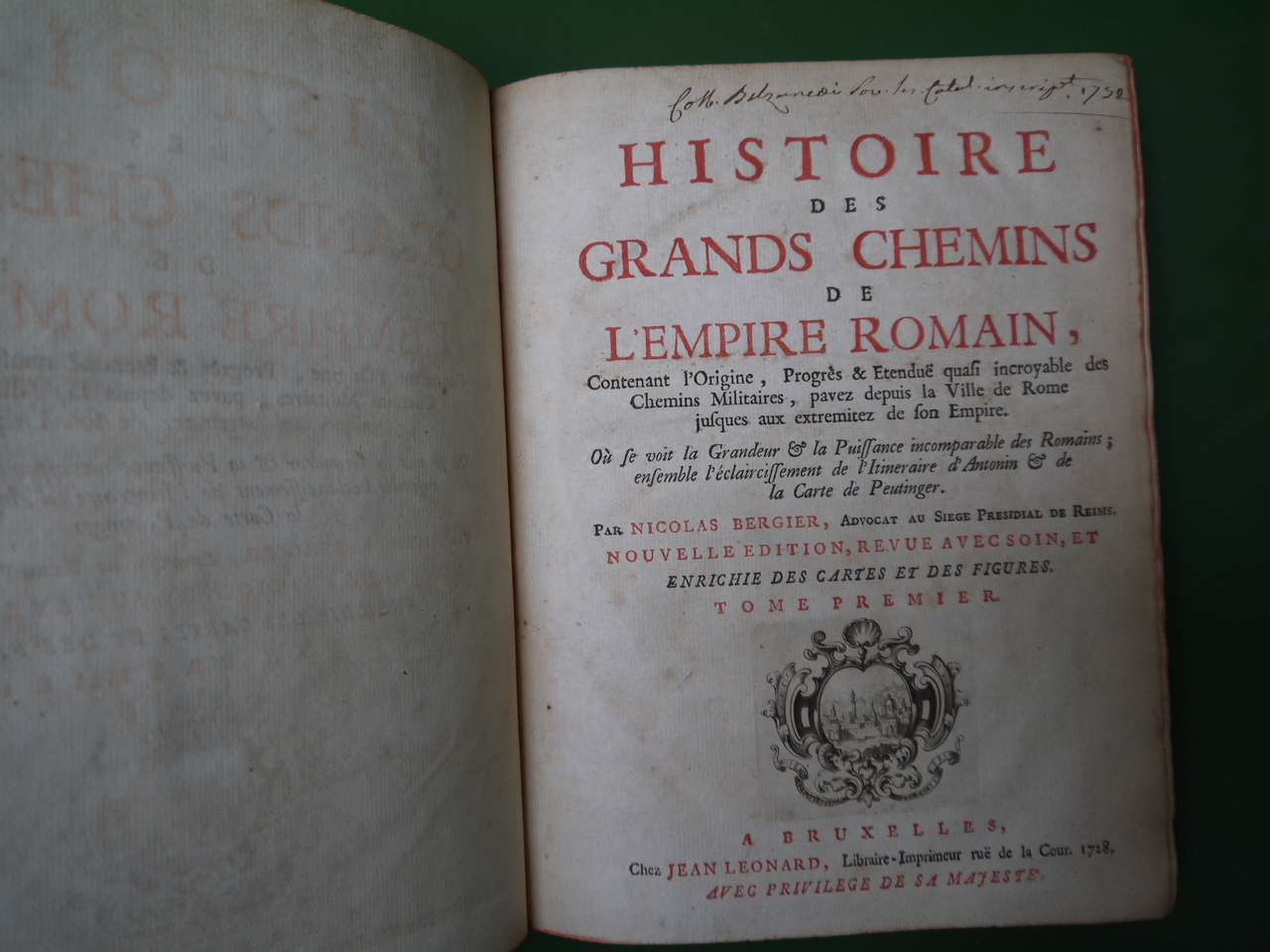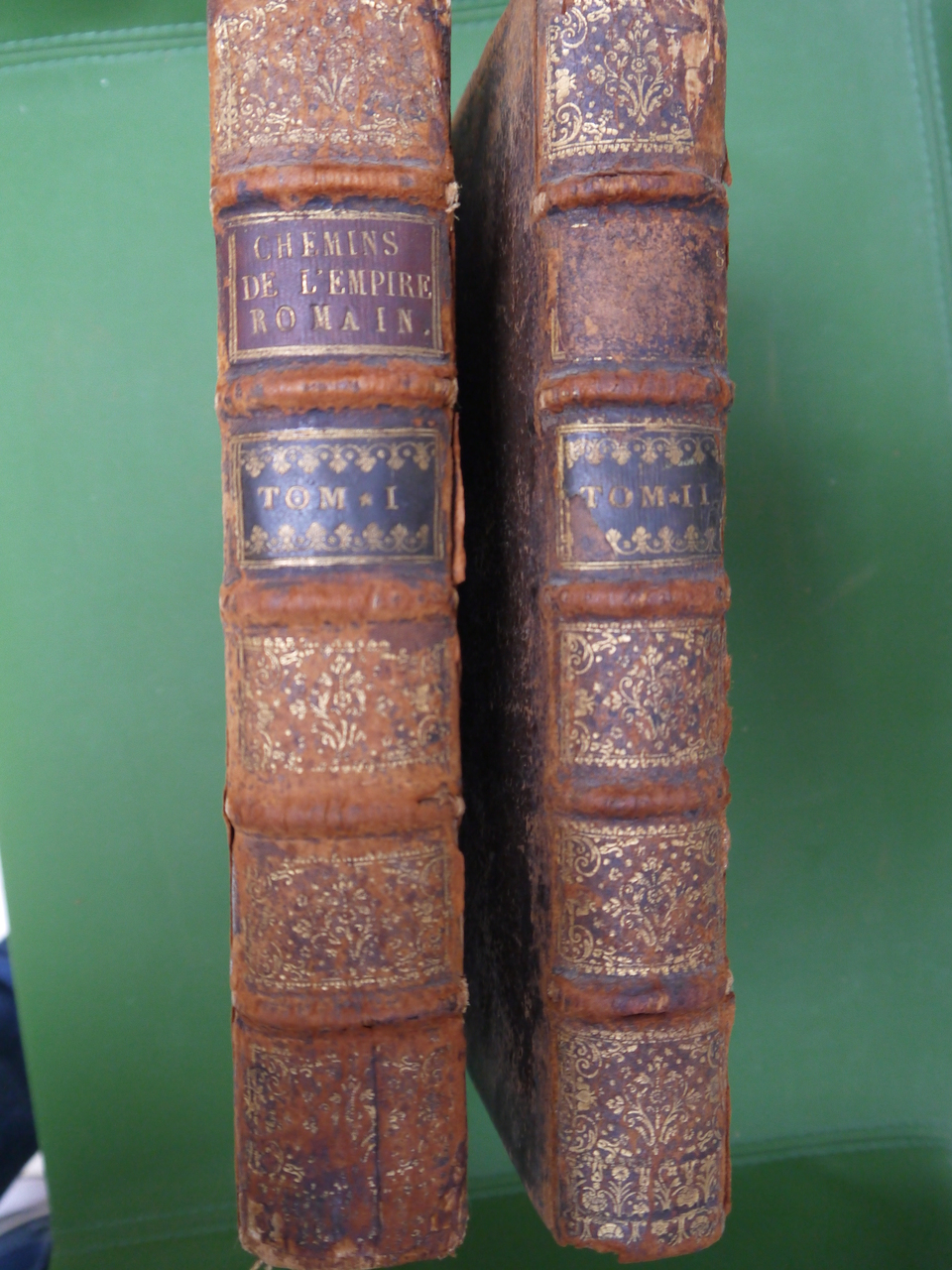 « … contenant l’origine, progrès et étendue qiasi incroyable des chemins militaires, pavés depuis la ville de Rome jusques aux extrémités de son Empire… Où se voit la grandeur & la puissance incomparable des Romains; ensemble l’éclaircissement de l’itinéraire d’Antonin et de la carte de Peutinger – Nouvelle édition revue avec soin et enrichie des cartes et des figures ». Imprimé à Bruxelles. Tome premier: « Livre premier: De la curiosité des Romains à paver les chemins publics toute l’estenduë de leur Empire. Livre second: Que le sujet de ce second livre, est de la Matiere & de la Forme des Grands Chemins de l’Empire. Livre troisième: De l’estenduë de l’Empire Romain. » Tome second: « Livre quatrième: Discours general sur la cause finale des Grands Chemins de l’Empire. Livre cinquième: Discours general de la beauté des Rues Militaires de la Ville de Rome, en ce qui régarde la largeur d’icelles. »