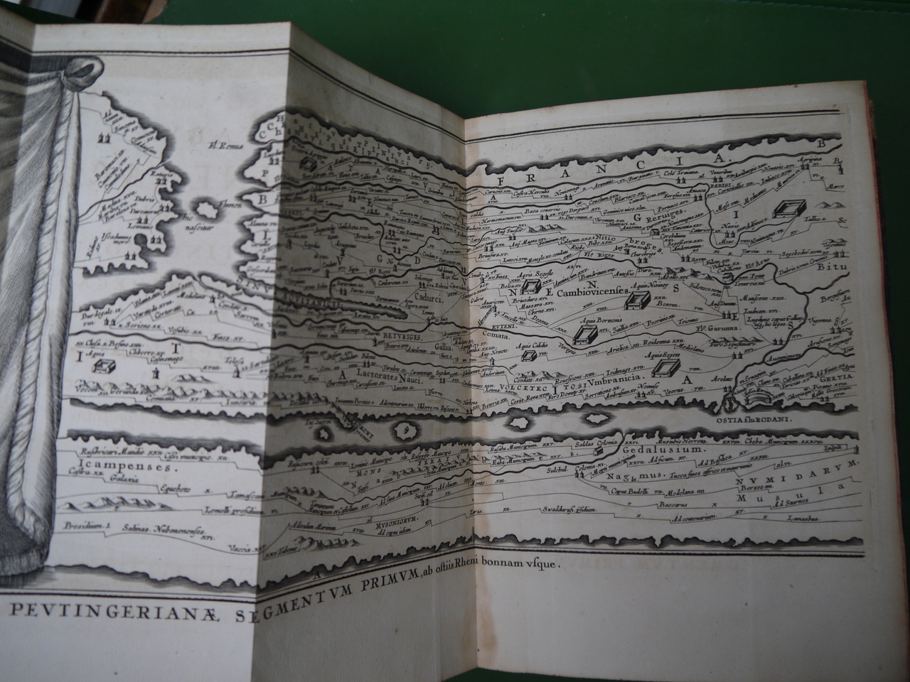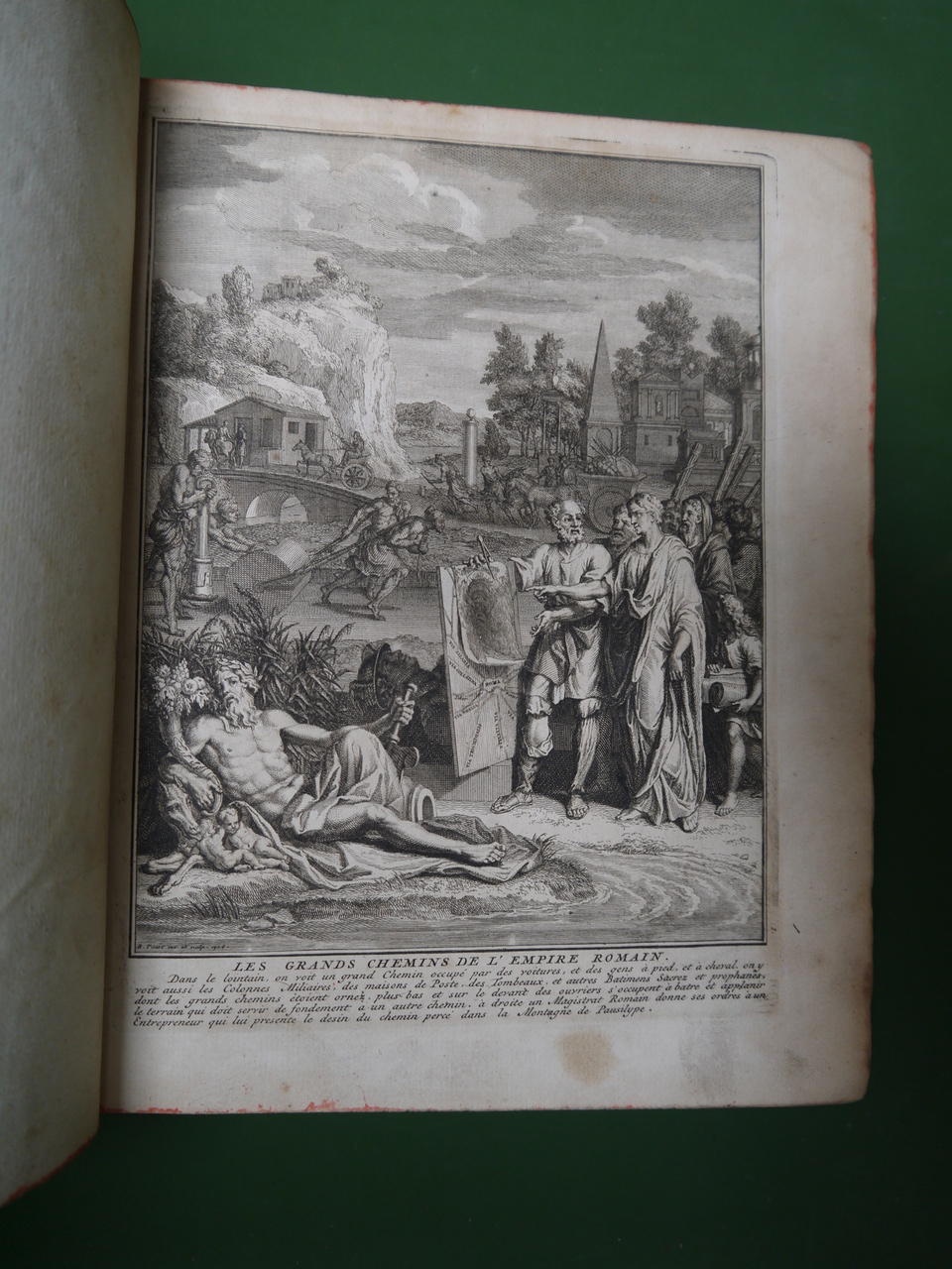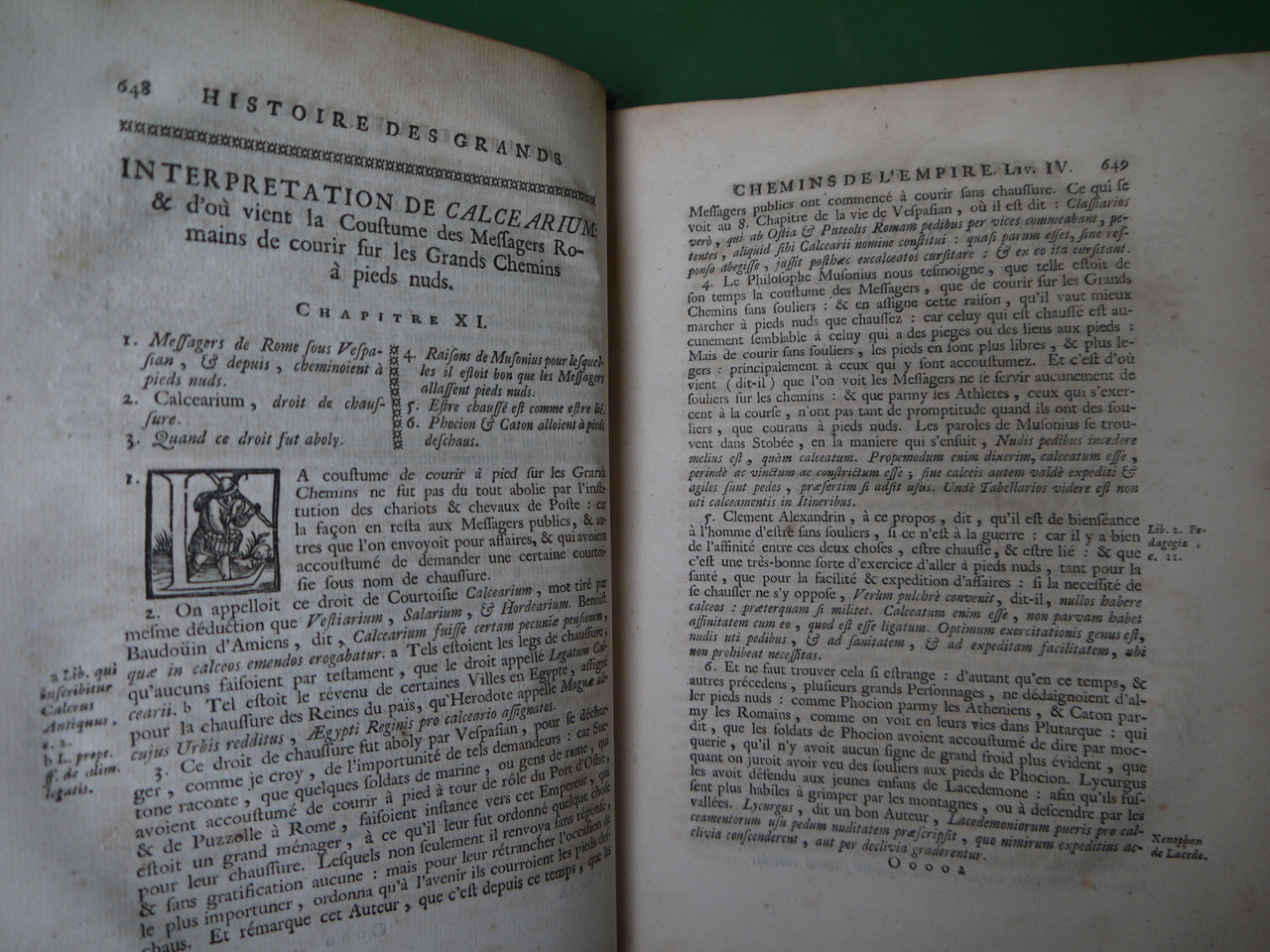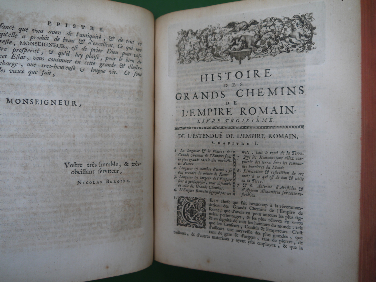 « … contenant l’origine, progrès et étendue qiasi incroyable des chemins militaires, pavés depuis la ville de Rome jusques aux extrémités de son Empire… Où se voit la grandeur & la puissance incomparable des Romains; ensemble l’éclaircissement de l’itinéraire d’Antonin et de la carte de Peutinger – Nouvelle édition revue avec soin et enrichie des cartes et des figures ». Imprimé à Bruxelles. Tome premier: « Livre premier: De la curiosité des Romains à paver les chemins publics toute l’estenduë de leur Empire. Livre second: Que le sujet de ce second livre, est de la Matiere & de la Forme des Grands Chemins de l’Empire. Livre troisième: De l’estenduë de l’Empire Romain. » Tome second: « Livre quatrième: Discours general sur la cause finale des Grands Chemins de l’Empire. Livre cinquième: Discours general de la beauté des Rues Militaires de la Ville de Rome, en ce qui régarde la largeur d’icelles. »