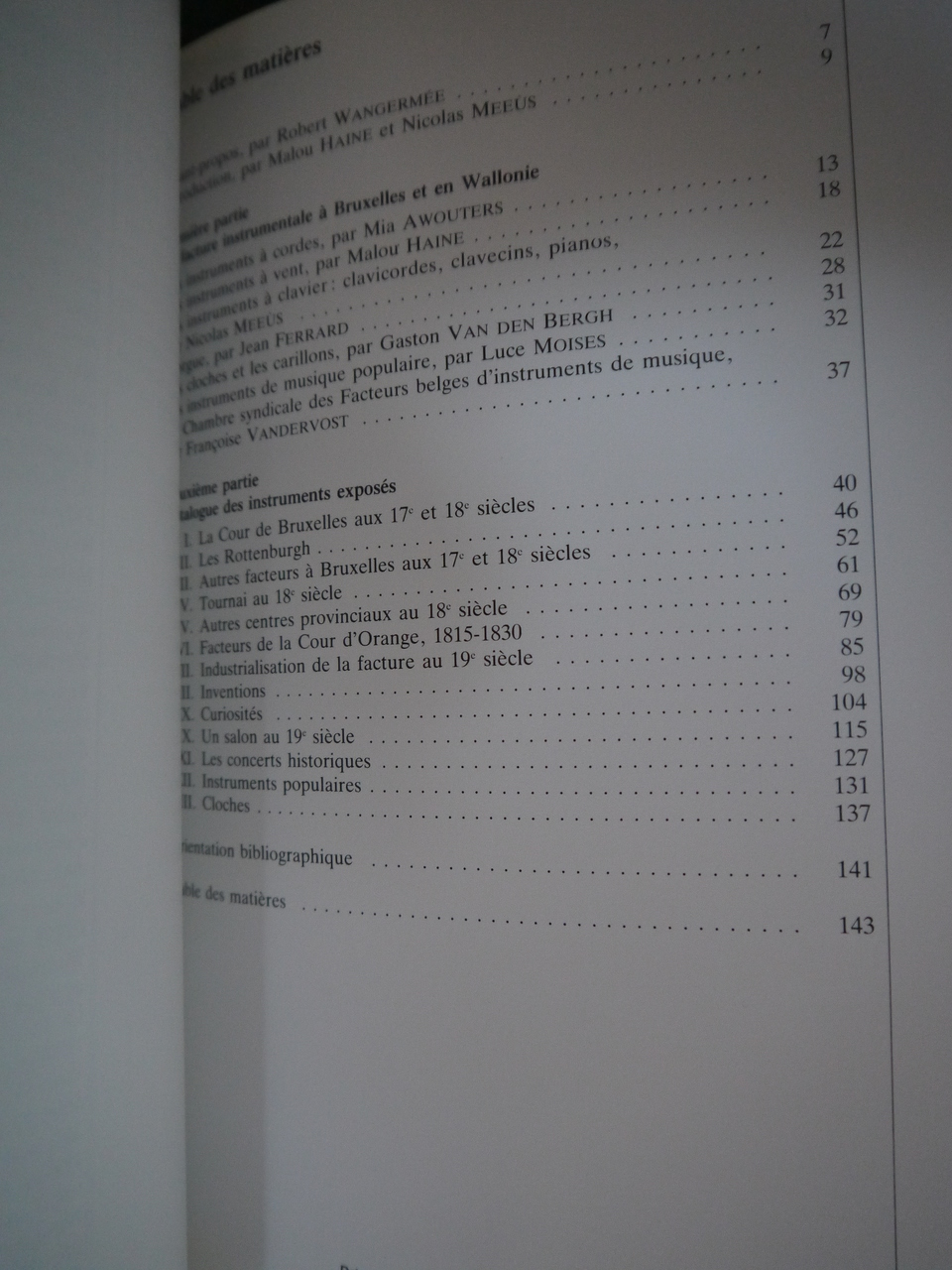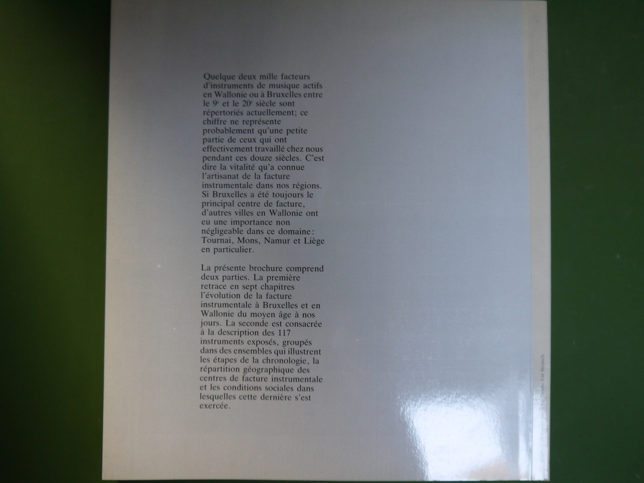 Catalogue d’une exposition présentée au Botanique. L’ouvrage est divisé en deux parties. La première partie retrace en sept chapitres l’évolution de la facture instrumentale à Bruxelles et en Wallonie du Moyen Âge à nos jours. La seconde partie est consacrée à la description de 117 instruments regroupés dans des ensembles qui illustrent les étapes de la chronologie, la répartition géographique des centres de facture instrumentale et les conditions sociales dans lesquelles cette dernière s’est exercée. Les instruments décrits proviennent en grande partie des collections du Musée des instruments de musique de Bruxelles.