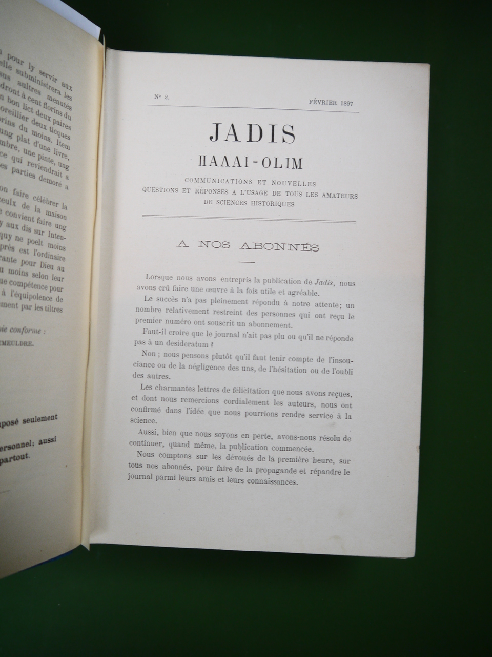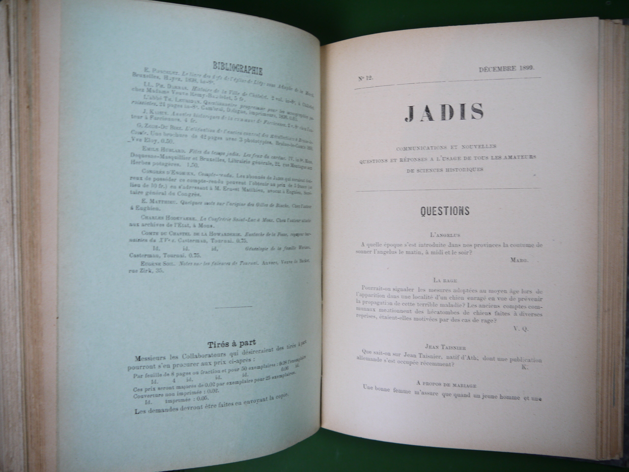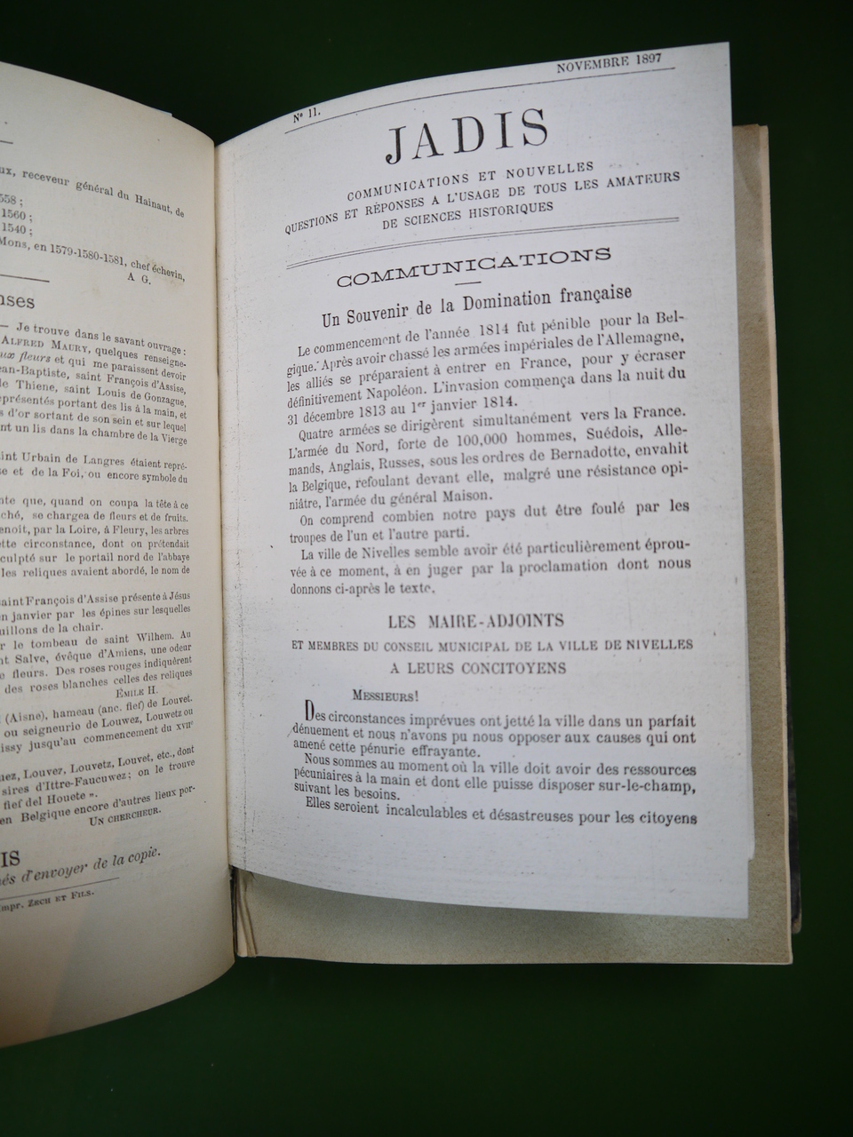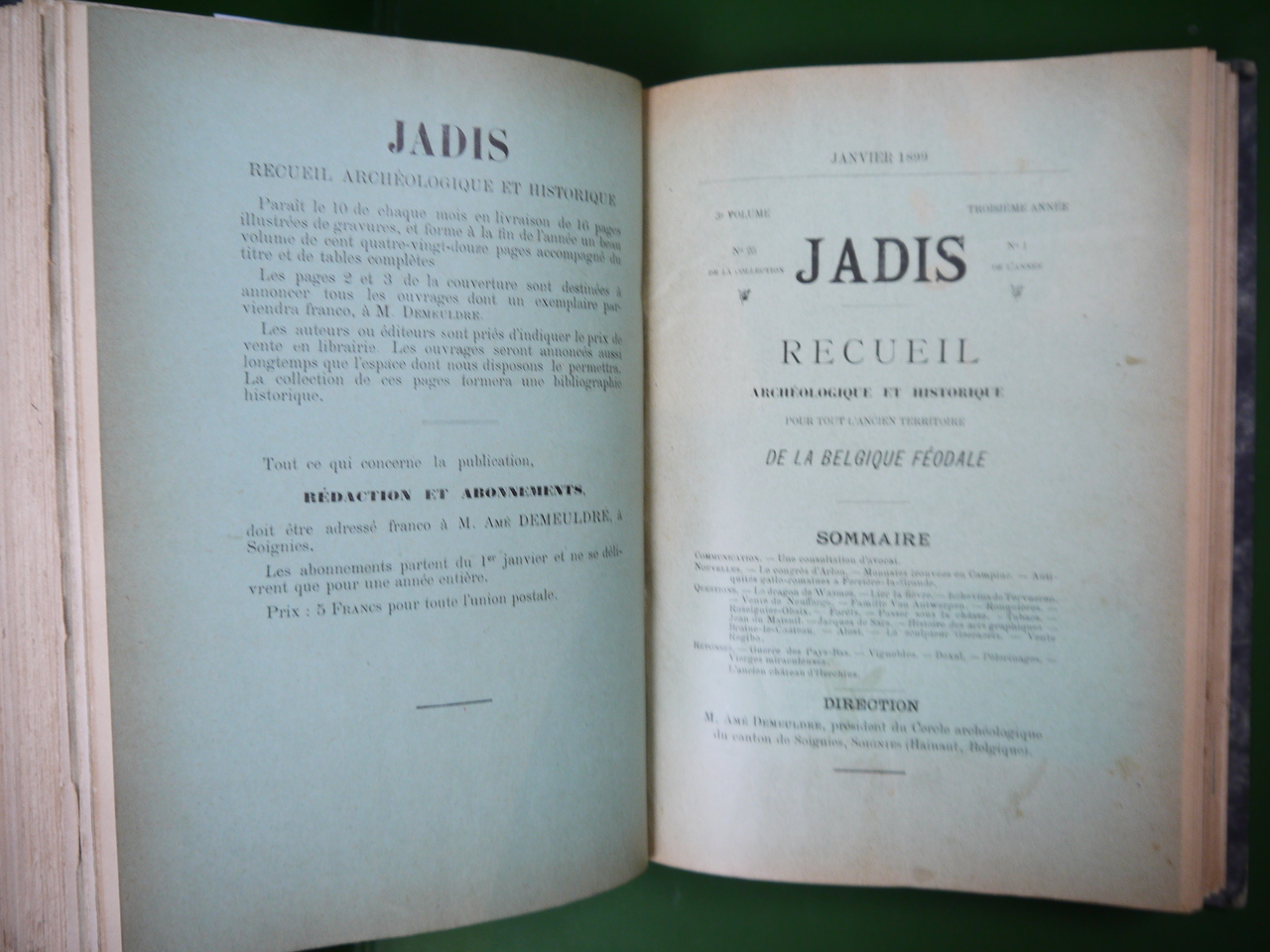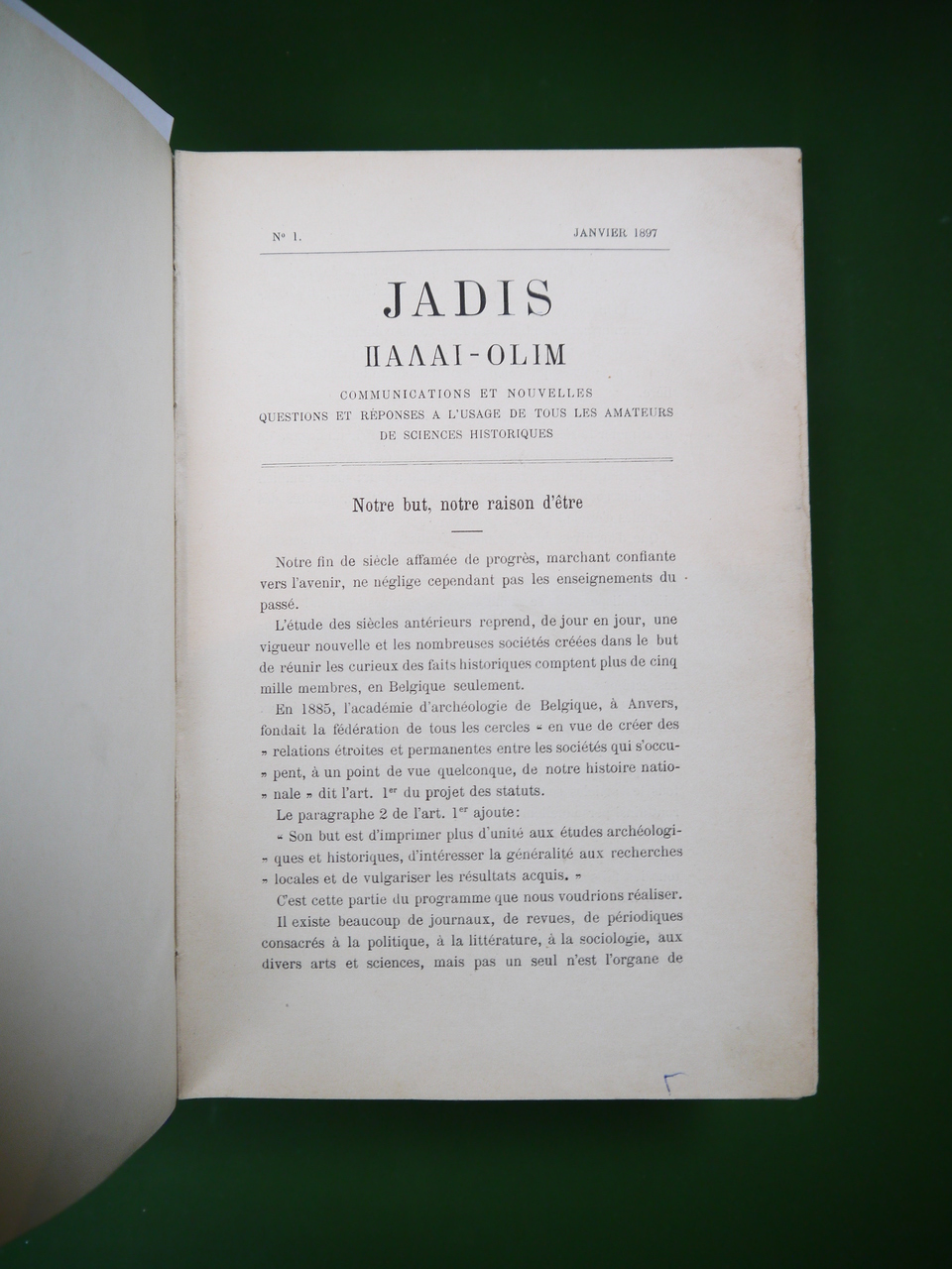 Les 48 premiers numéros de la revue d’histoire « Jadis », parus entre janvier 1897 et décembre 1900. Les numéros de novembre et décembre 1897 ainsi que d’octobre 1898 sont des photocopies. A noter également un numéro triple en août/septembre/octobre 1900. La revue Jadis, éditée à Soignies, avait comme sous-titre « Recueil archéologique et historique pour tout l’ancien territoire de la Belgique féodale ». Le contenu se déclinait en « Communications et nouvelles – Questions et réponses à l’usage de tous les amateurs de sciences historiques ».