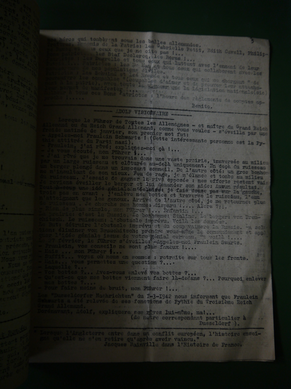 Le premier numéro d’un « organe mensuel d’optimisme » daté du 21 mars 1942, « offensive de printemps ». 7 pages, dont les deux dernières sont difficilement lisibles vu la qualité médiocre de la reproduction.