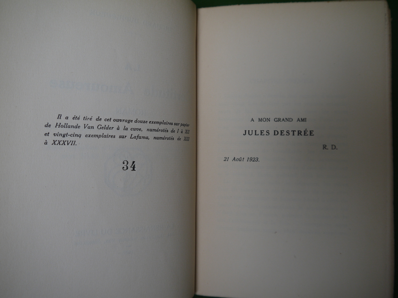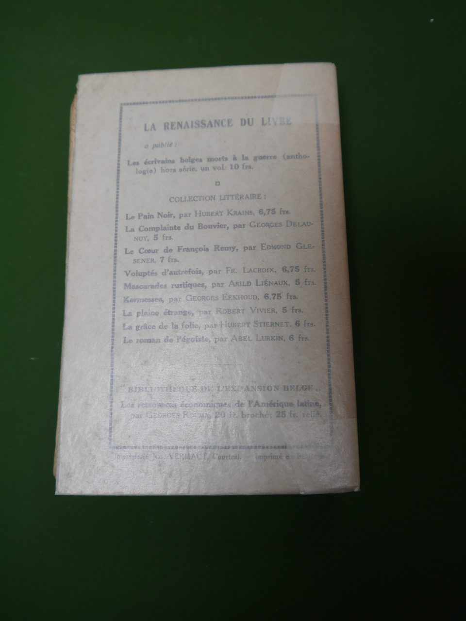 Un des 25 exemplaires sur Lafuma. L’auteur de ce roman fut longtemps le bras droit et le partenaire de Jules Destrée dans leurs activités politiques et artistiques.