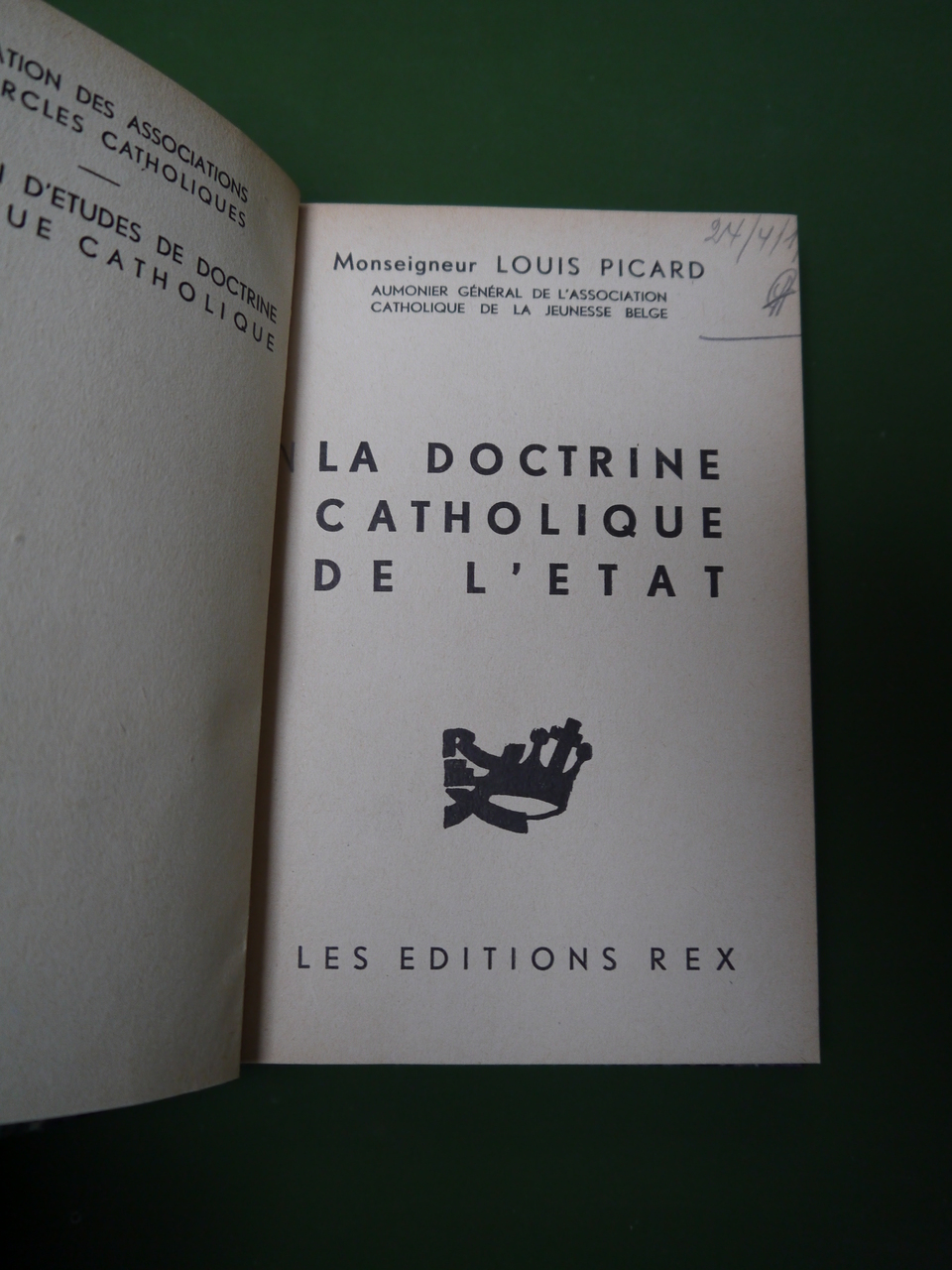 Quelques crayonnages au fil du texte, dont cette note manuscrite en page de garde: « les références à des événements ne vont jamais au-delà de 1933 ». Monseigneur Picard était « aumônier général de l’association catholique de la jeunesse belge ».