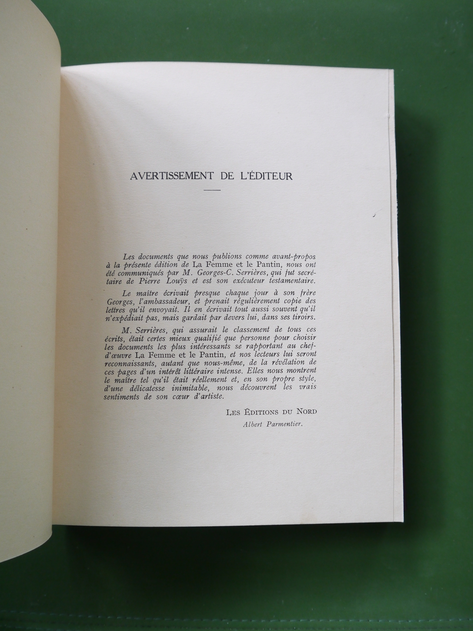 Illustrations de Philippe Swyncop. Comprend des documents inédits fournis par l’exécuteur testamentaire de Louÿs, Georges-C. Serrières. Tirage de 3000.
