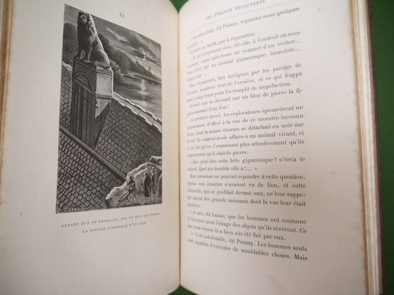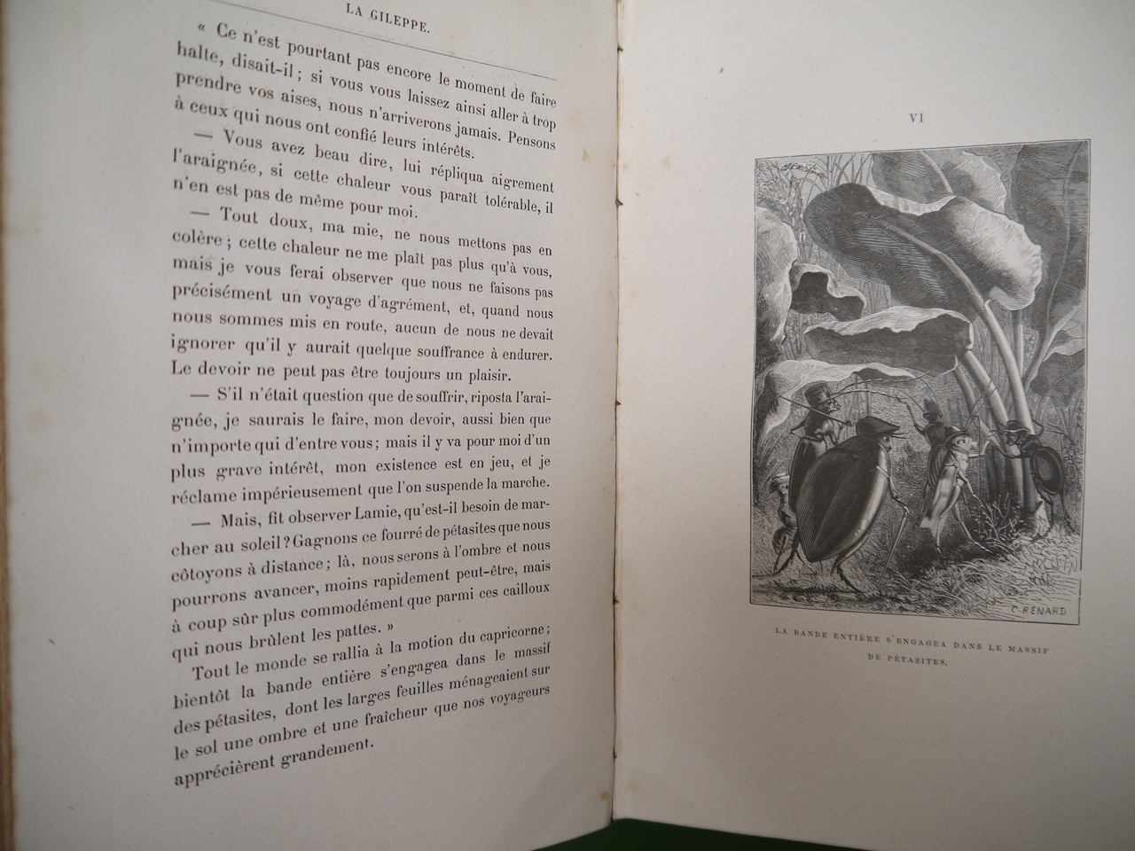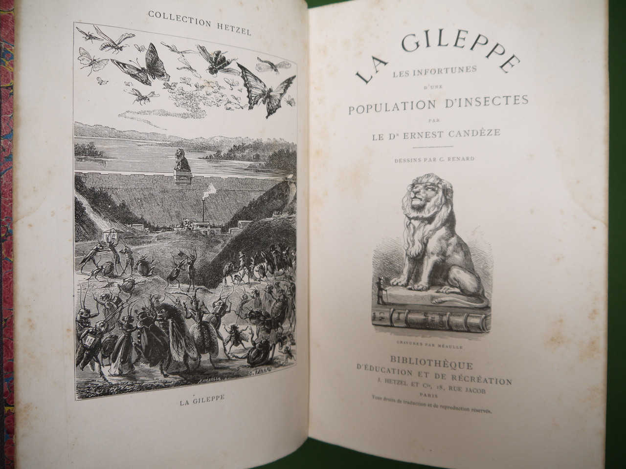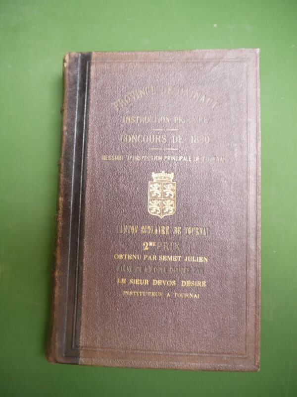 Texte du premier plat: « Province de Hainaut, instruction primaire, concours de 1880, ressort d’inspection principale de Tournai – Canton scolaire de Tournai, 2me prix obtenu par Semet Julien, élève de l’école dirigée par le sieur Devos Désiré, instituteur à Tournai ». Quant au livre, il est l’oeuvre d’Ernest Charles Auguste Candèze, un médecin et un entomologiste amateur, né en à Liège et mort en à Glain.