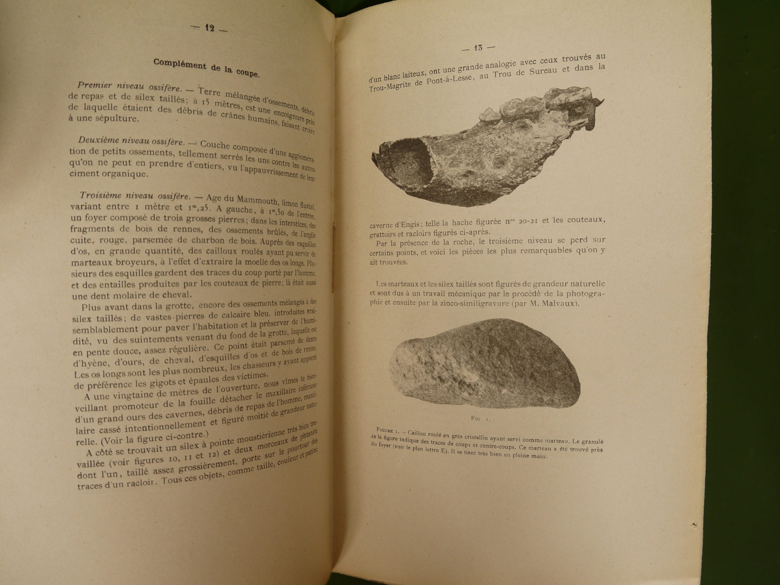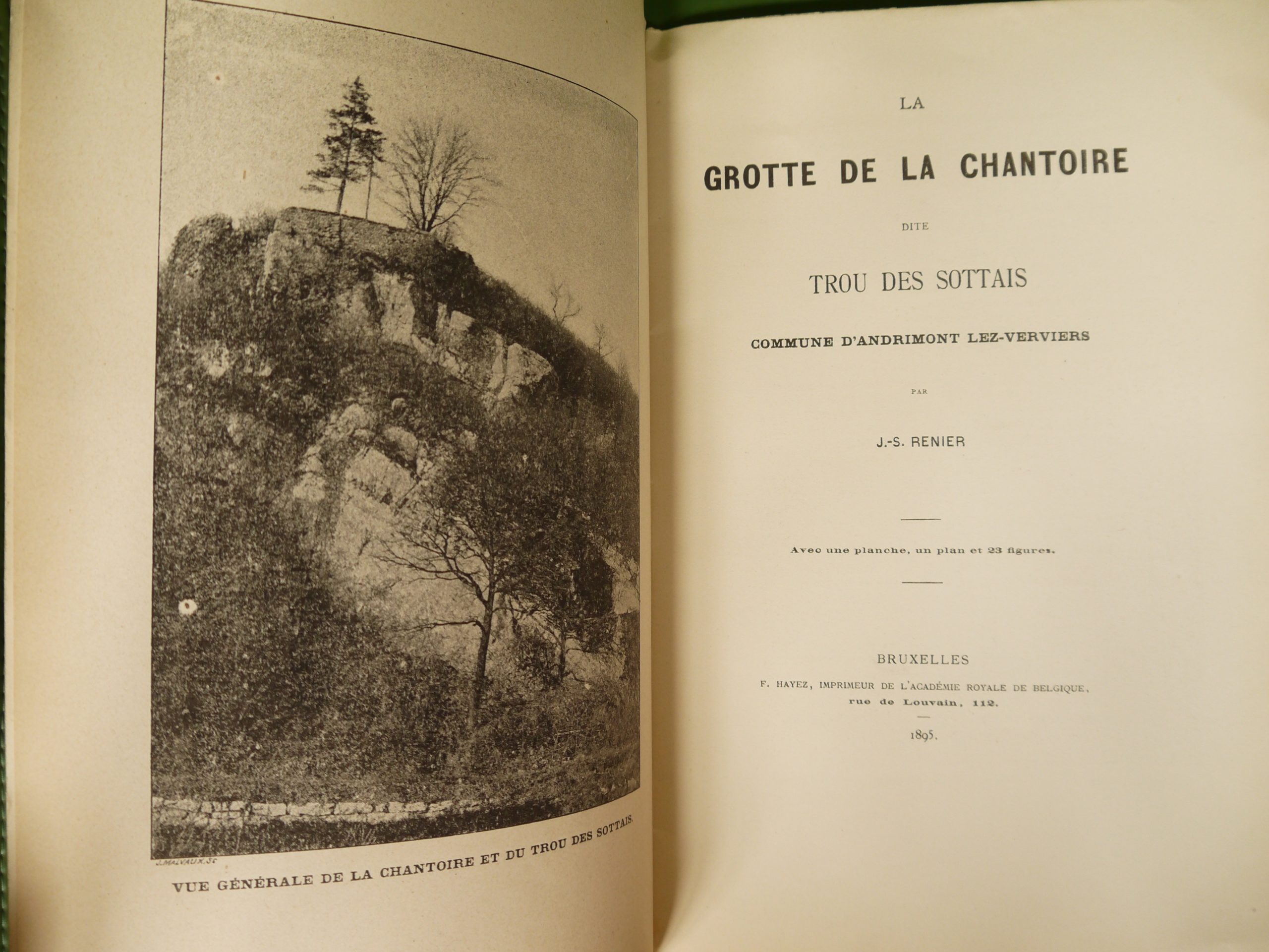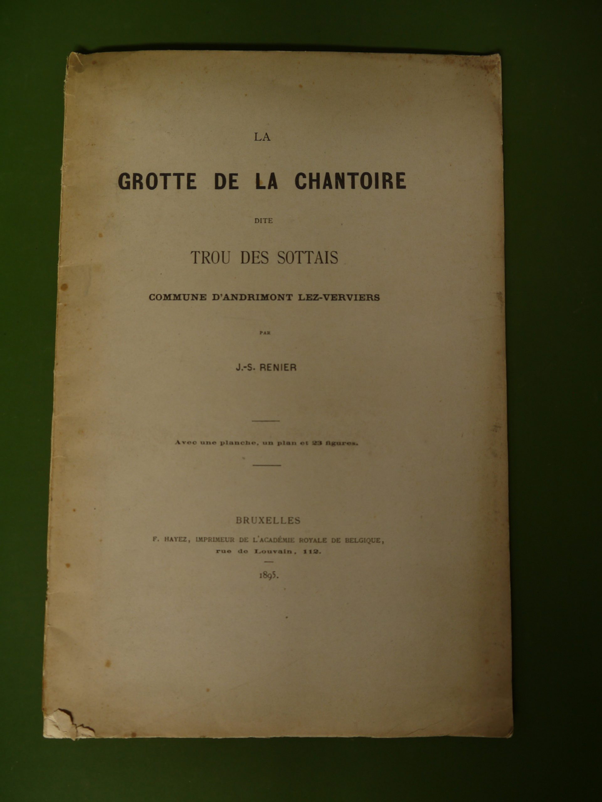 Cette grotte où furent trouvés de nombreux ossements et silex se trouve à Andrimont lez-Verviers, comme on disait à l’époque. Plaquette de 24 pages non-coupée, impossible de certifier que le plan mentionné en couverture est bien présent…