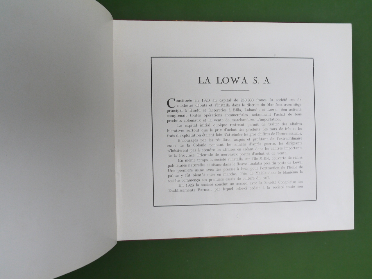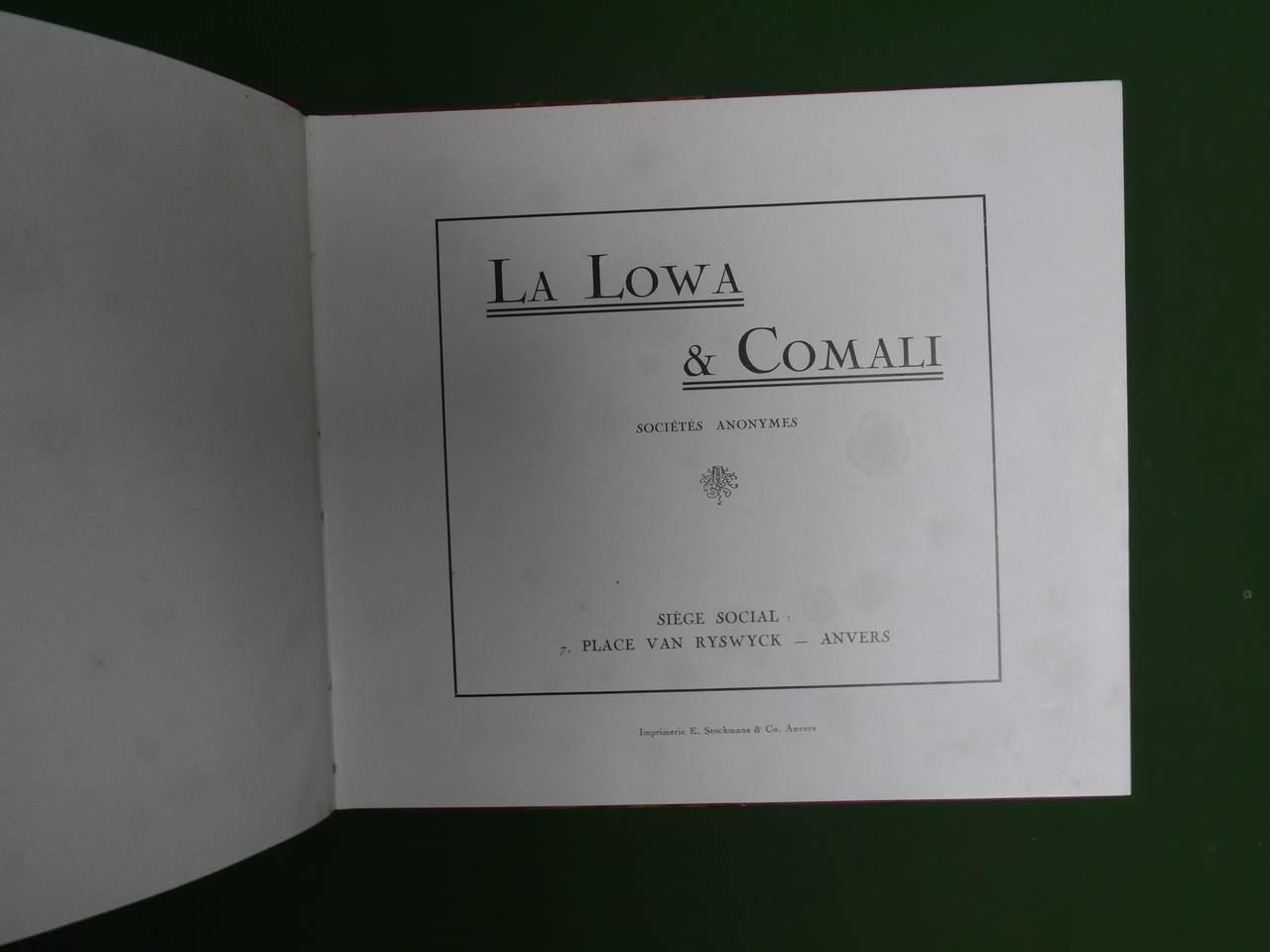 Présentation de deux sociétés congolaises aux activités diverses, de l’extraction d’huile de palme à la vente d’ivoire en passant par l’eau gazeuse… Une succursale se trouvait place van Ryswyck, à Antwerpen. Déchirure d’une page avec manque en fin d’ouvrage (sans doute une publicité).
